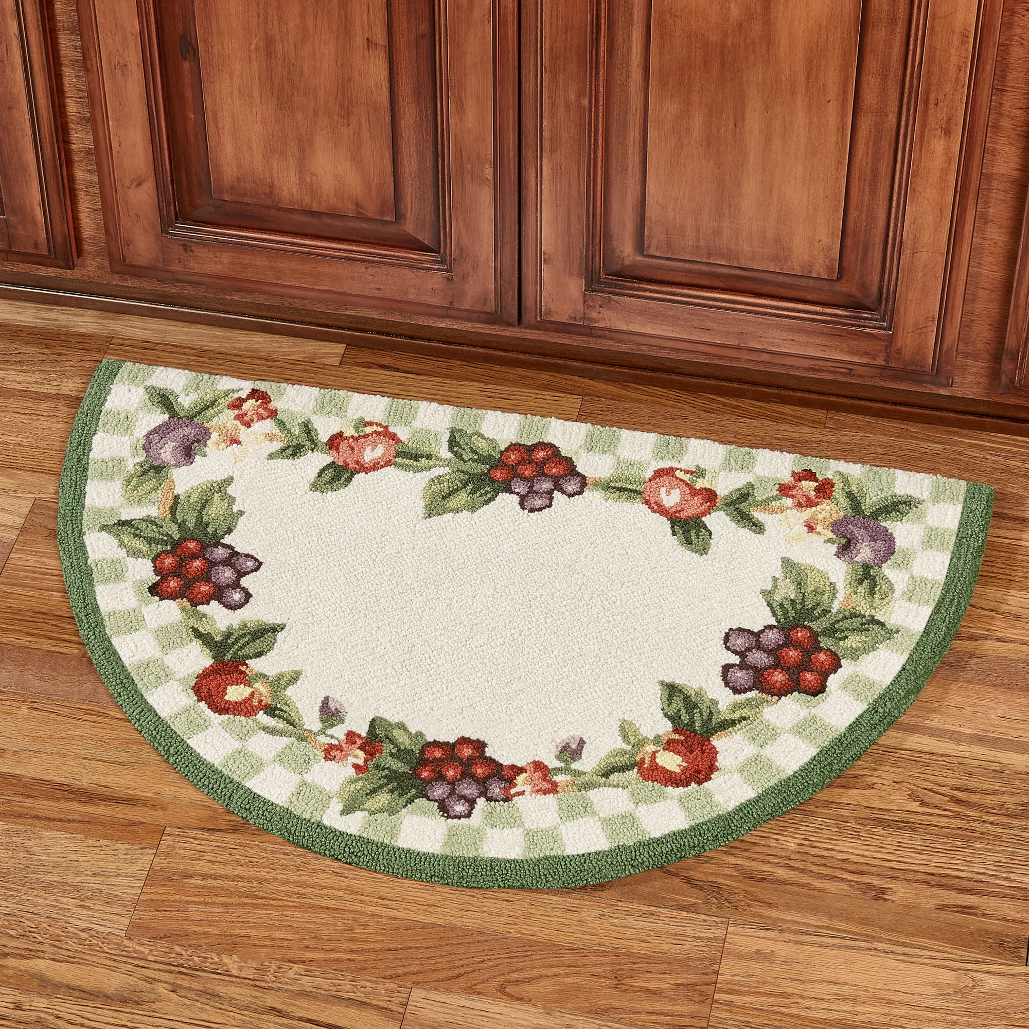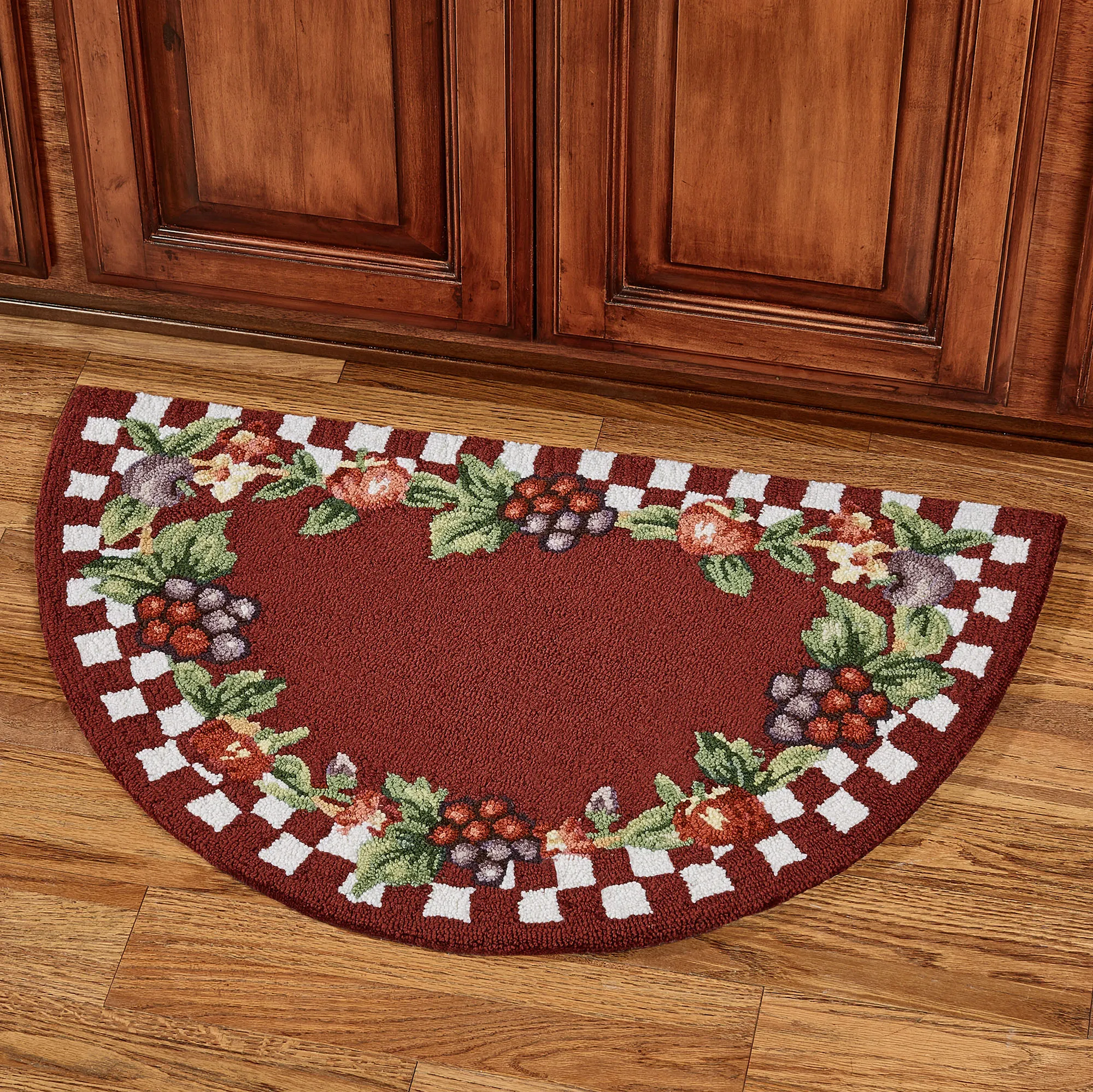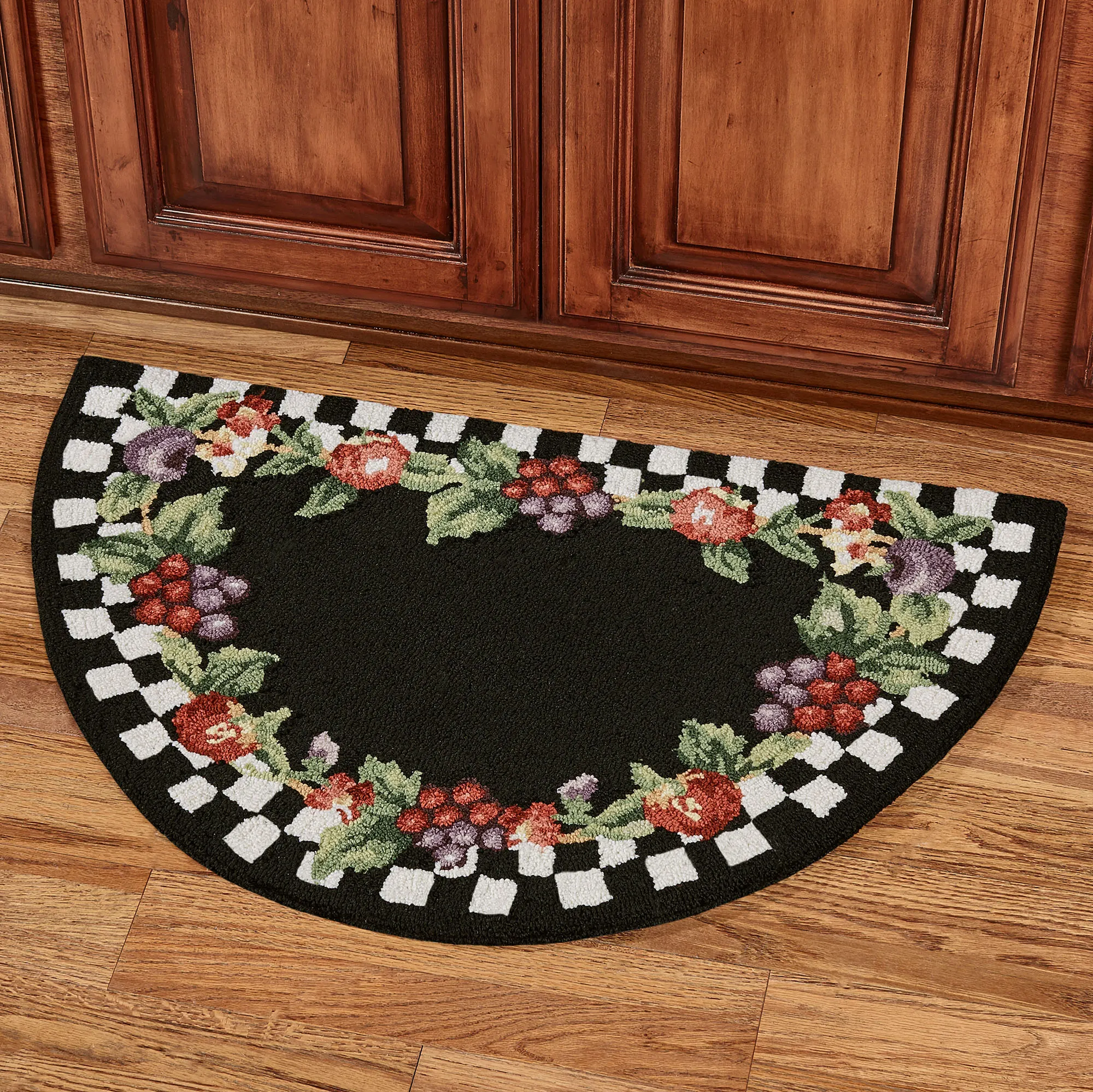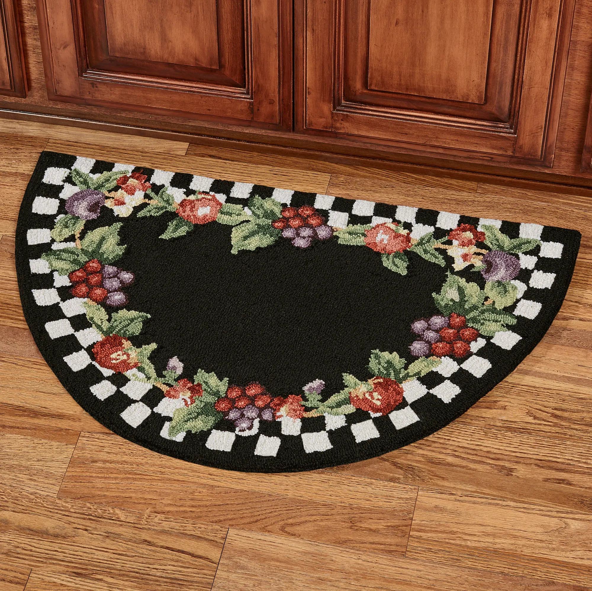 • Hand-hooked rug features fruit and a check pattern