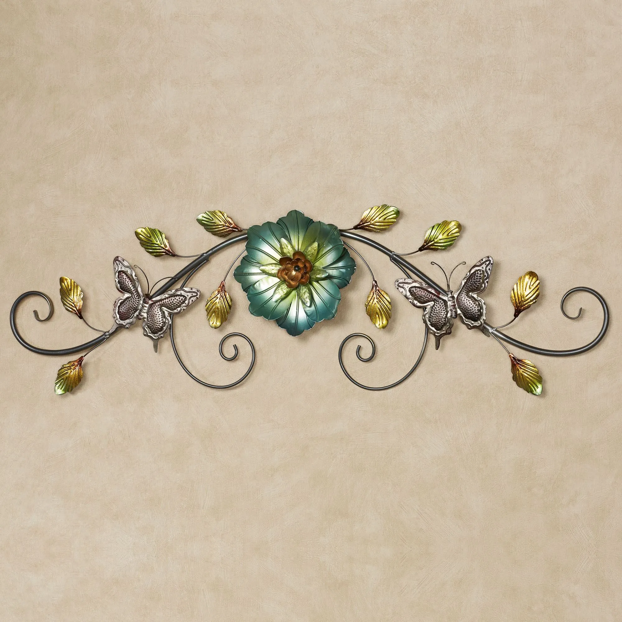 The Sophie Scrolling Floral Wall Decor marvels with nature's sweet grace. In an openwork design, the metal wall art features a graphite scrollwork embellished with a magnificent blue-green jewel-toned layered flower and golden leaves accented with green and bronze. Two butterflies flit about in light gray, lavender, and crimson hues. Measures 40"Wx1.5"Dx16"H.