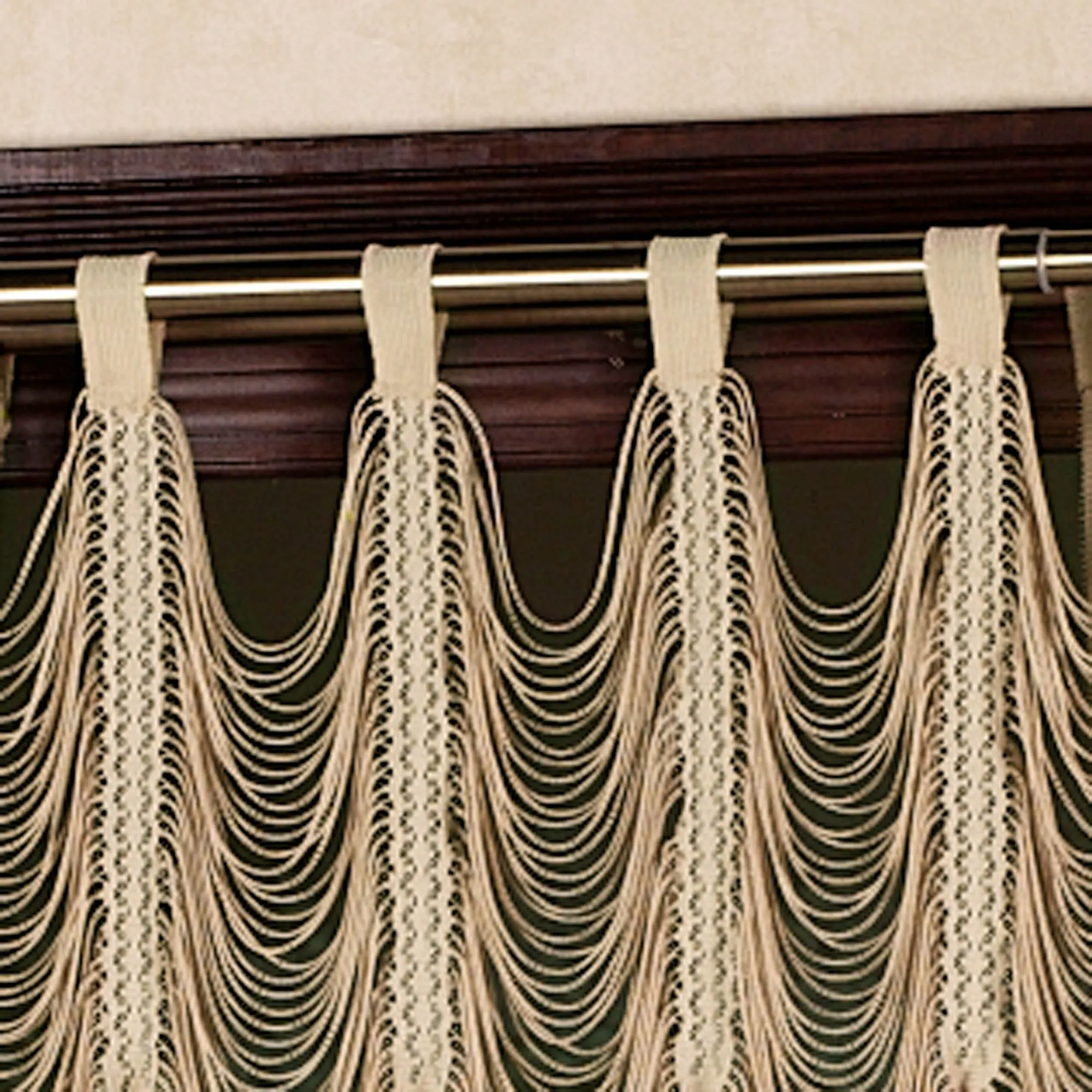 The delicate Sorrento II Gold String Lace Curtain Panel will bring an ethereal beauty to any room. The lofty, polyester jacquard lace hangs from 2.25" tabs and features horizontal strings that sway gently between the 1" lace banding, creating the effect of an Austrian panel. The decorative, scalloped bottom edges are hand-cut. Curtain panels are sold individually; each is 54"W. Hand wash. Imported. Sorry, valances are no longer available.