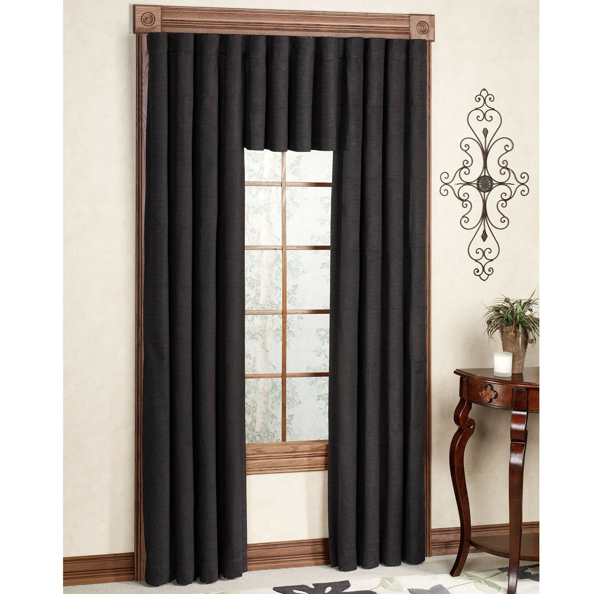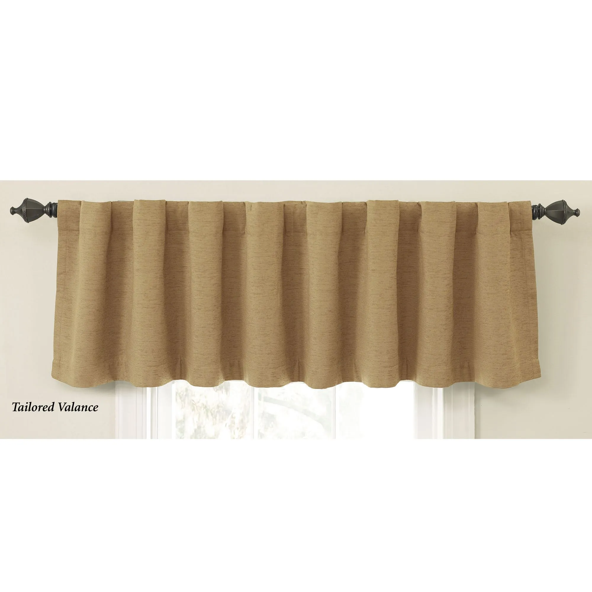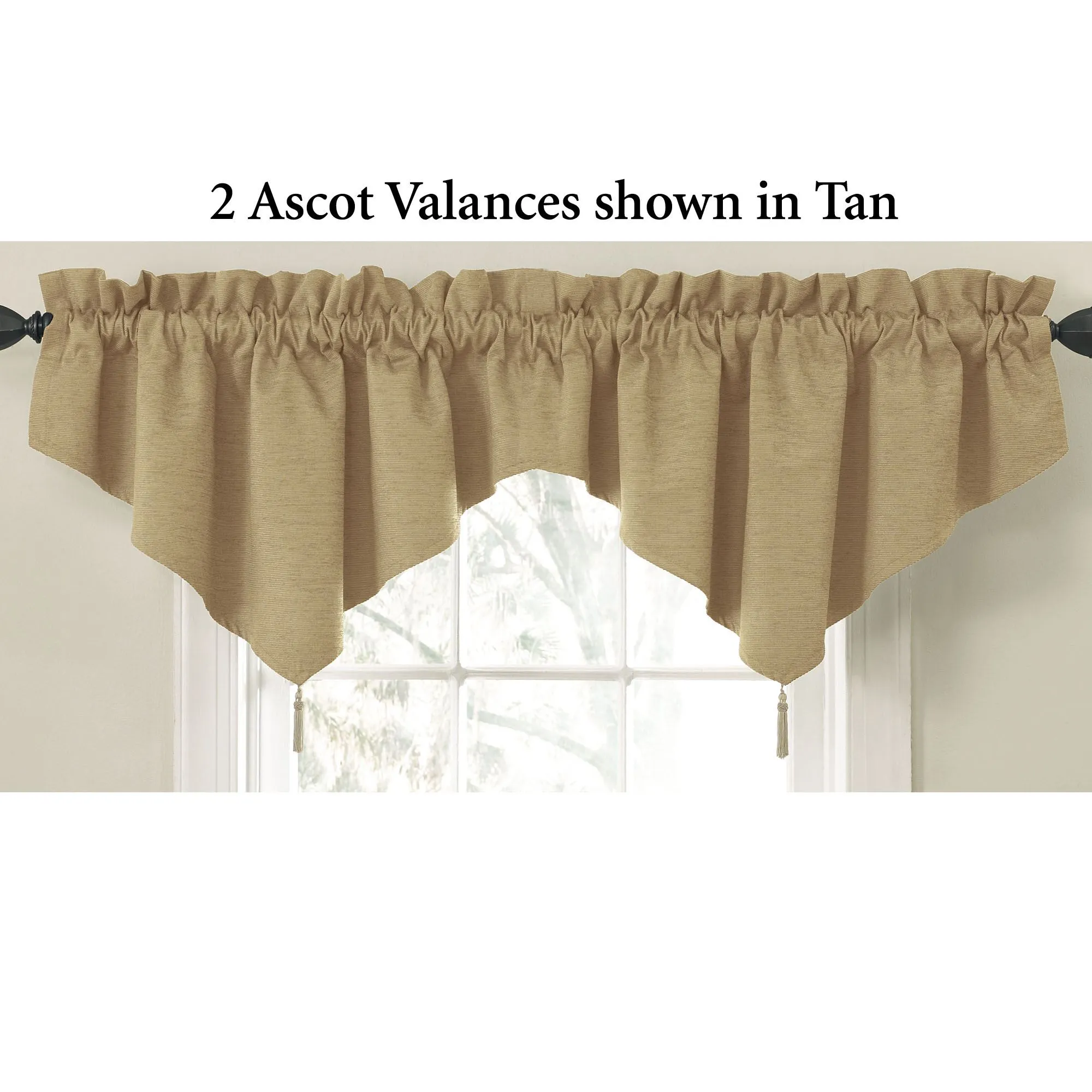 Specify Curtain Panel, Back Tab Valance, or Ascot Valance. Curtain Panel and Back Tab Valance have a 3" rod pocket and 3" back tabs for hanging options. Each Ascot Valance has a tassel accent and a 3" rod pocket.