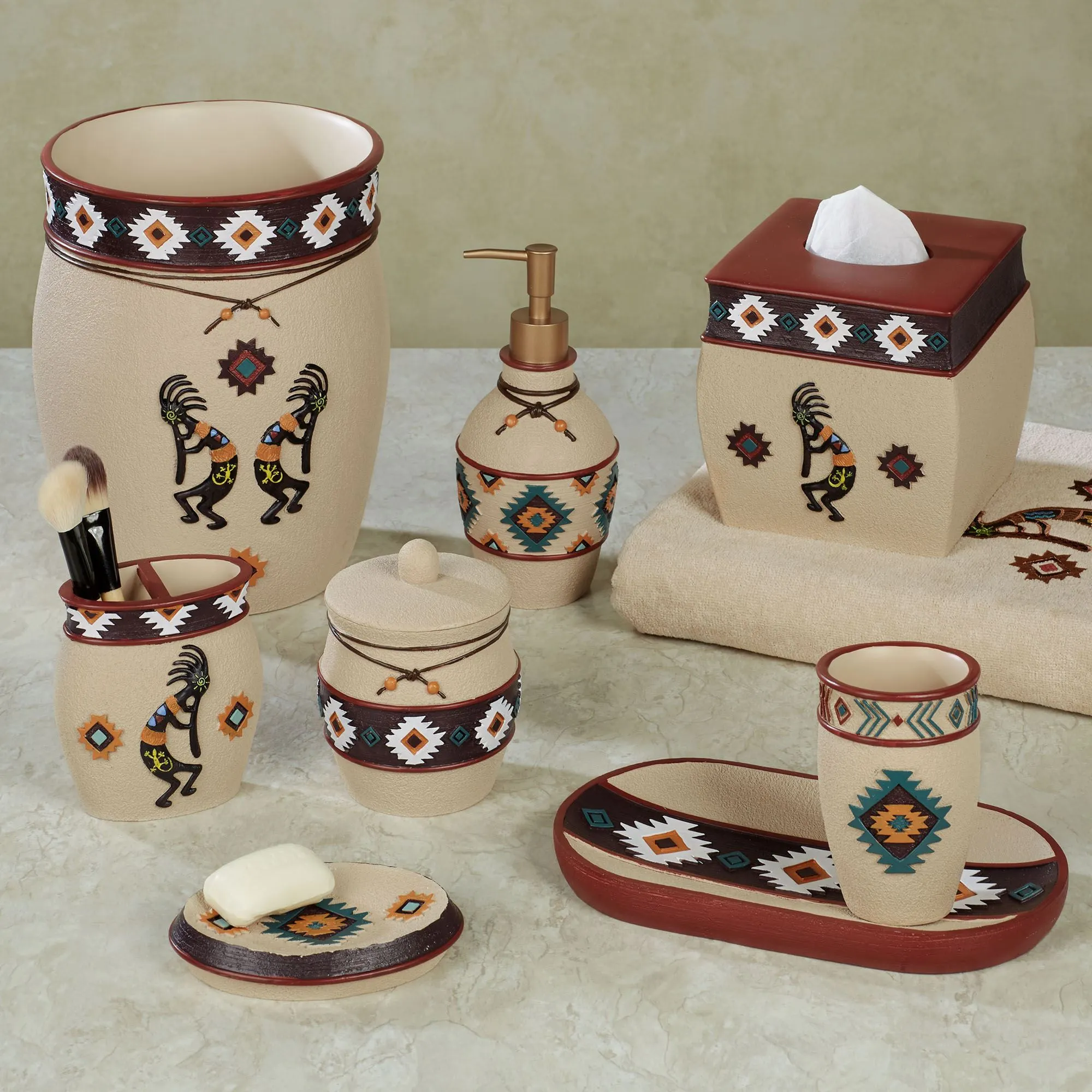 Join the kokopellis in a Southwest Dance and charm your bath space with these bath accessories. Detailed with dimensional motifs, each textured wheat resin bath accent features Southwest-inspired diamonds and geometrics. Handpainted hues of wheat, red, white, dark teal, orange, yellow, black, and espresso add a classic richness. The Wastebasket, Brush Holder, and Tissue Cover also feature a kokopelli design alongside the geometrics. The Brush Holder can be used to hold your toothbrushes or makeup brushes. Specify Covered Jar, Tissue Cover, or Tray.