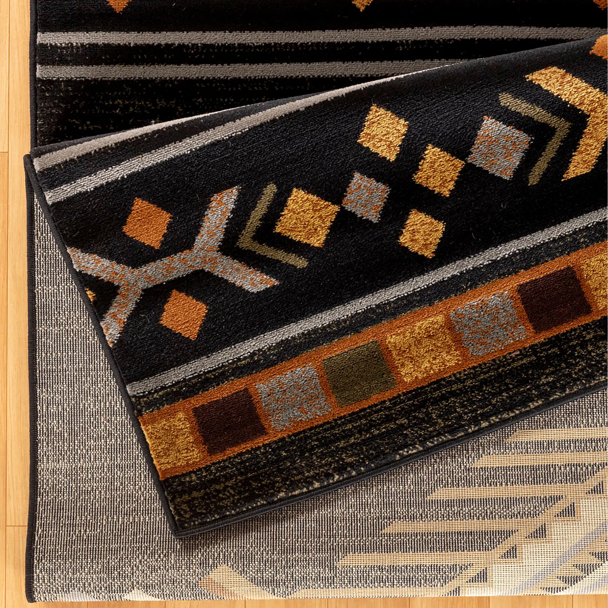Diamond designs and geometrics add tribal style to the Southwest Fever Black Rug. The polypropylene area rug, .39" thick, has unique motifs with a distressed appearance. The black coloration includes shades of cream, green, gray, brown, and tan. Backing is jute. We recommend professional cleaning by a rug cleaner. Imported.