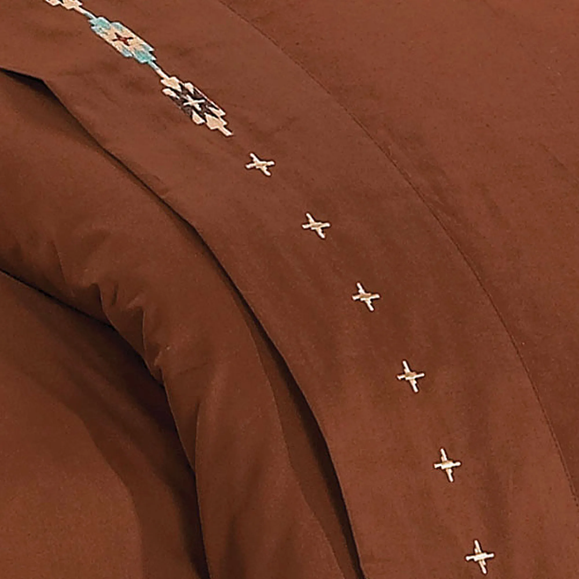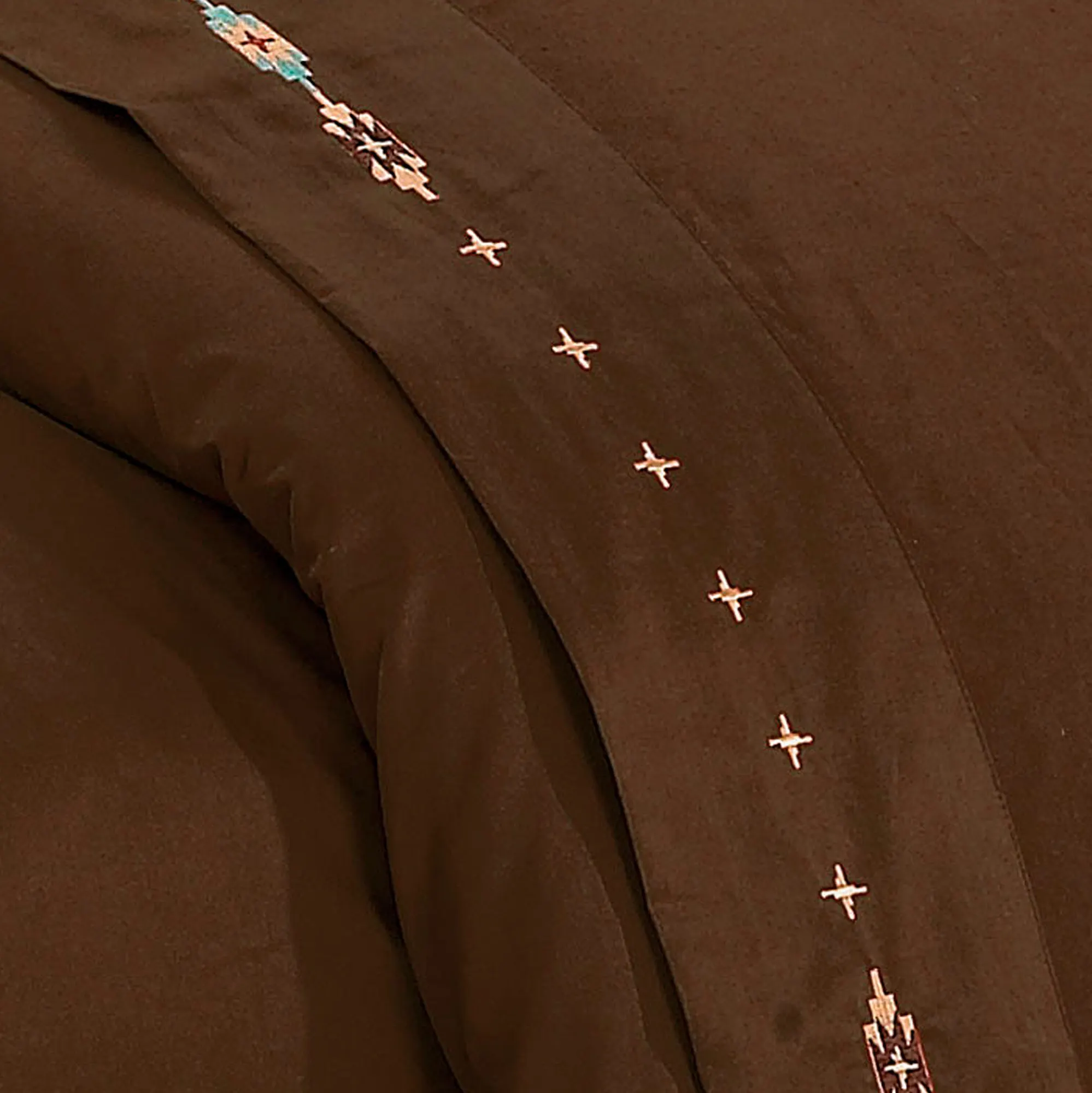 Complete the theme in your bedroom with the Southwest Sheet Set. Solid color sheets are 350 T.C., 100% cotton. Flat sheet and pillowcase have an attached hem with embroidered Southwest design in chocolate, tan, and turquoise. Pillowcase has a French cuff to hold your pillow in. Fitted sheet has all-around elastic and 18" deep pockets that will fit a mattress up to 20" deep. The Twin sheet set includes a 66"x96" flat sheet, a 39"x76" fitted sheet, and a 20"x30" pillowcase. Washable. Imported.