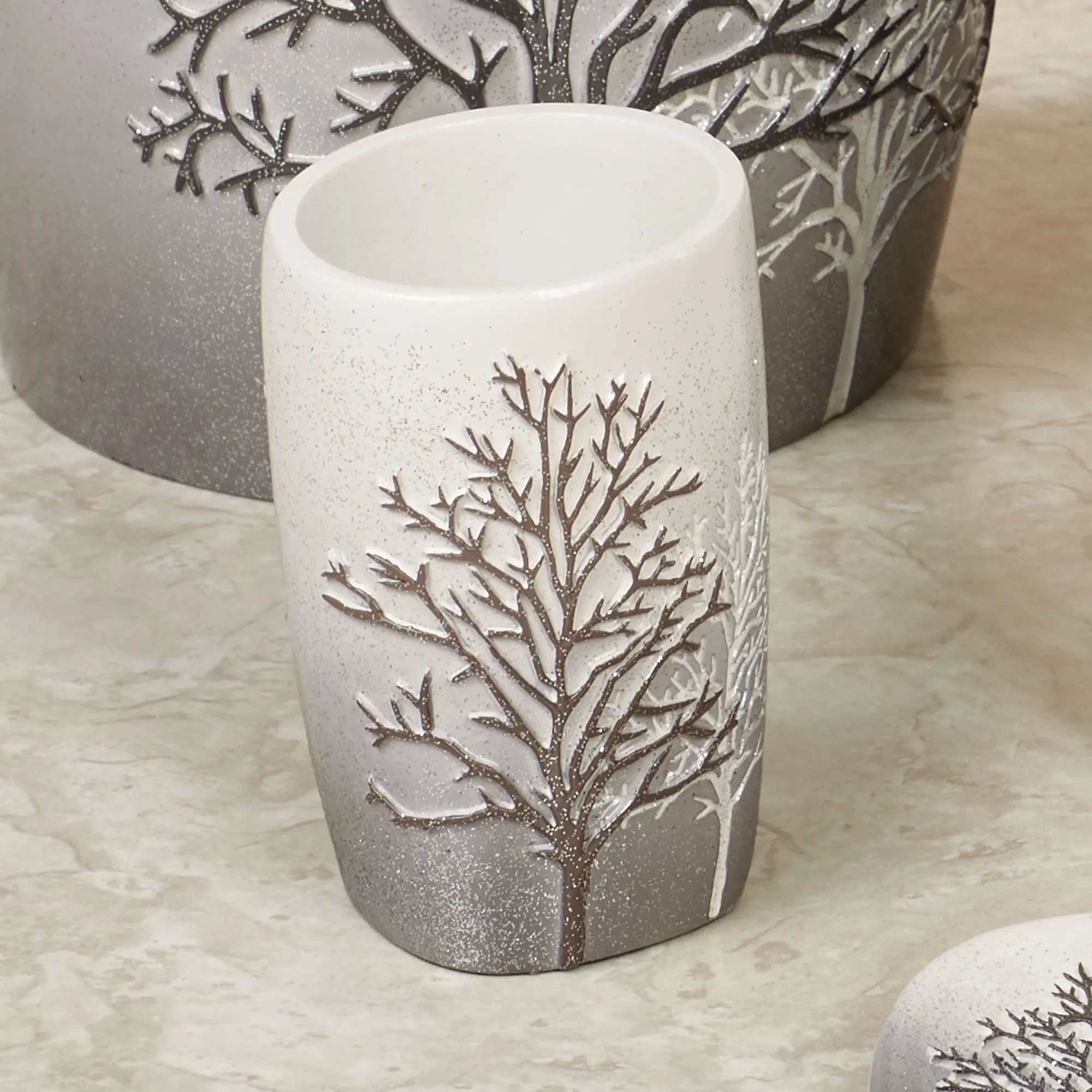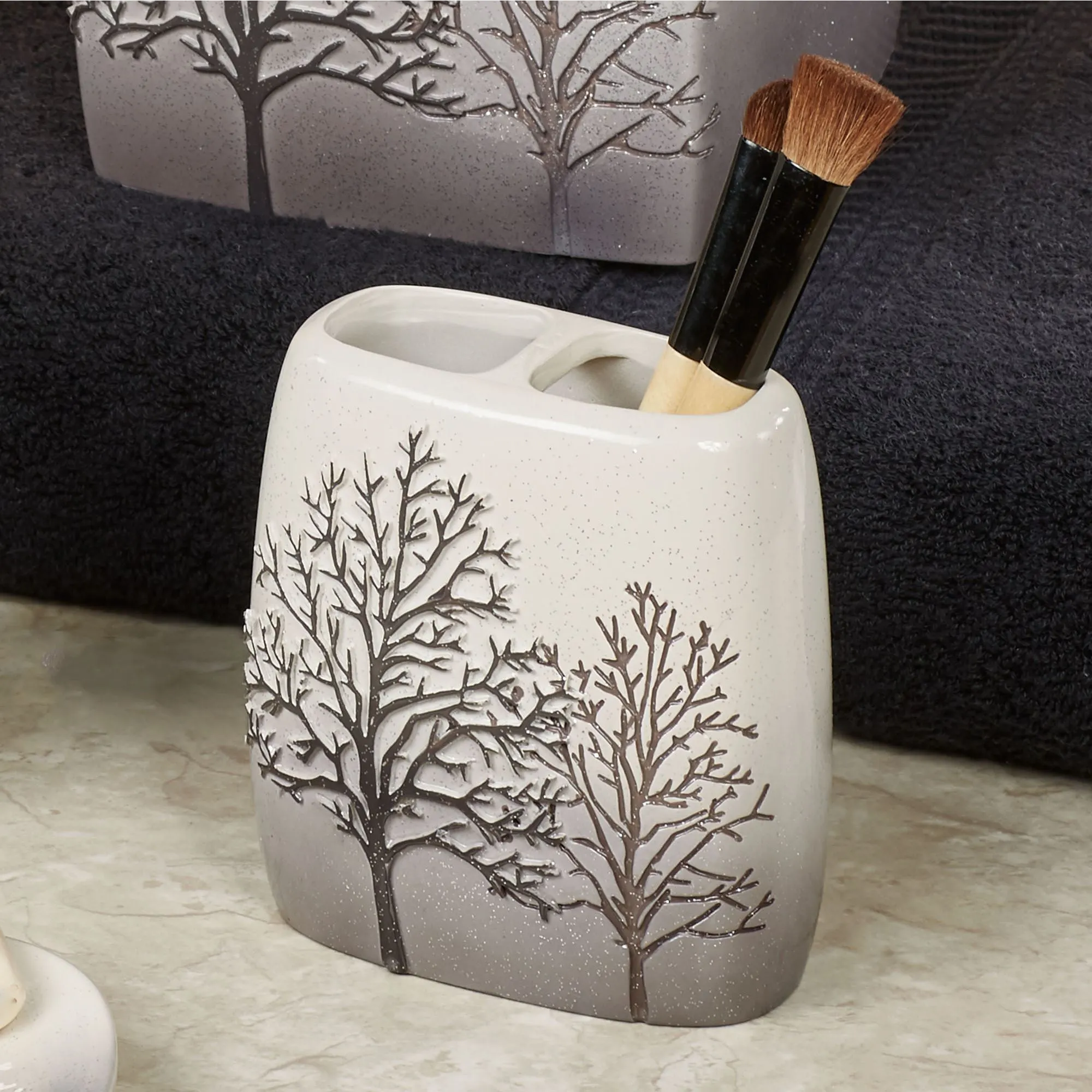 Add the soothing sight of misty mornings to your space with the Spectrum Bath Accessories. Resin bath accents feature various dimensional white, taupe, and chestnut tree silhouettes against an ombre background of pearl and dark gray. Shimmering silver metallic details highlight each scene. The brush holder can be used to hold your toothbrushes or makeup brushes. Specify Brush Holder or Tumbler; sorry, the other items are no longer available.