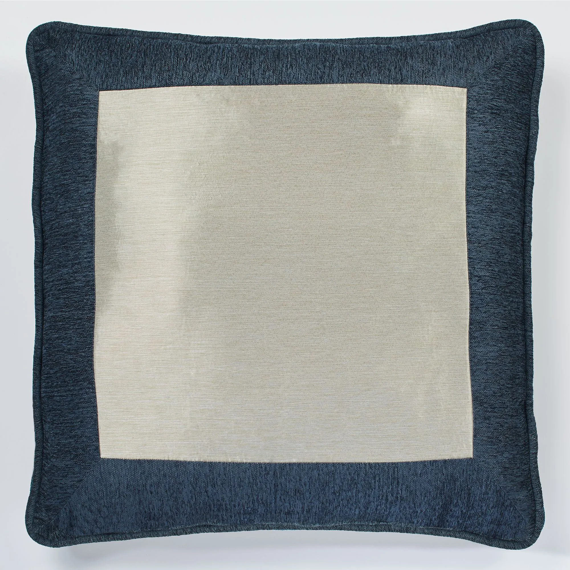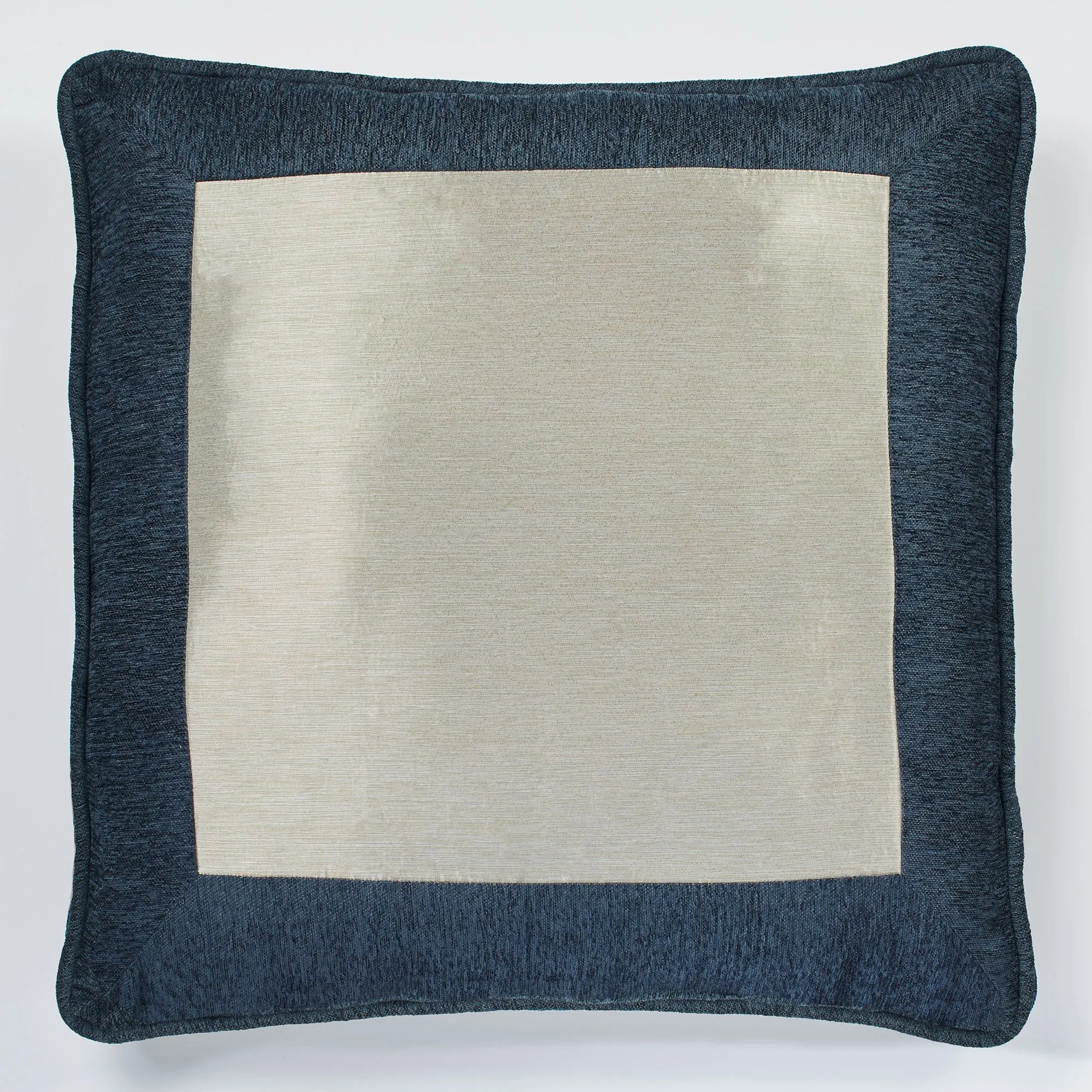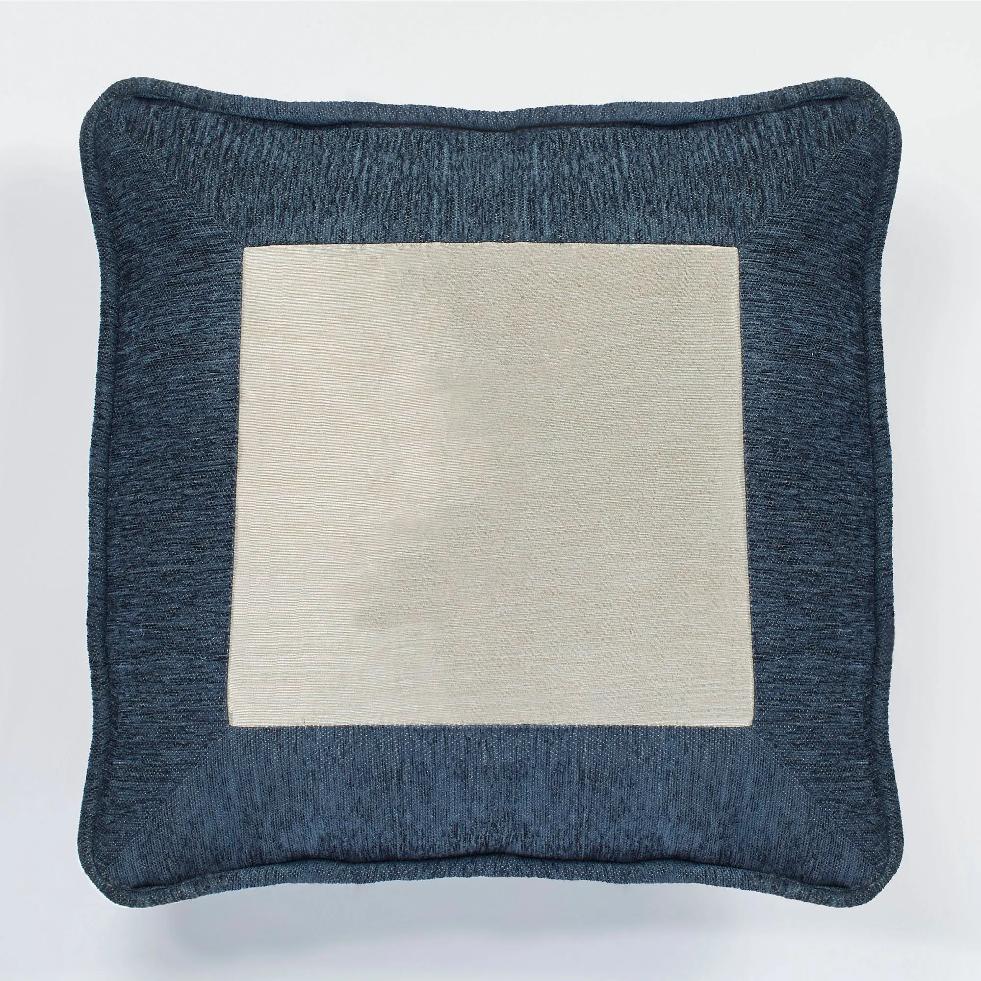 European Sham has a metallic center, indigo chenille frame, piped edges, and hidden zipper closure. European sham may be monogrammed for an extra charge. Monogramming is shown in the Navy Blue thread color.