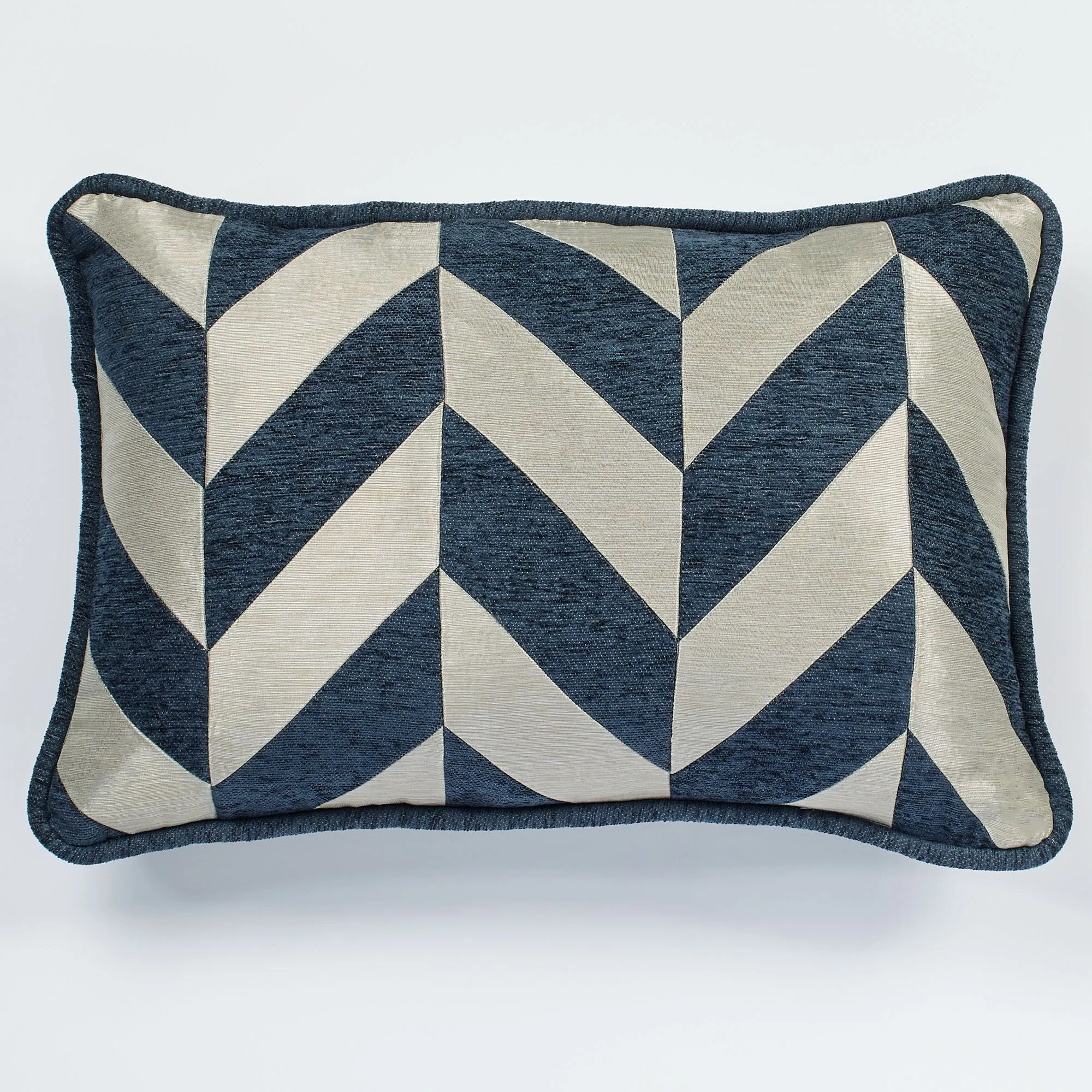 Pillows: Spot clean. Piped Square has a metallic center, indigo border, and hidden zipper closure. Insert is polyester. Piped 18" Square Pillow may be monogrammed for an extra charge. Monogramming is shown in the Navy Blue thread color. Piped Rectangle has a pieced indigo and metallic chevron design; reverses to indigo chenille. Tufted Square has abstract designs, 2" metallic gussets, piped edges, and an indigo reverse.