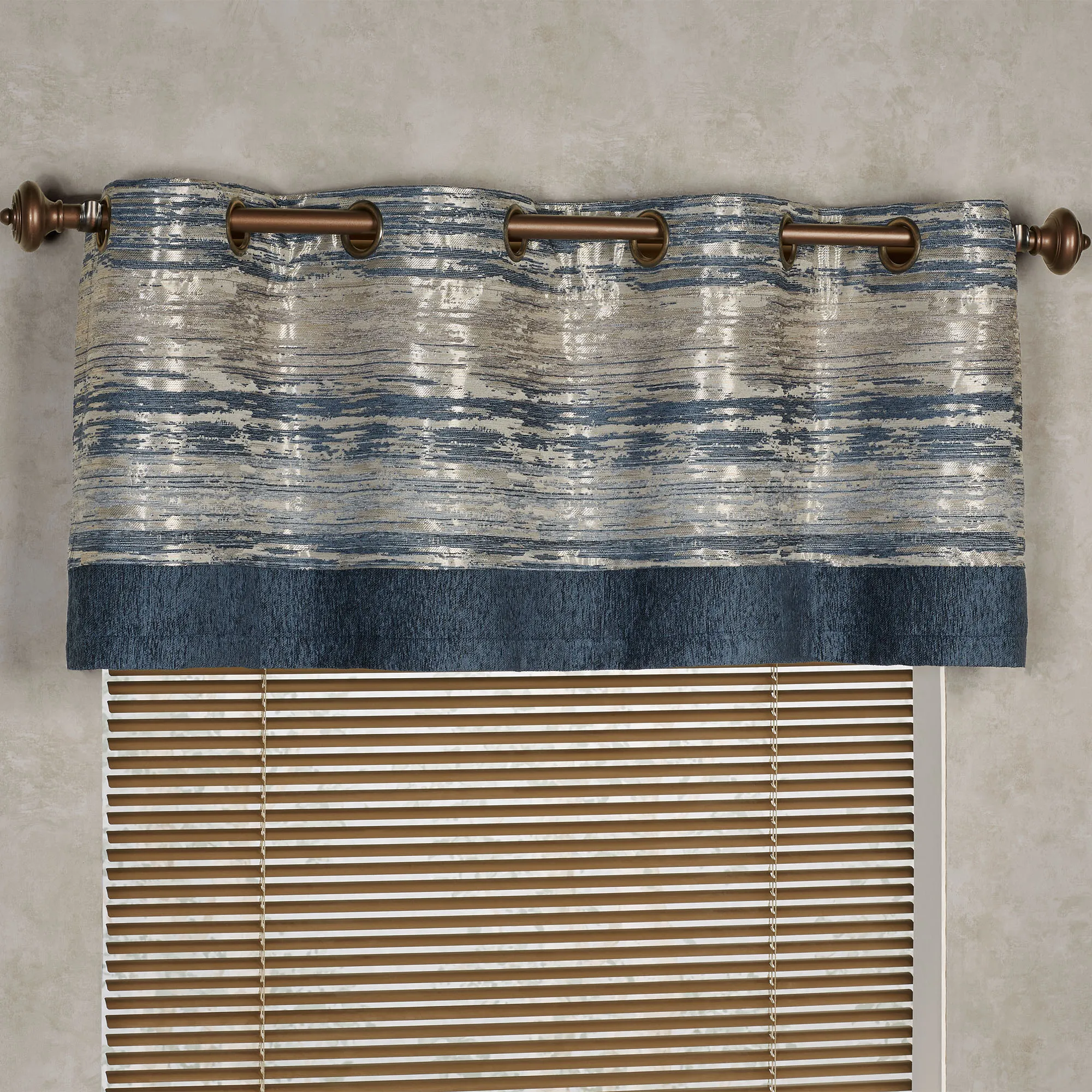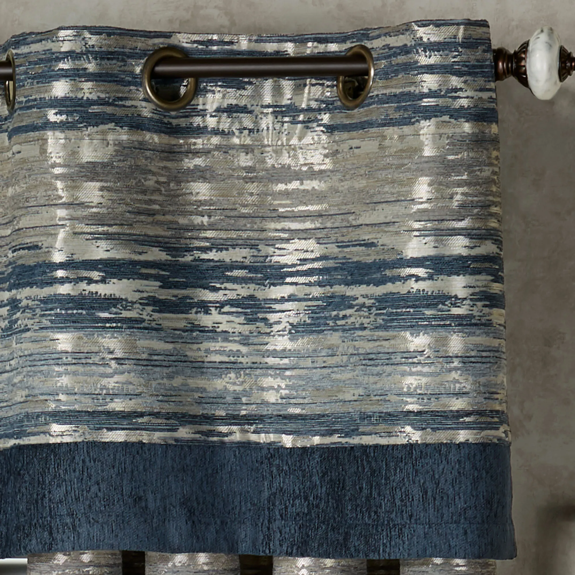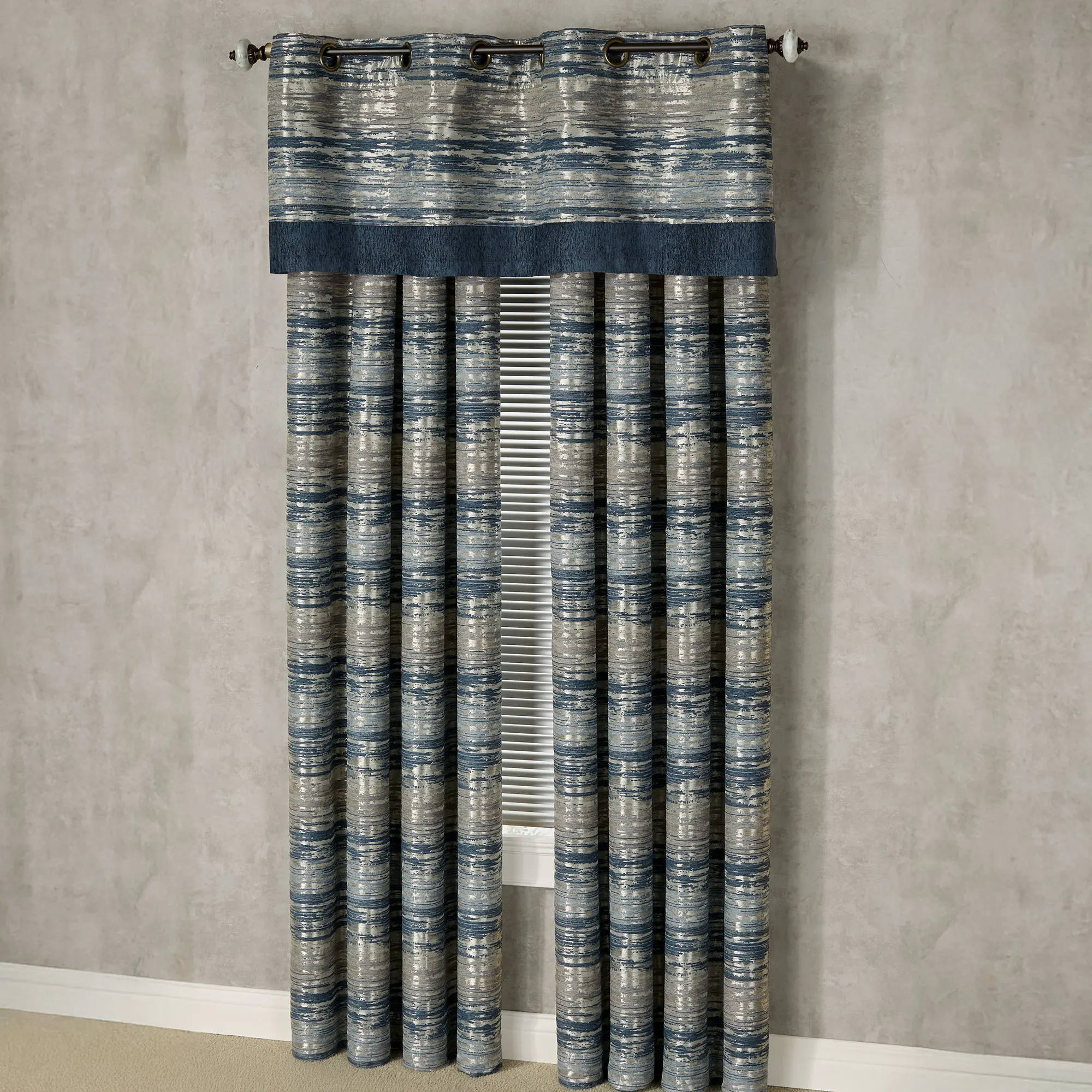 Shimmering metallic and striking cool hues will leave your room Spellbound. An exclusive Touch of Class(R) design by J. Queen New York, the polyester window treatment features indigo, blue fog, chateau gray, and metallic champagne gold tones throughout the abstract jacquard-woven and chenille fabrics. Window treatment has 1.5" dia. light bronze metal grommets. Specify Grommet Valance or Wide Grommet Curtain Pair. Valance has an indigo chenille bottom. Wide Curtain Pair has tailored edges. Dry clean. Imported. The curtain pair width is the total width of two panels together.