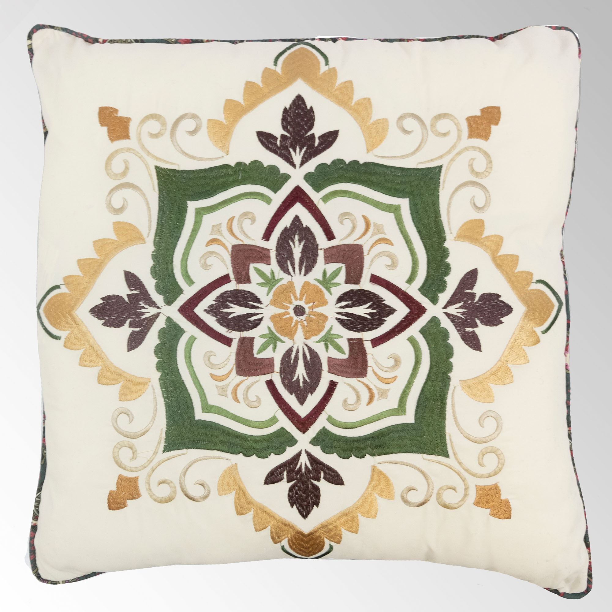 Pillows have zipper closures and polyester inserts. The Piped Embroidered Square has medallion embroidery on light cream and is reversible to a paisley print. The Tailored Embroidered Square is solid burgundy with medallion embroidery. The piped Rectangle has floral embroidery on light cream and is reversible to a paisley print.