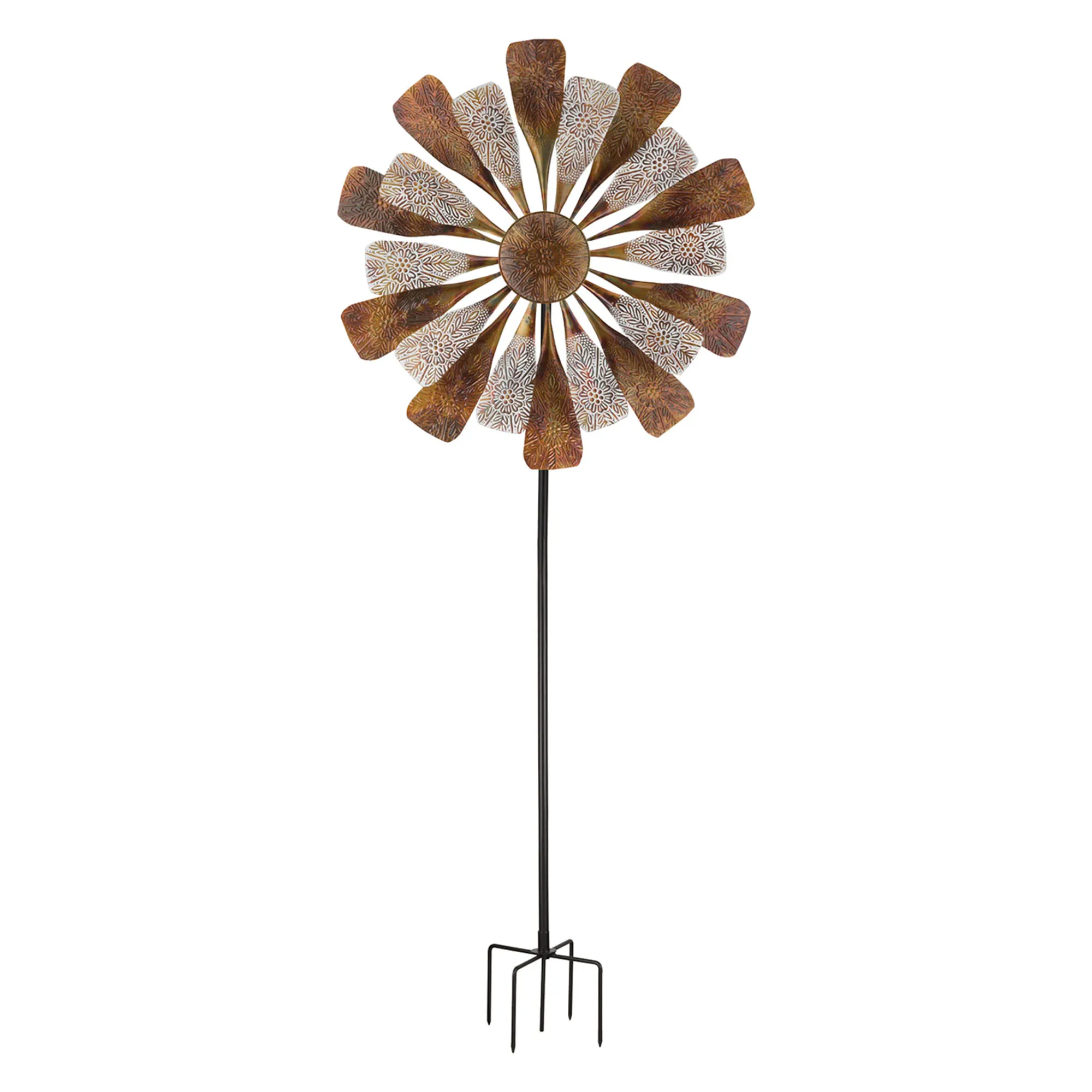 Embossed detailing lends an artistic look to the Spinning Floral Wind Spinner. With weather- and fade-resistant finishes, the metal wind spinner has two flamed copper and gold paddle-shaped blades that spin in opposite directions and feature charming flower and leaf designs. Whitewashing highlights the motifs on the gold blades for further dimension. Perfect outdoors year round, the wind spinner has a five-pronged ground stake for a strong, stable display. Overall, the design measures 35"Wx9"Dx84"H.