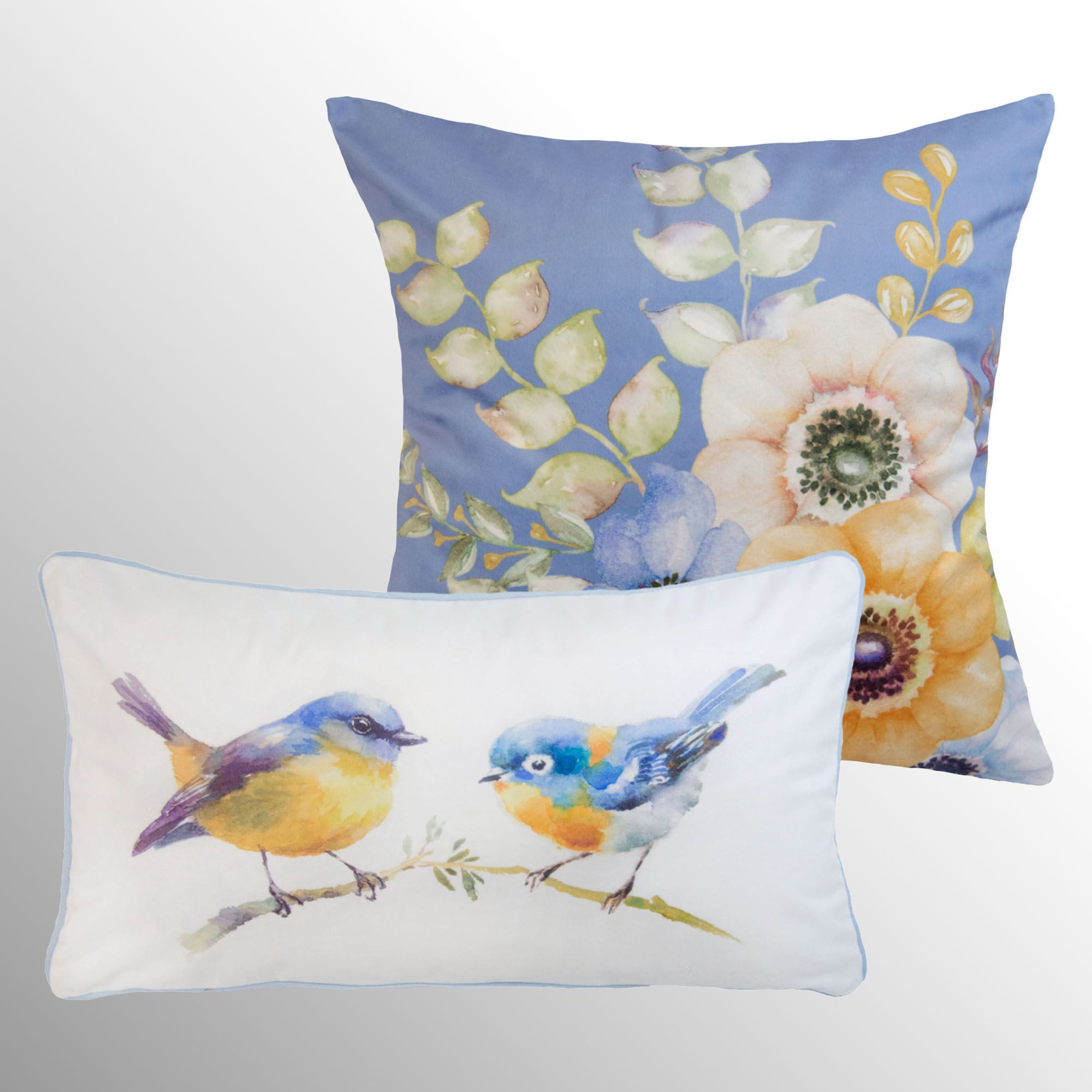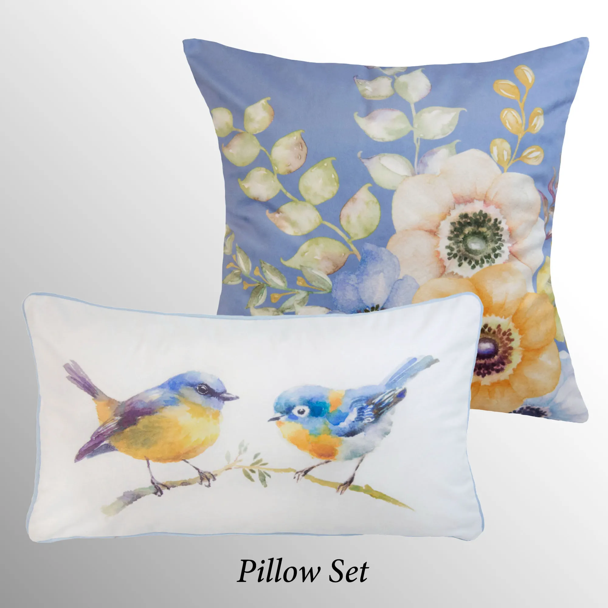 The polyester Pillow Set of Two includes one square pillow and one rectangle pillow. The tailored square has a floral print on blue and is reversible. The piped rectangle has two songbirds on white and is reversible. Fill is polyester. Spot clean.