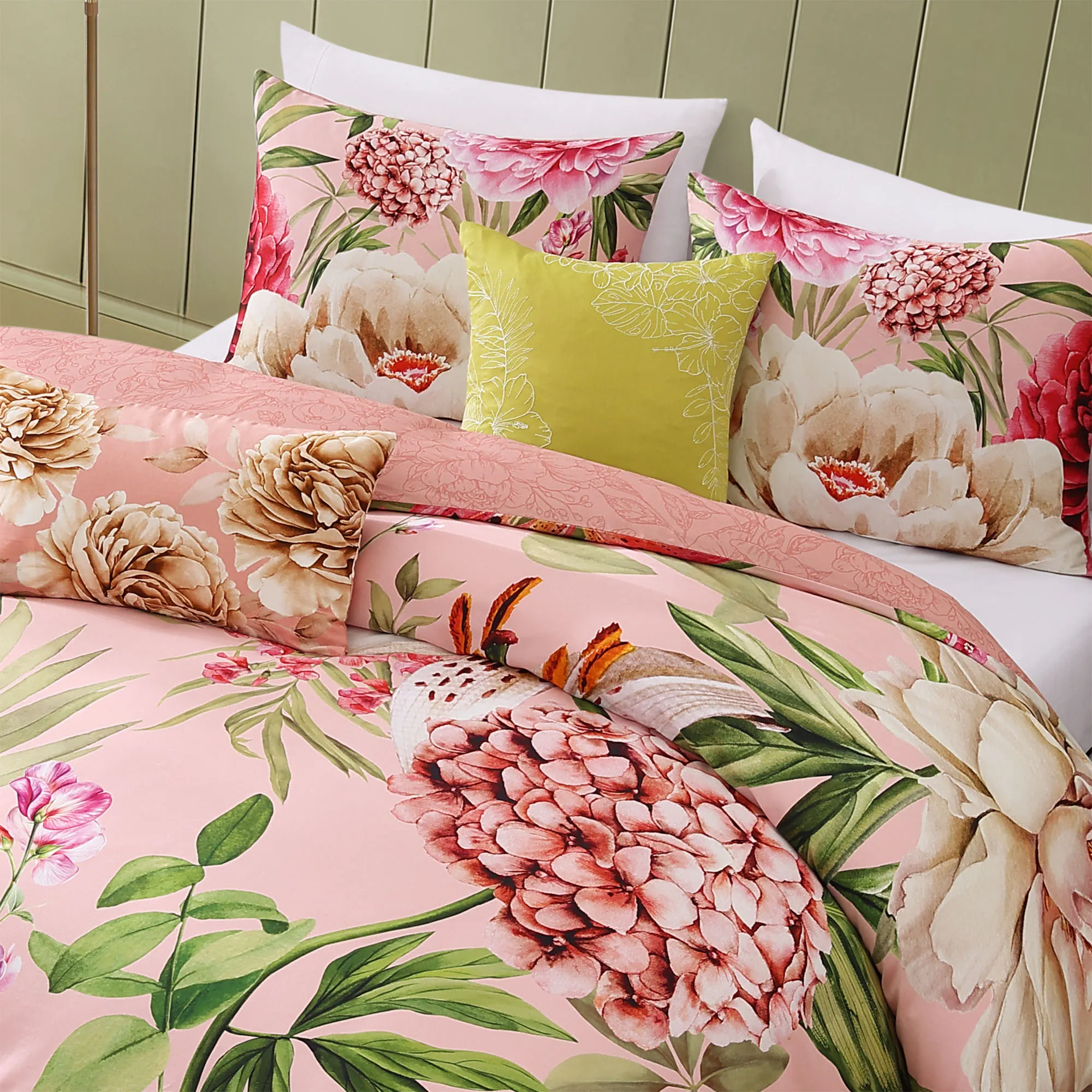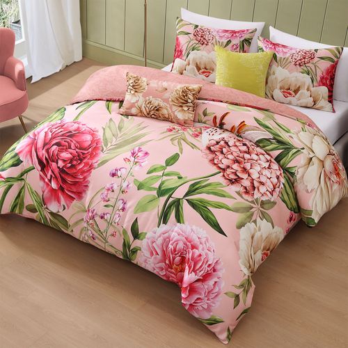 Spring Forever blooms in your dreams. The 5-piece Bed Set includes a comforter, 2 shams, and 2 accent pillows. Beautiful pink and ivory flower blossoms unfurl sweet petals in an overscale, detailed, printed design with green leaves on the pink cotton sateen bedding. Oversized comforter reverses to dusty pink tonal floral outlines. Click on the Details tab to read about the other items. Fill is polyester. Machine wash; spot clean the pillows. Imported.