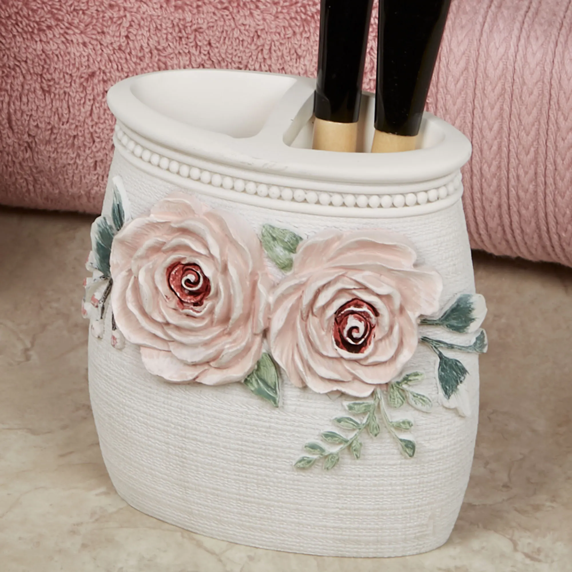 Peony flowers bloom beautifully in your Spring Garden. These handpainted resin floral bath accessories feature embossed soft pink peonies, green leaves, and ornate detailing on a textured ivory background. The Brush Holder can hold makeup brushes or toothbrushes. Specify Brush Holder, 5"Wx2.5"Dx4.5"H; or Tray, 10"Wx6"Dx1"H.