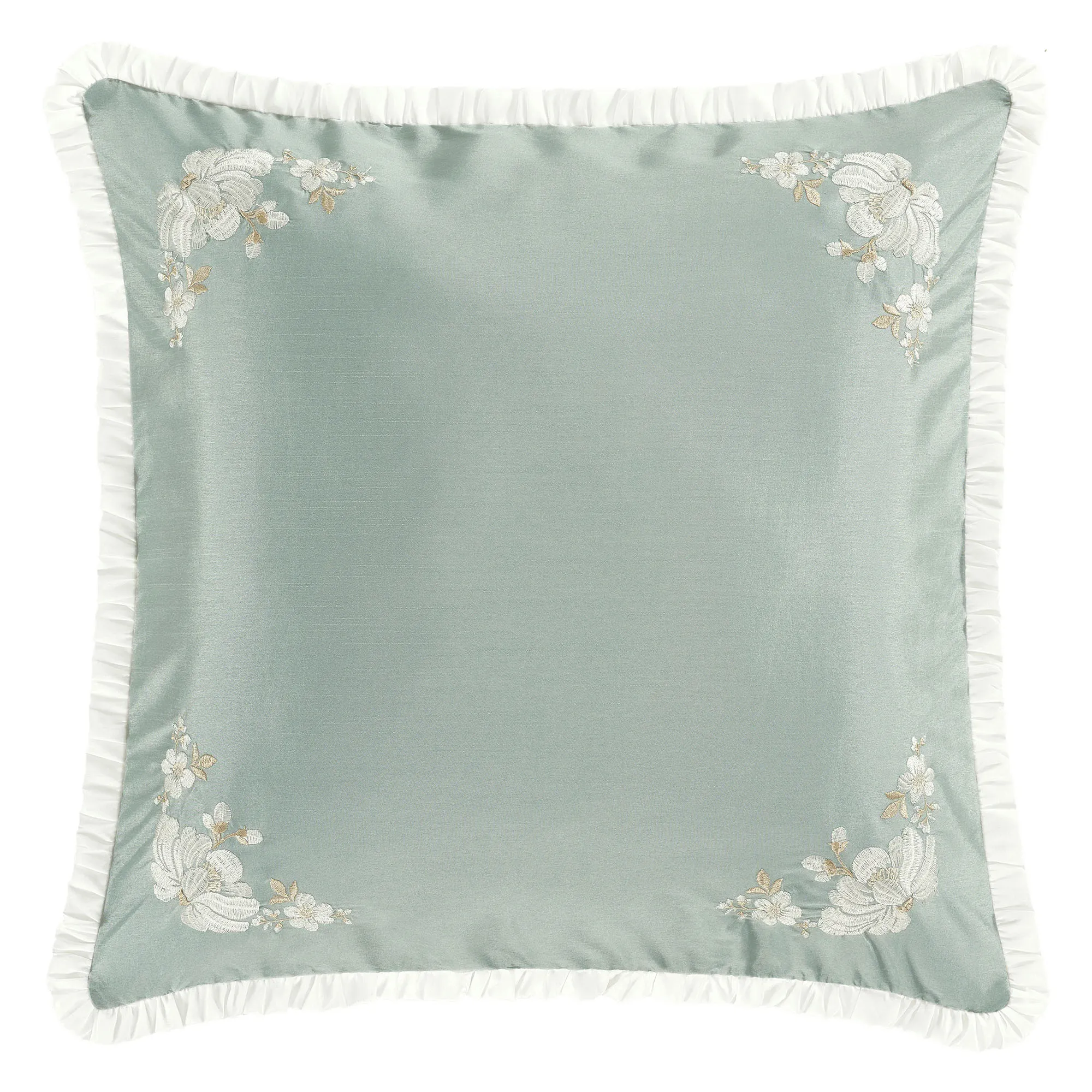 European Sham is aqua mist with embroidered corners and a soft white ruffled flange; zipper closure.