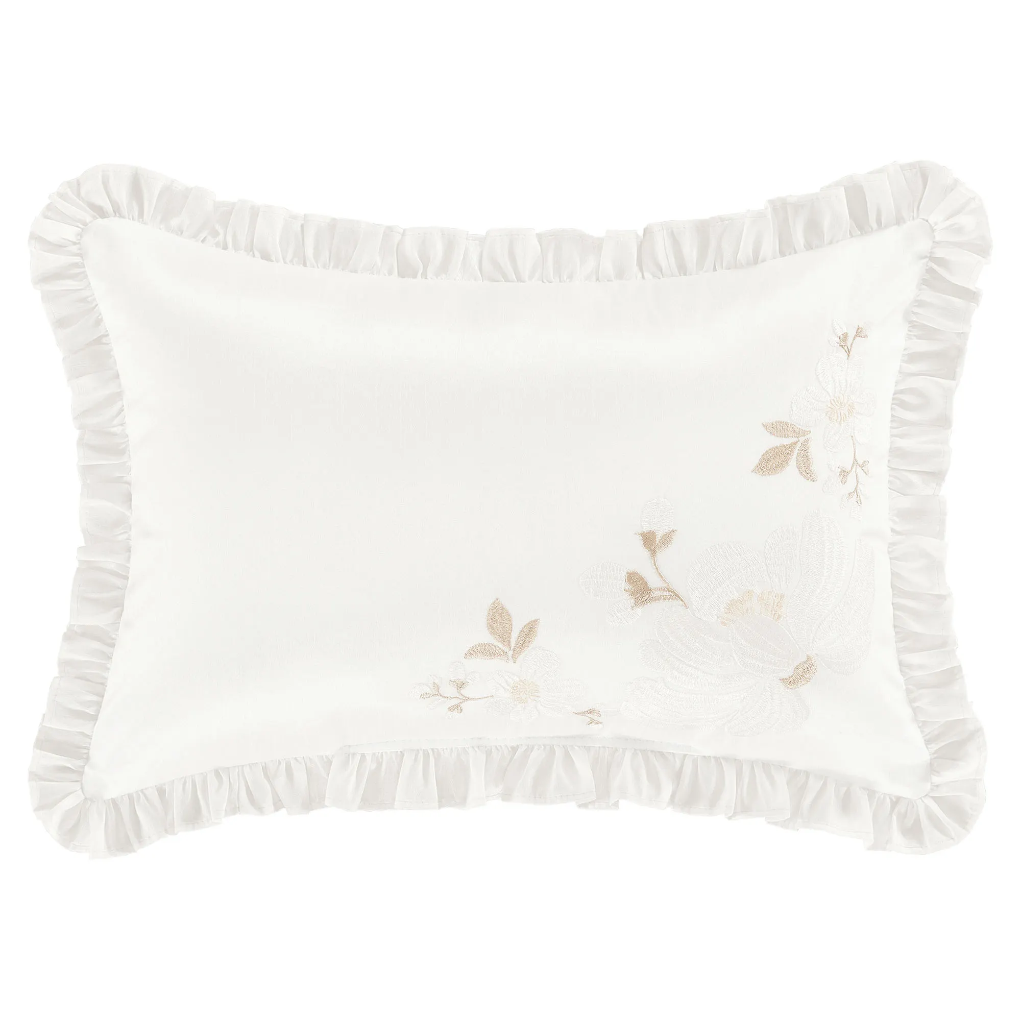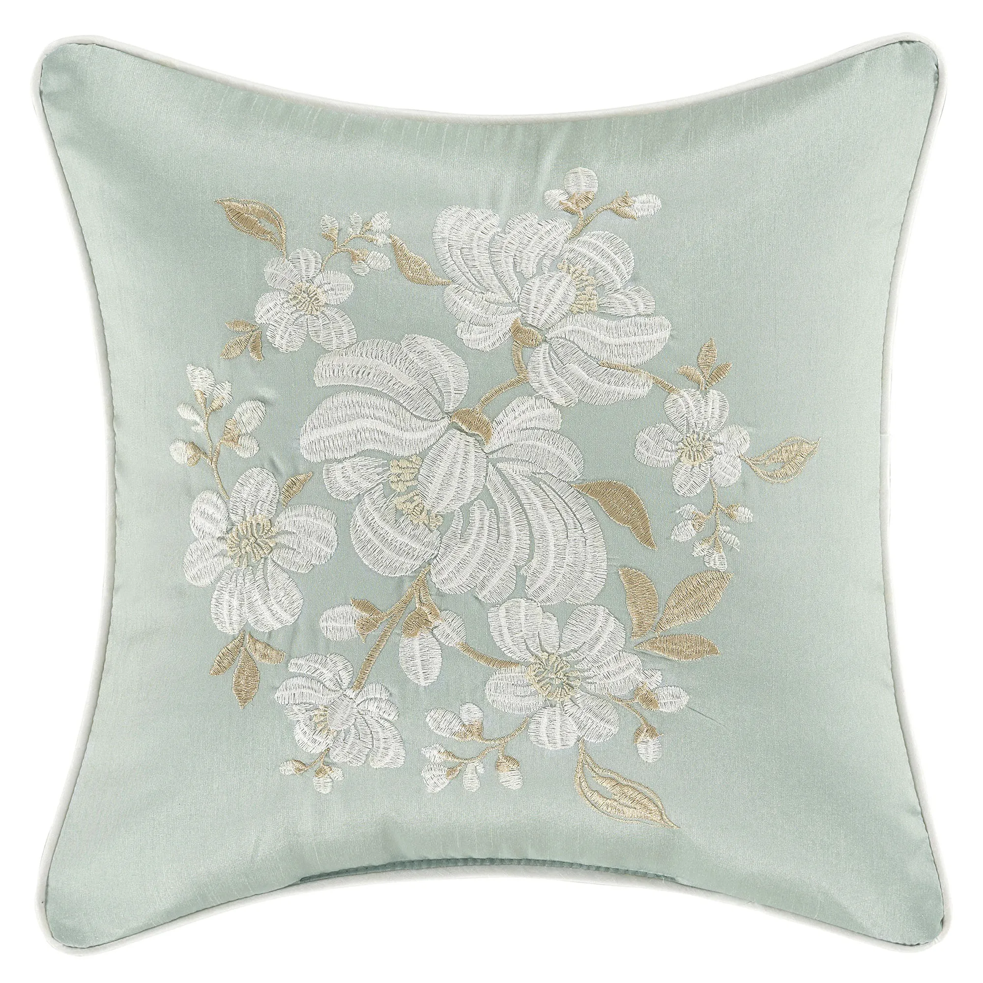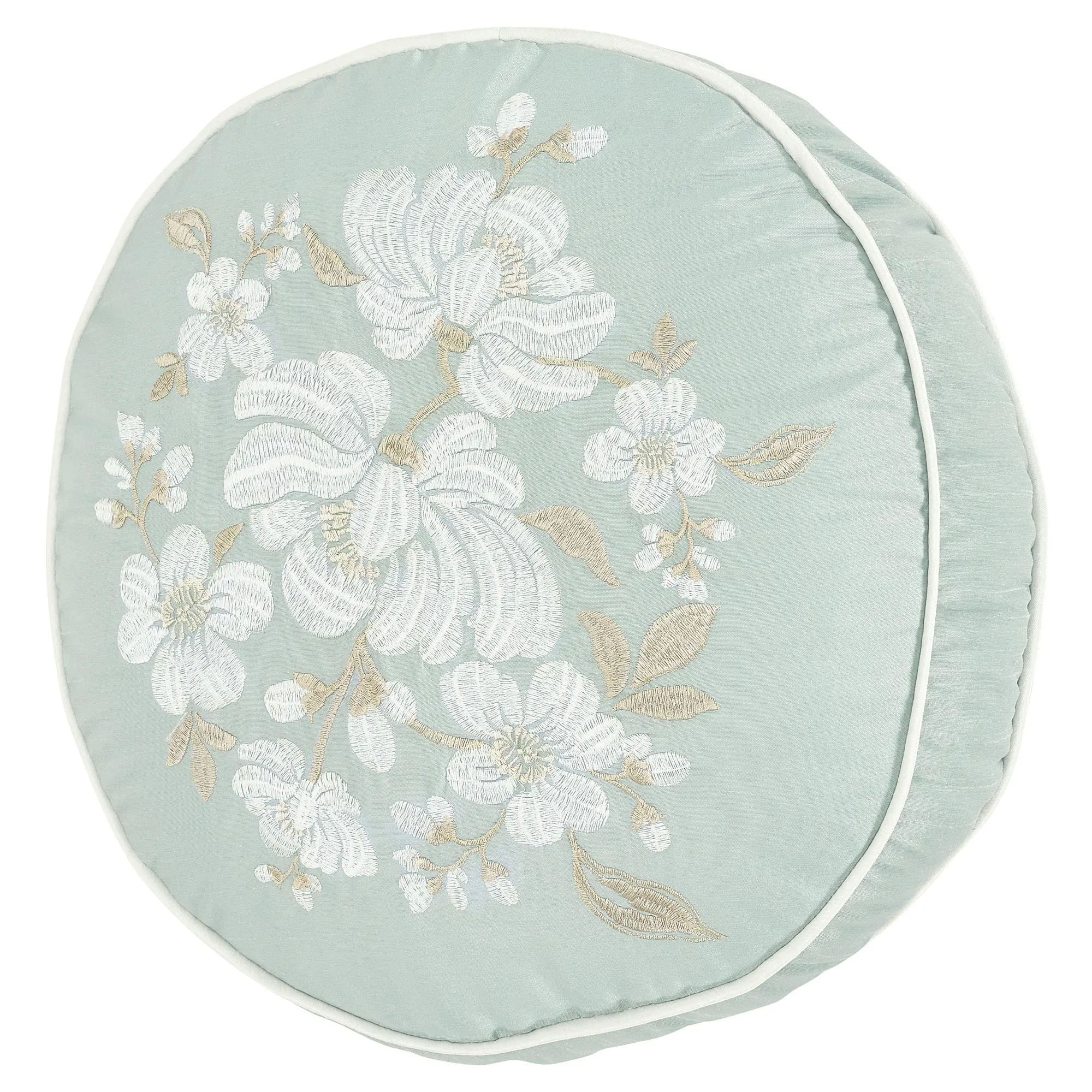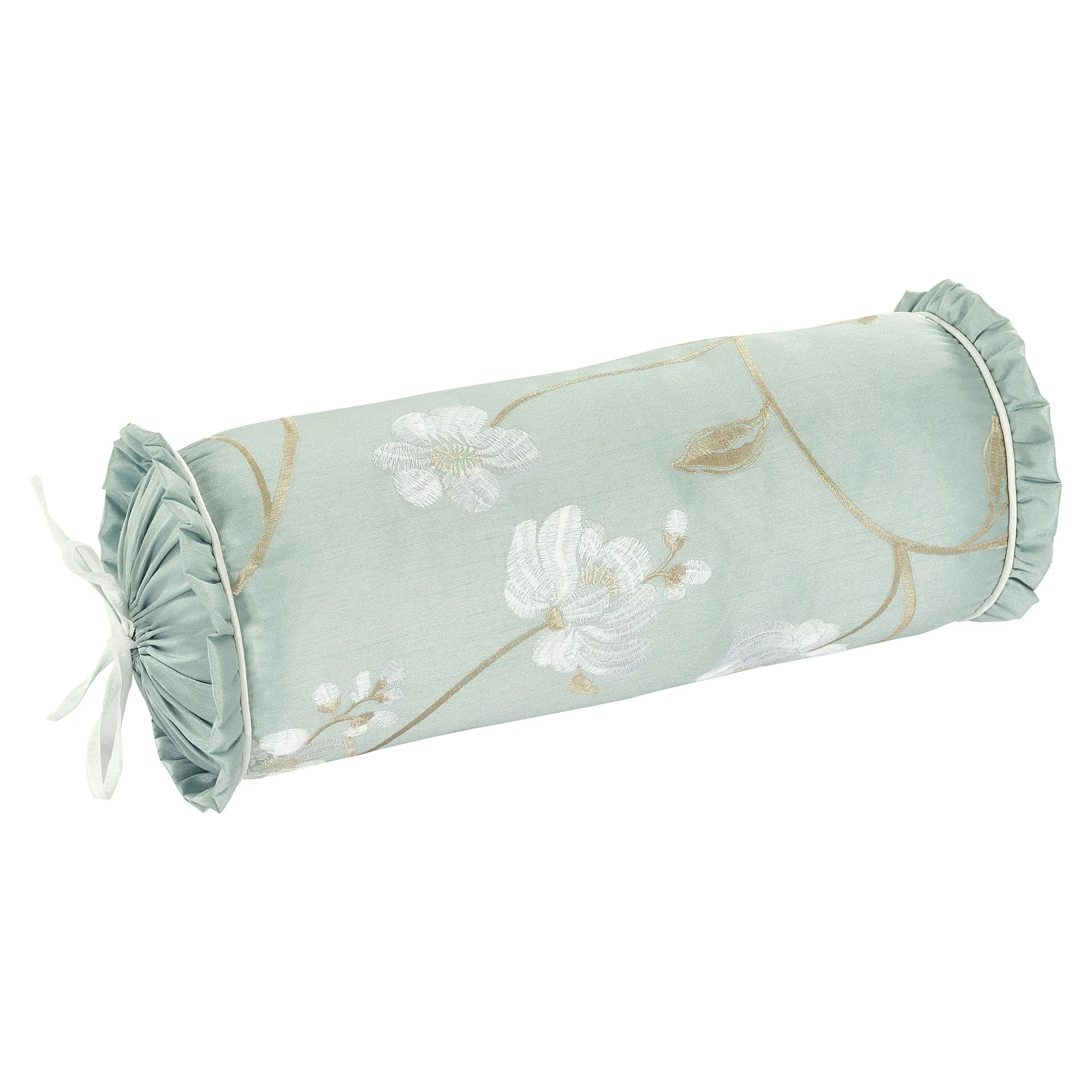 Pillows have coordinating embroidered florals. All, except the Rectangle, are aqua mist with piped edges. Spot clean. Choose Square, Round, Neckroll, or Rectangle. Round has a 3" side gusset. Neckroll has ruffled flange ends with white ties. Rectangle is soft white with a ruffled flange.