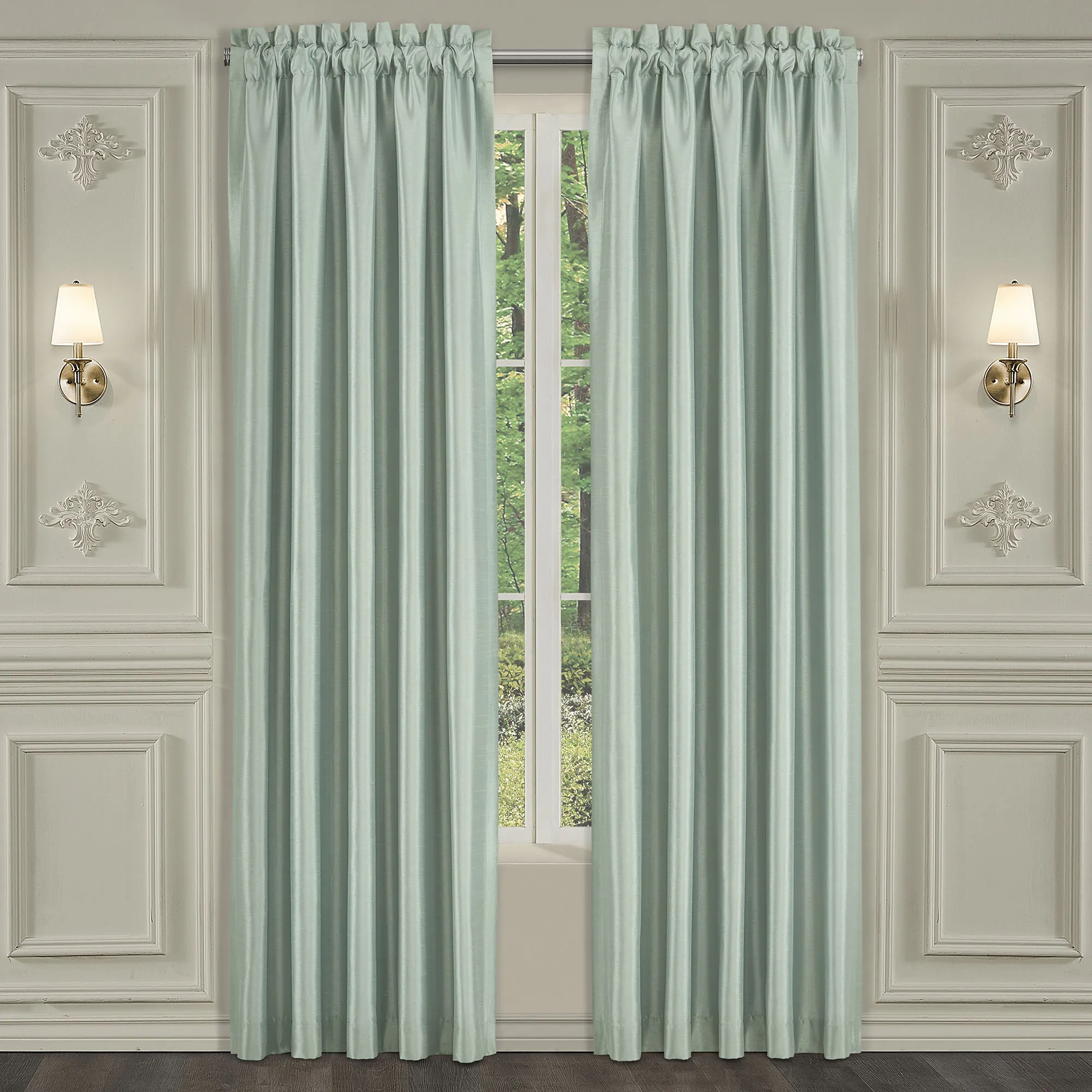 Lined Window Treatment is aqua mist. Curtain Pair includes tiebacks. Rod pocket is 3". Each Ascot Valance has floral embroidery, a tasseled end, and a 3.25" rod pocket.