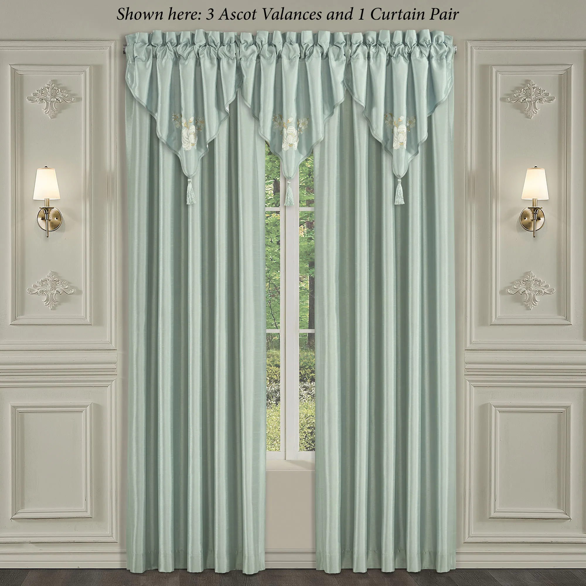 Lined Window Treatment is aqua mist. Curtain Pair includes tiebacks. Rod pocket is 3". Each Ascot Valance has floral embroidery, a tasseled end, and a 3.25" rod pocket.