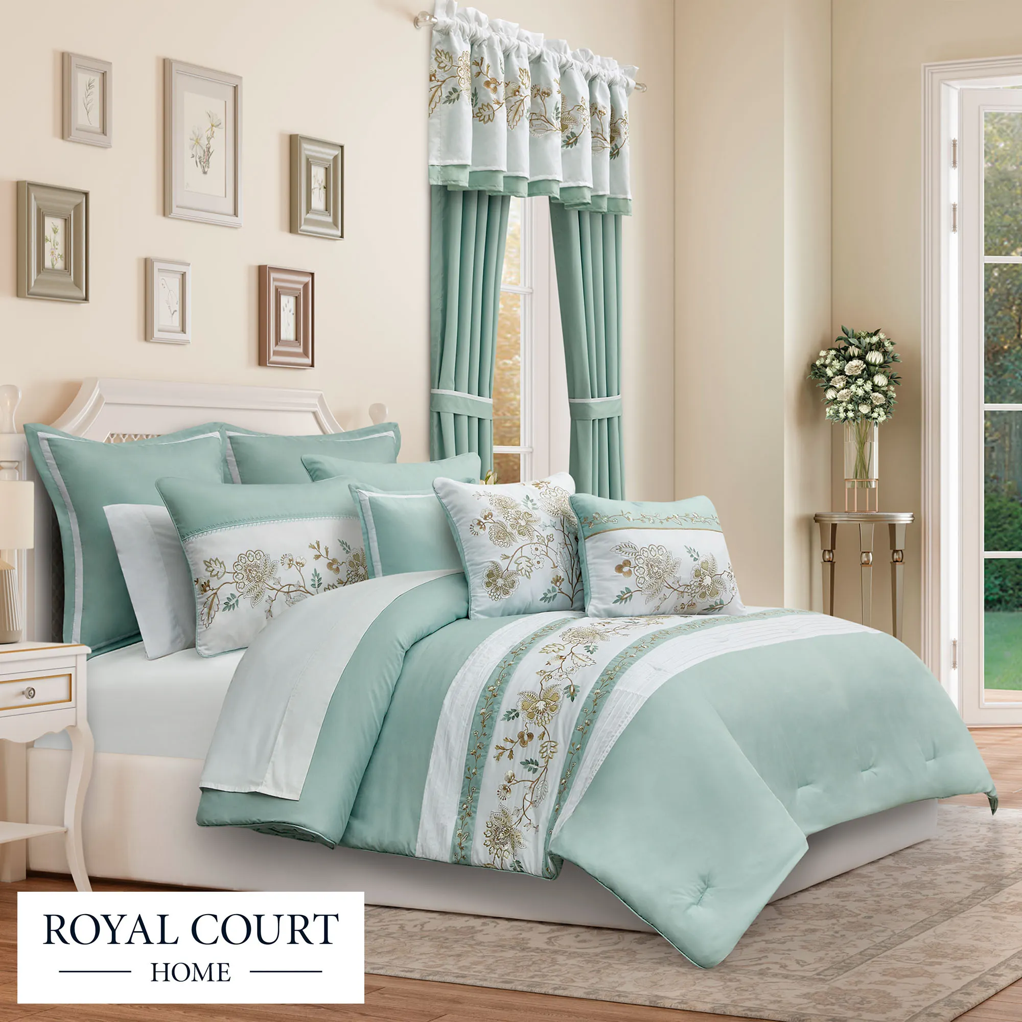 Refresh your bedroom with the blossoming flowers on the Spring Social Bedding from Royal Court. The Comforter Set includes a comforter and two shams. The charming polyester comforter is spa pieced with a white embroidered floral center band, two embroidered floral spa bands, and pleated white accent bands. The embroidery is in hues of aqua, spa, gold, and ivory. Comforter has piped edges and is backed in spa polyester. Bedding fill is polyester. Dry clean only. Imported.