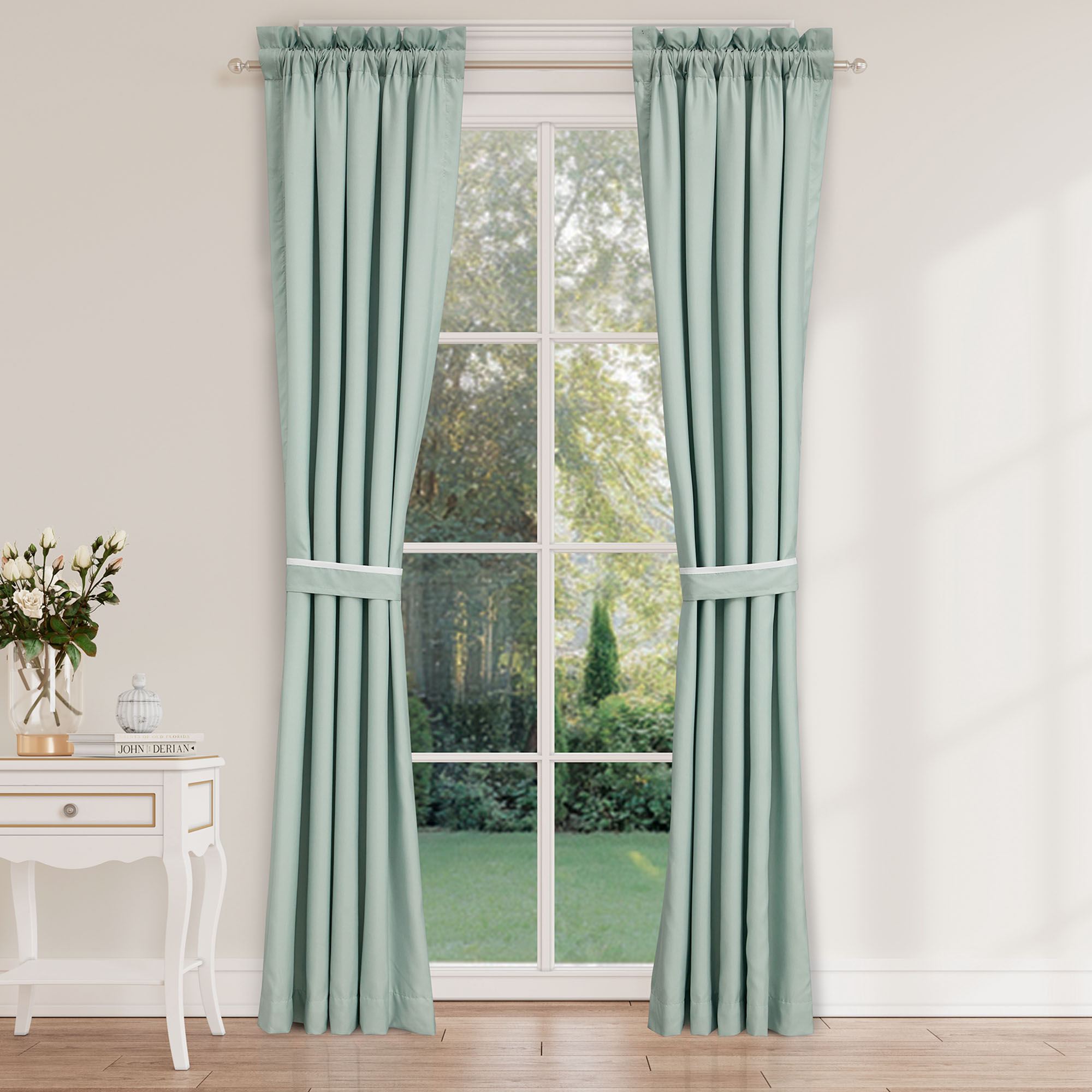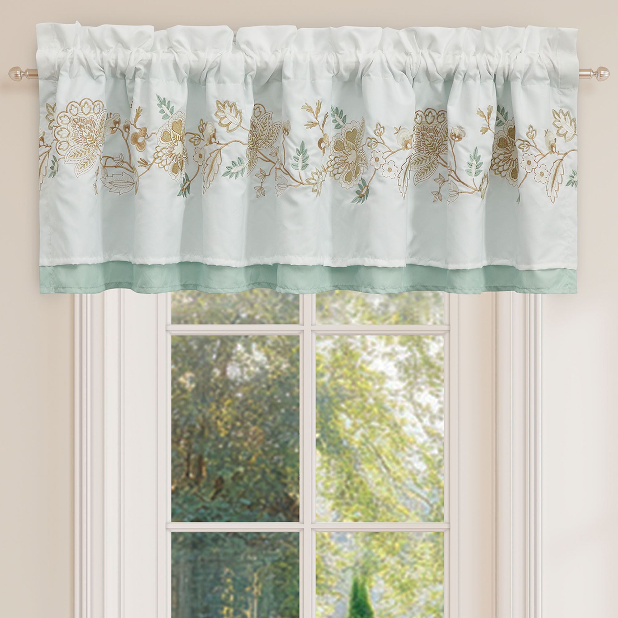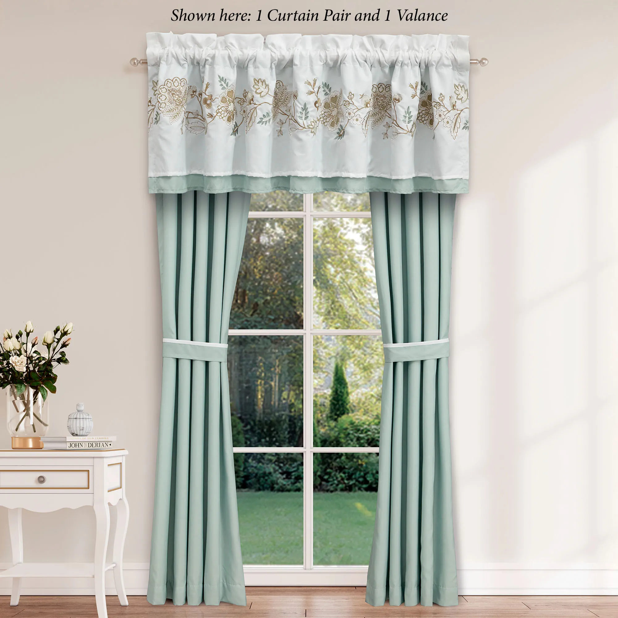 Lined Window Treatments have tailored edges. Curtain Pair is spa with a 3" rod pocket. Tiebacks are included. Valance is floral-embroidered white pieced with spa. Rod pocket is 3.25".
