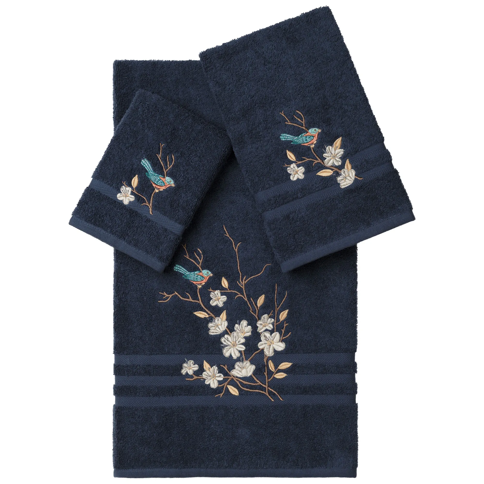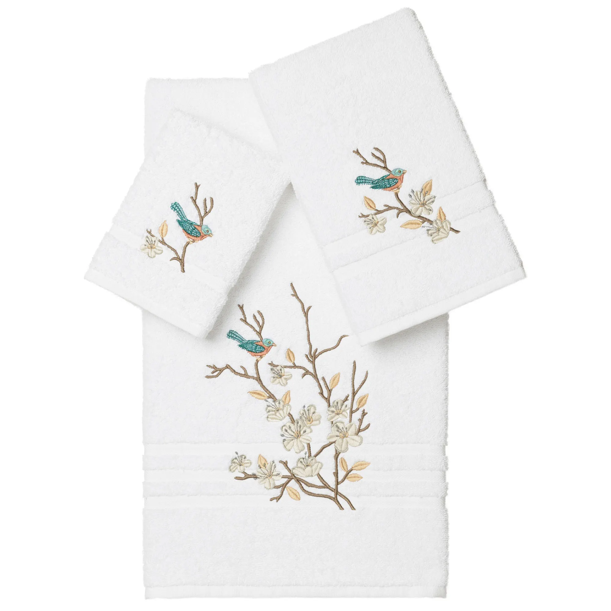 Birds chirp and flowers bloom at the arrival of Spring Time. Add the same natural charm to your daily routine with this embroidered bath towel set. Accented with a dobby woven border, each towel features a small metallic bird perched on a flourishing cherry blossom branch in shades of white, brown, and light gold. The cloud-soft towels are crafted from 500 GSM premium Turkish cotton in a classic solid color and offer lasting absorbency, superior durability, and a quick drying experience. The nature-inspired three-piece towel set includes one bath towel, 27"x54"; one hand towel, 16"x30"; and one washcloth, 13" sq. Machine washable. Imported/USA.