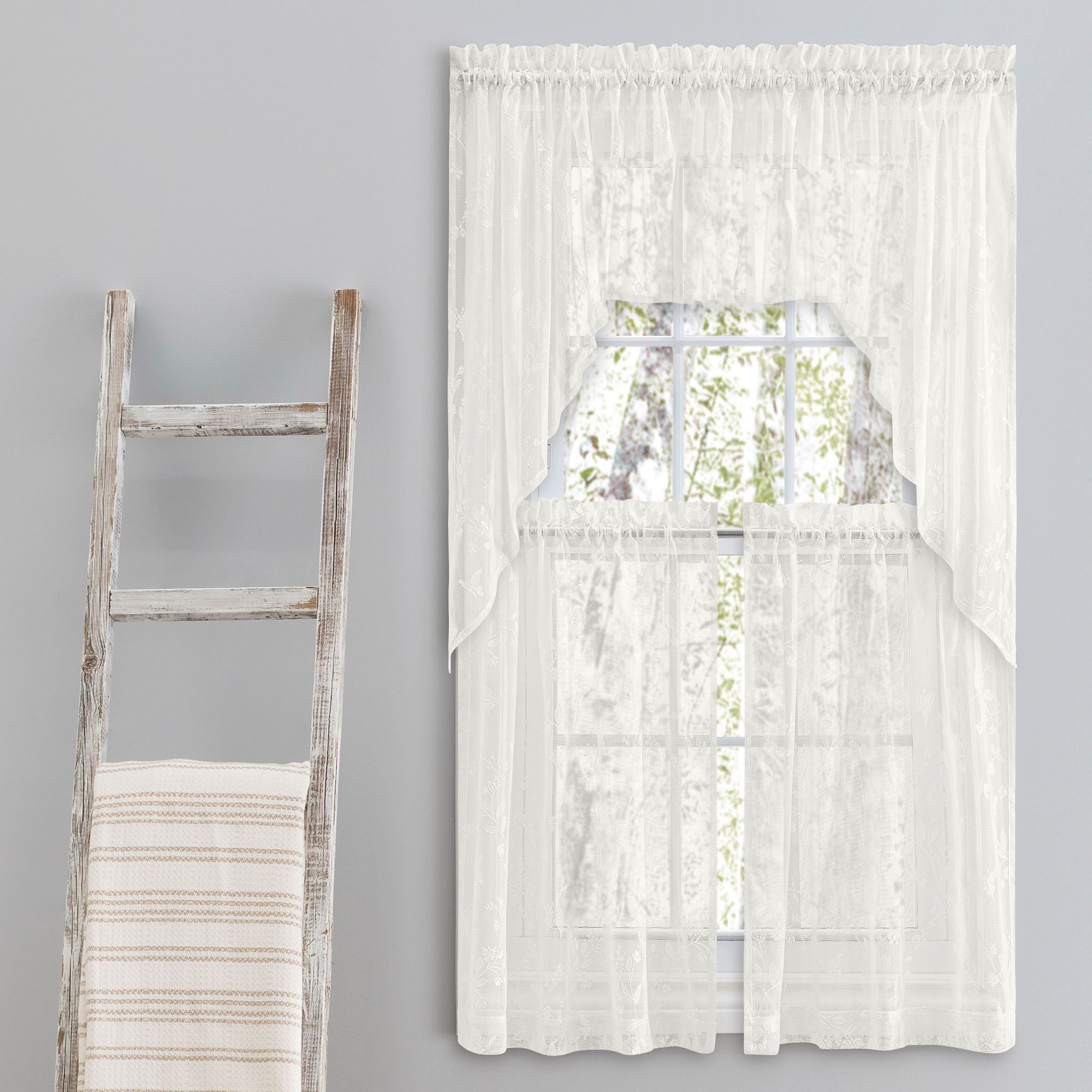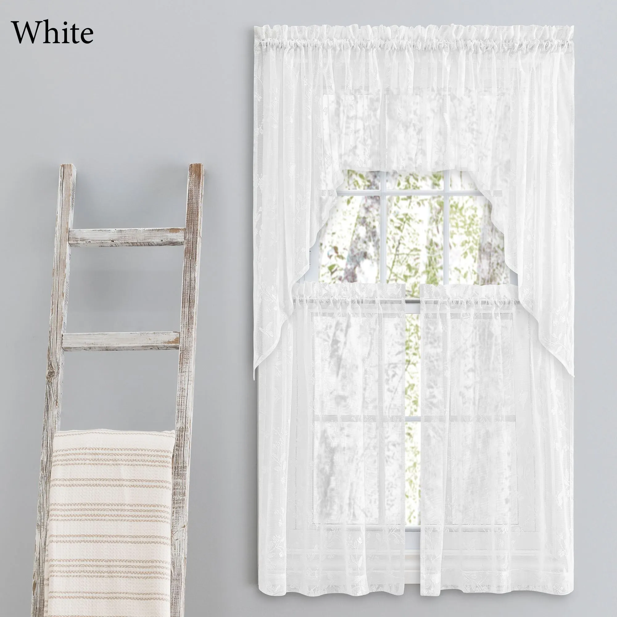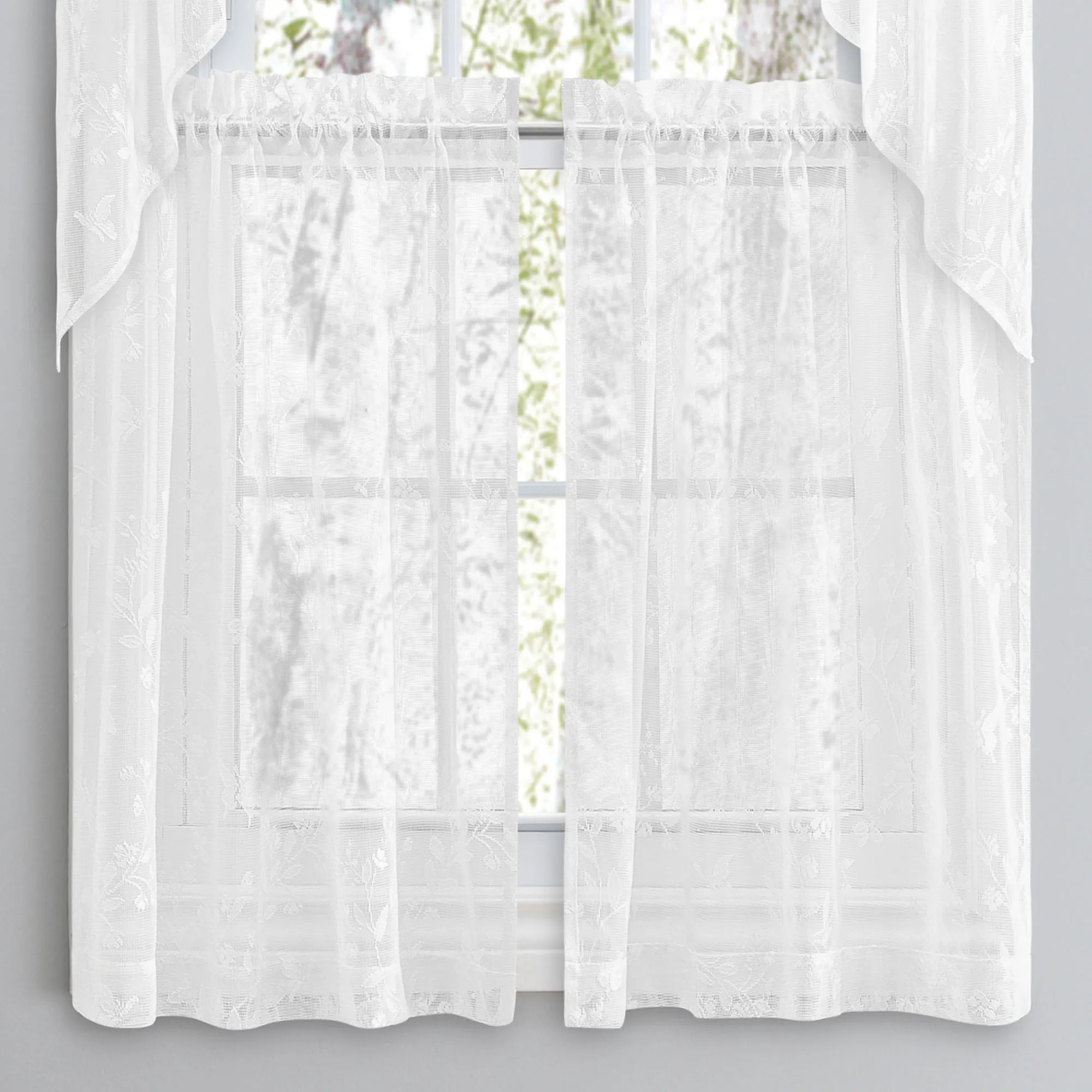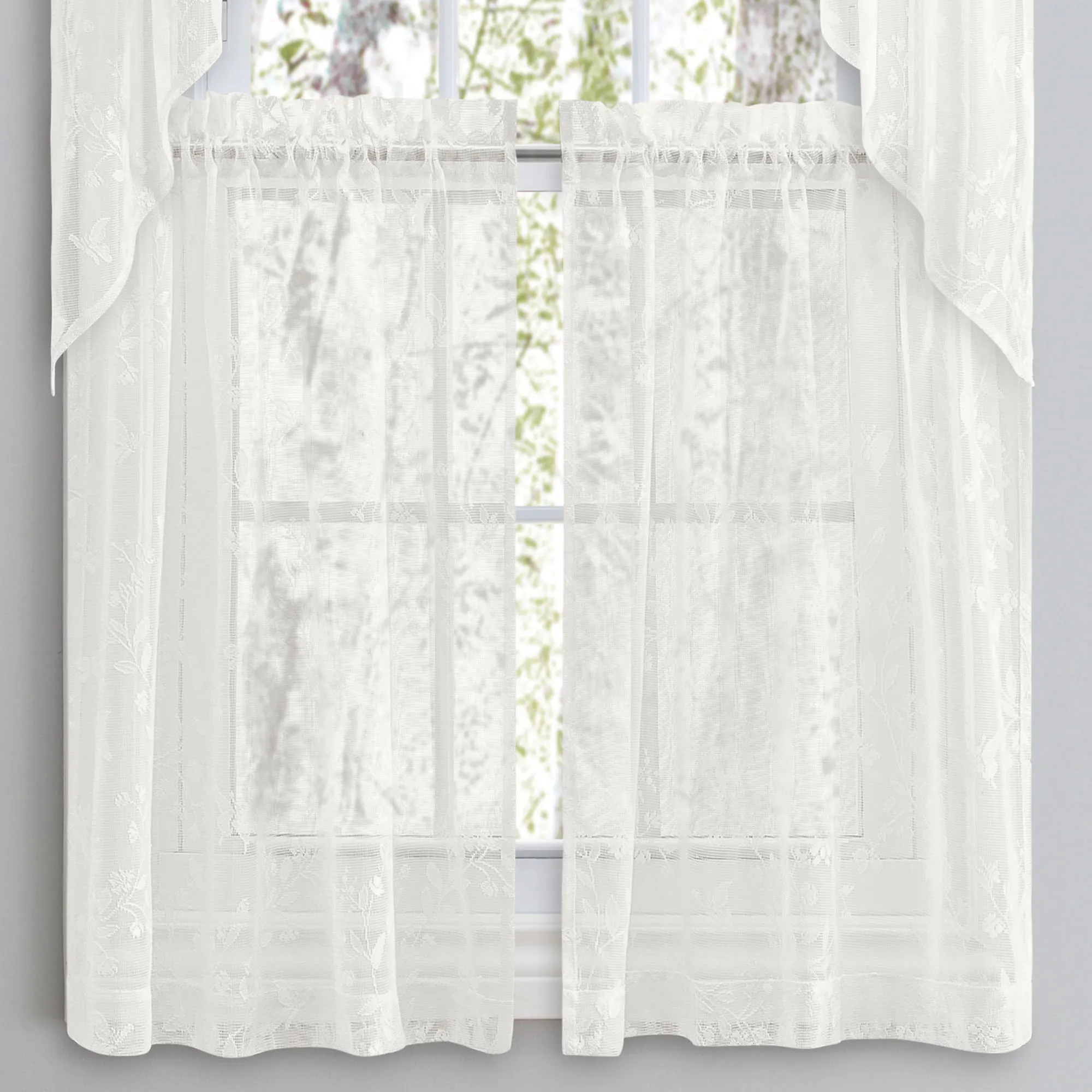 The flitting path of a Springtime Butterfly may zip past your view year round with this charming tier window treatment. In a lace design, the polyester window accents feature butterflies among the branches. Rod pockets are 1.5". Each window treatment measures 52"W. Specify Tier Pair, Swag Valance Pair, or Tailored Valance. Swag Valance Pair is 36"L. Tailored Valance is 14"L. Machine washable. Imported.