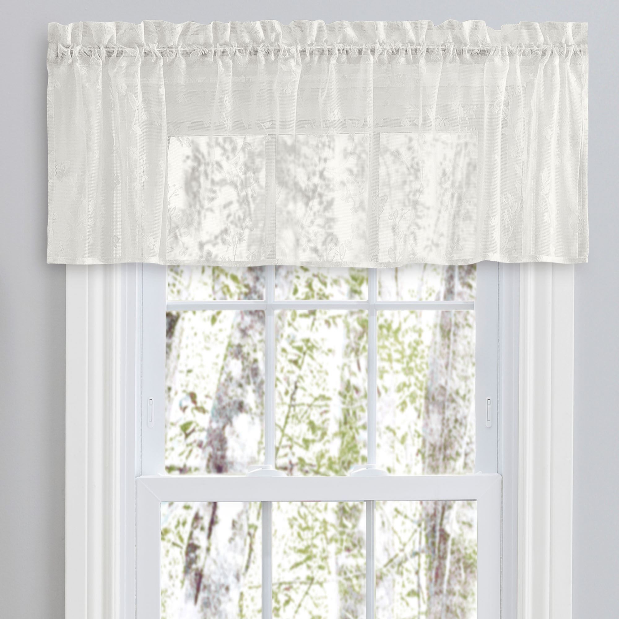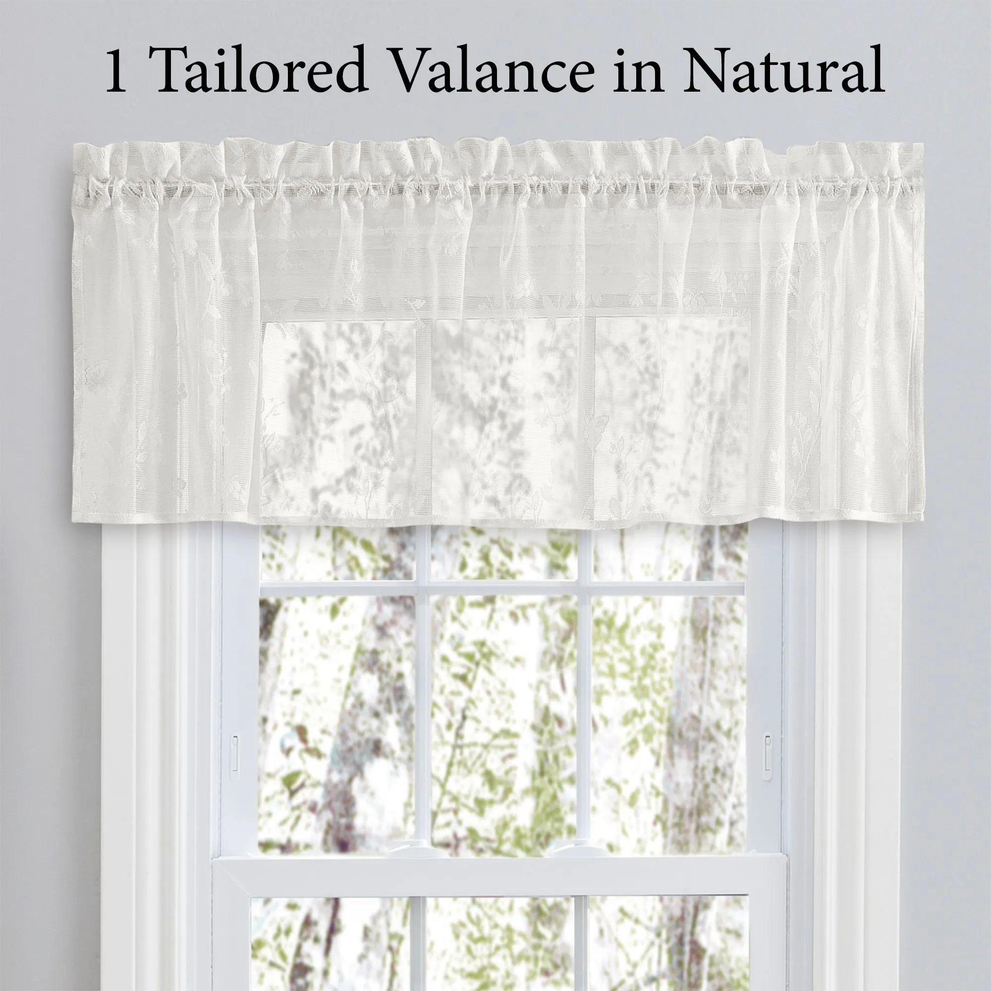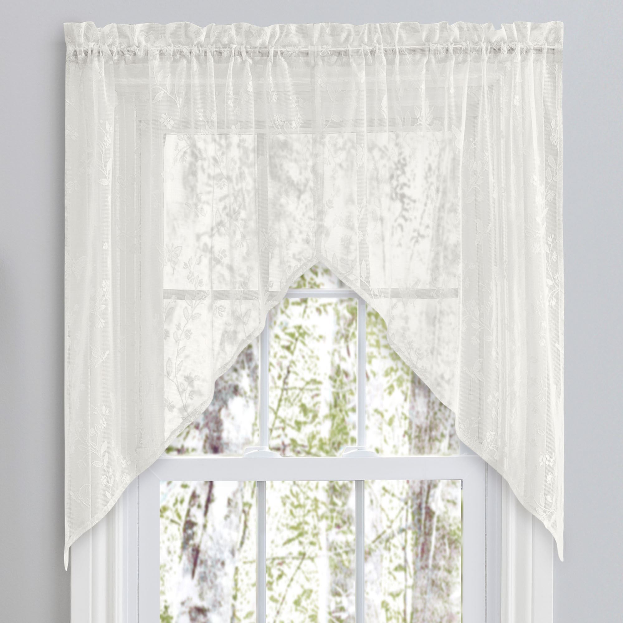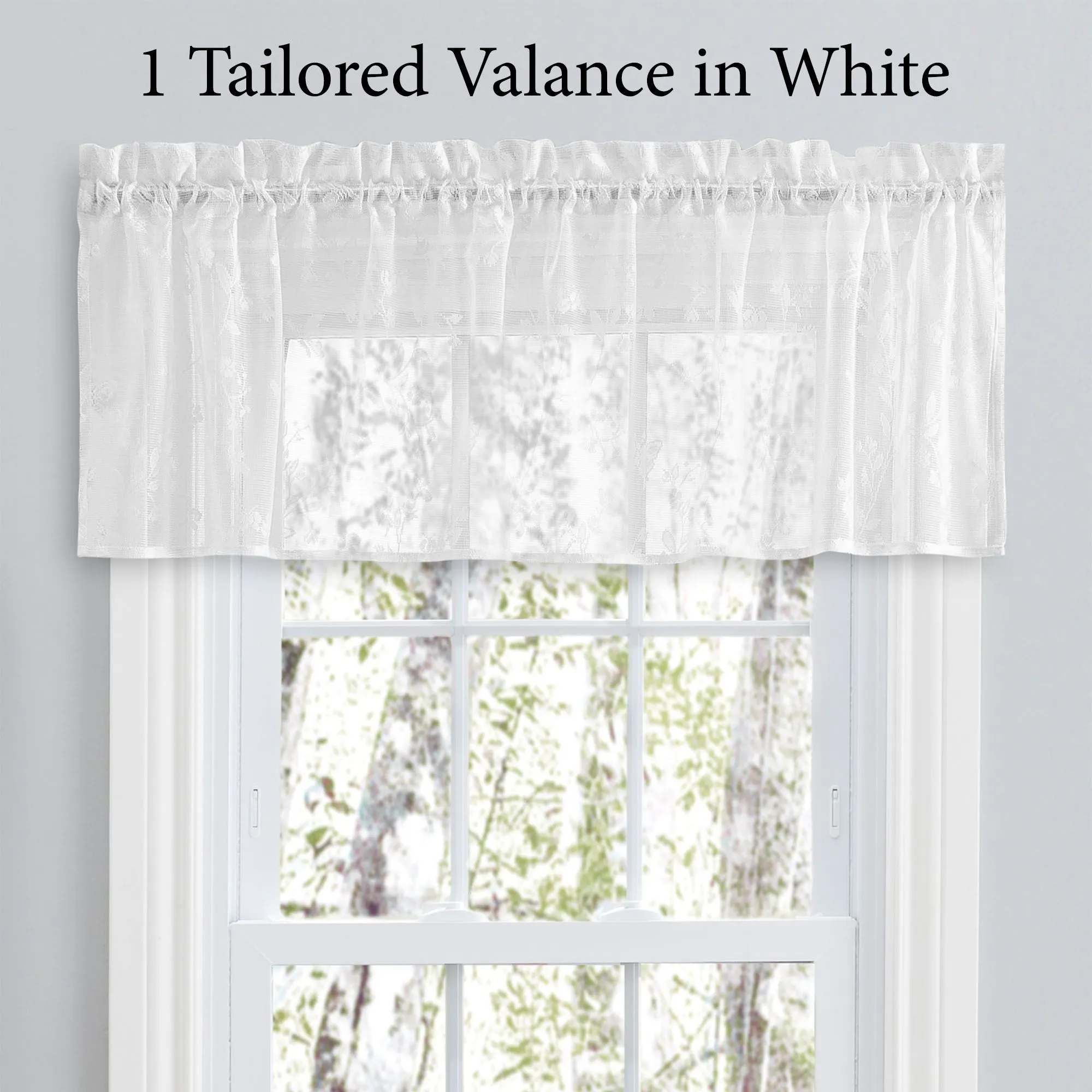 The flitting path of a Springtime Butterfly may zip past your view year round with this charming tier window treatment. In a lace design, the polyester window accents feature butterflies among the branches. Rod pockets are 1.5". Each window treatment measures 52"W. Specify Tier Pair, Swag Valance Pair, or Tailored Valance. Swag Valance Pair is 36"L. Tailored Valance is 14"L. Machine washable. Imported.