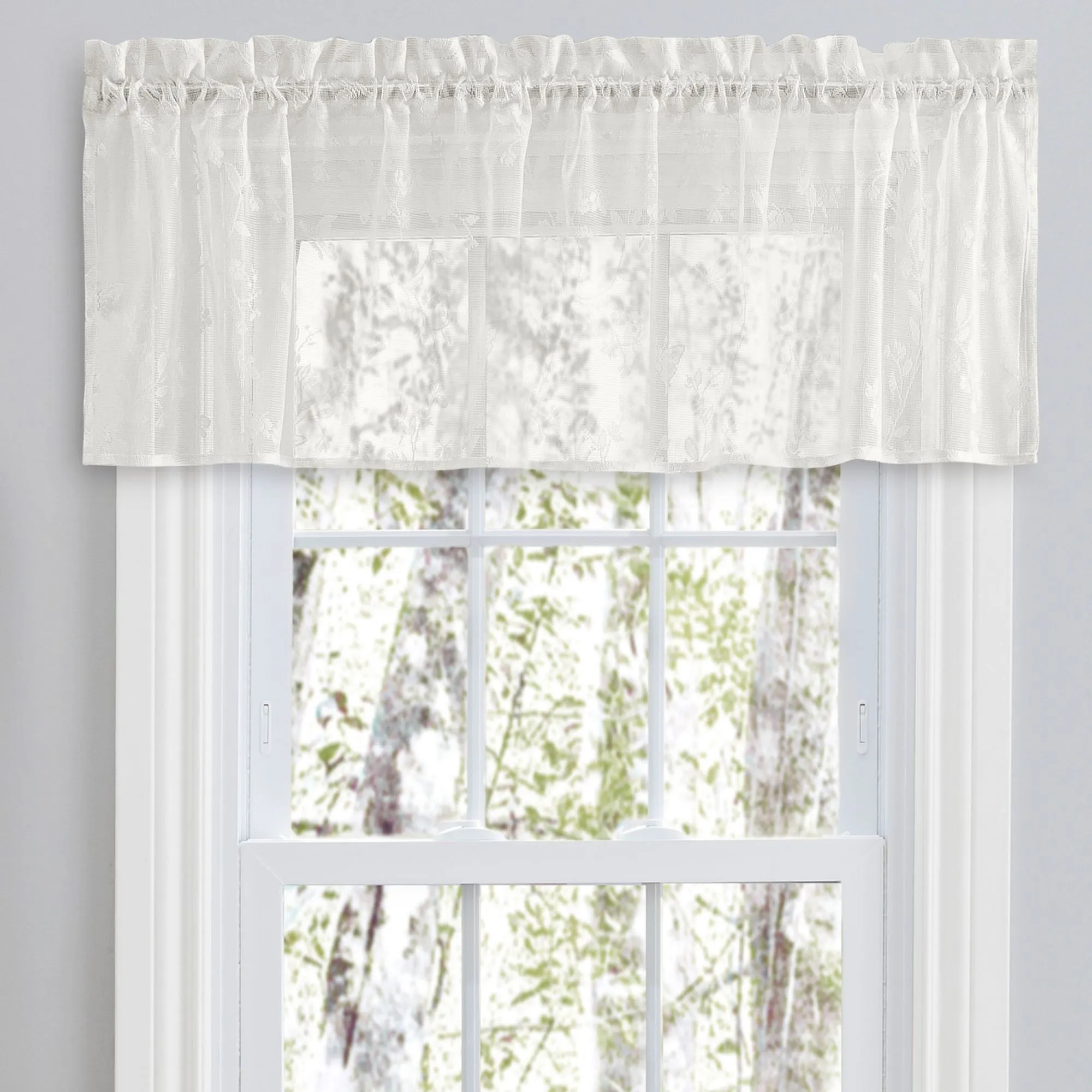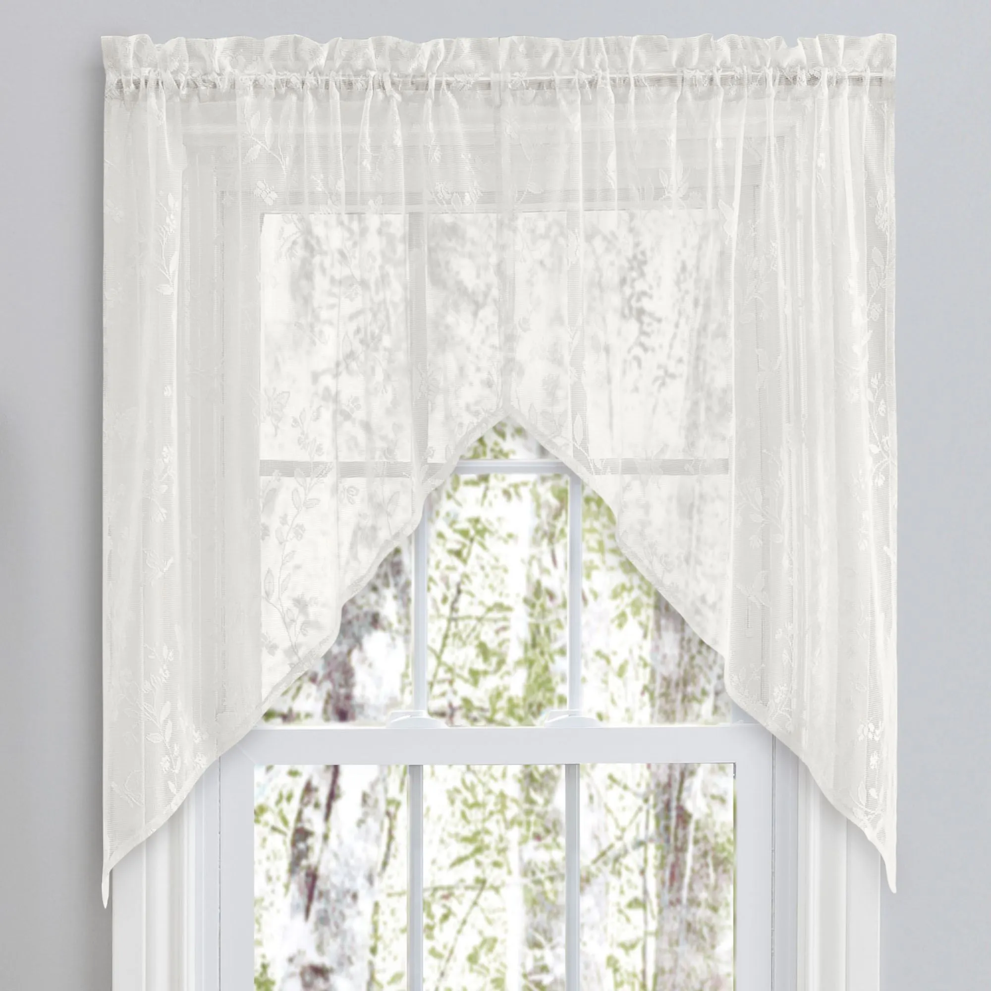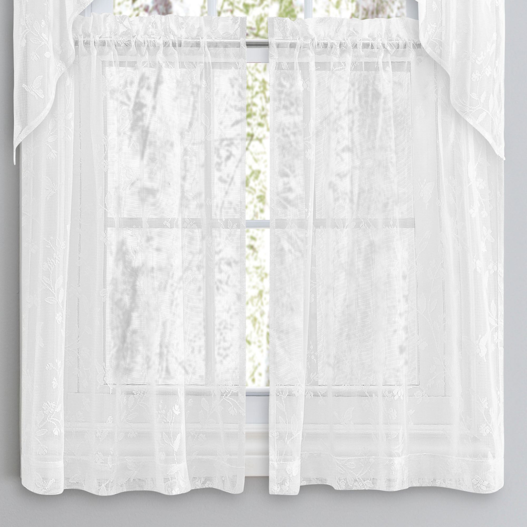 The flitting path of a Springtime Butterfly may zip past your view year round with this charming tier window treatment. In a lace design, the polyester window accents feature butterflies among the branches. Rod pockets are 1.5". Each window treatment measures 52"W. Specify Tier Pair or Tailored Valance; sorry, the Swag Valance Pair is no longer available. Swag Valance Pair is 36"L. Tailored Valance is 14"L. Machine washable. Imported.