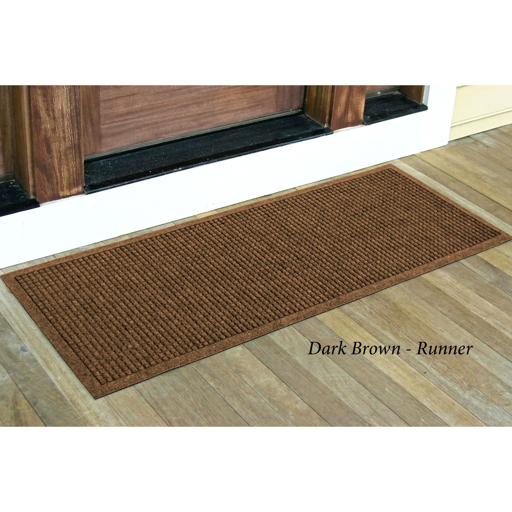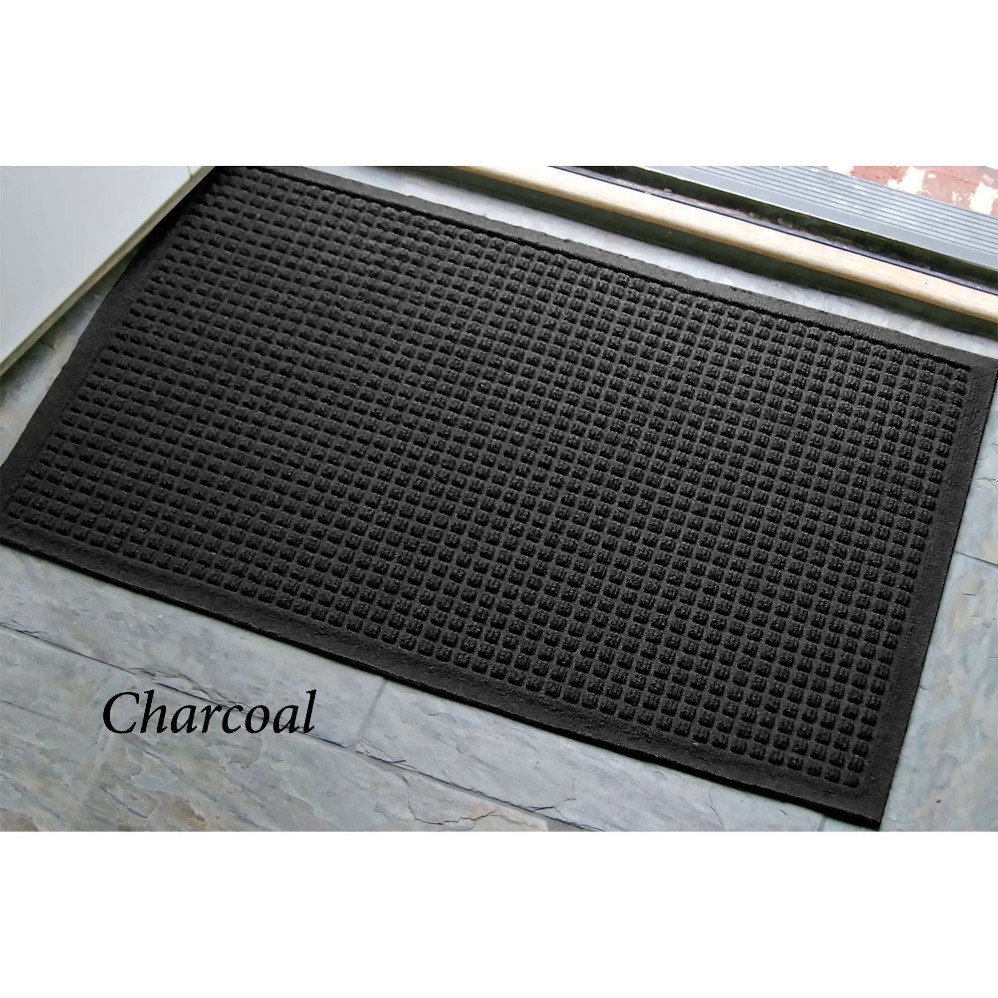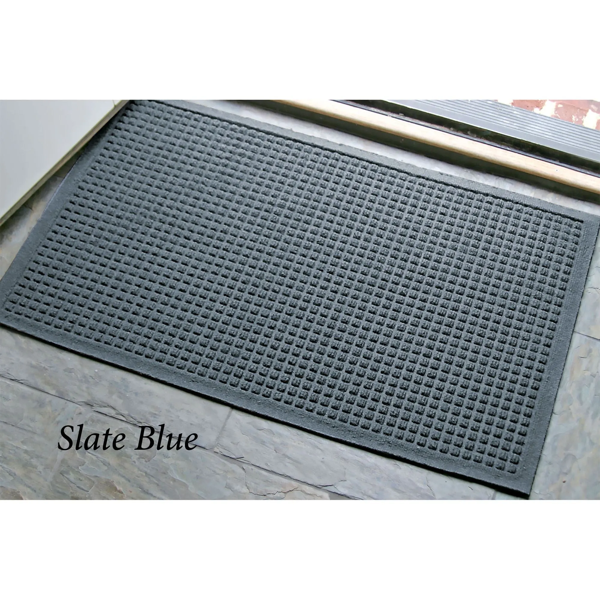 The Squares Indoor/Outdoor Doormat adds classic style and convenience to your entryway with simplistic square motifs. The antistatic PET polyester fiber floor accent has a nonskid SBR rubber backing that is slip-resistant and certified by the National Floor Safety Institute. The WaterHog(R) exclusive Water Dam border keeps dirt and water on the mat and not your floor. The premium-grade mat is mildew-, mold-, and rot-resistant. Specify Dark Green, Burgundy, Charcoal, Dark Brown, Gray, Khaki, Navy, or Slate Blue. Doormat is 35"x23". Indoor use or outdoor use year round. Hose off to clean.