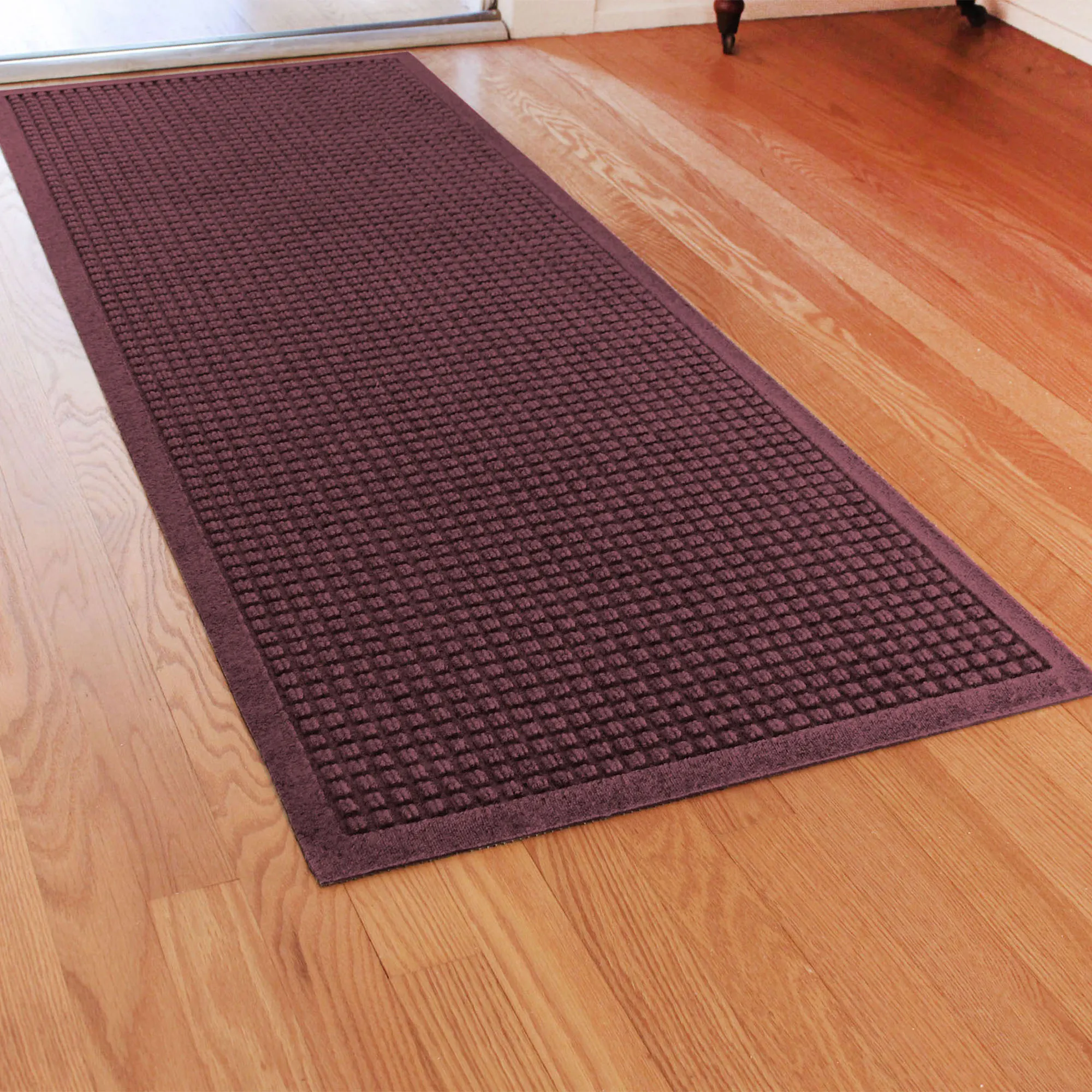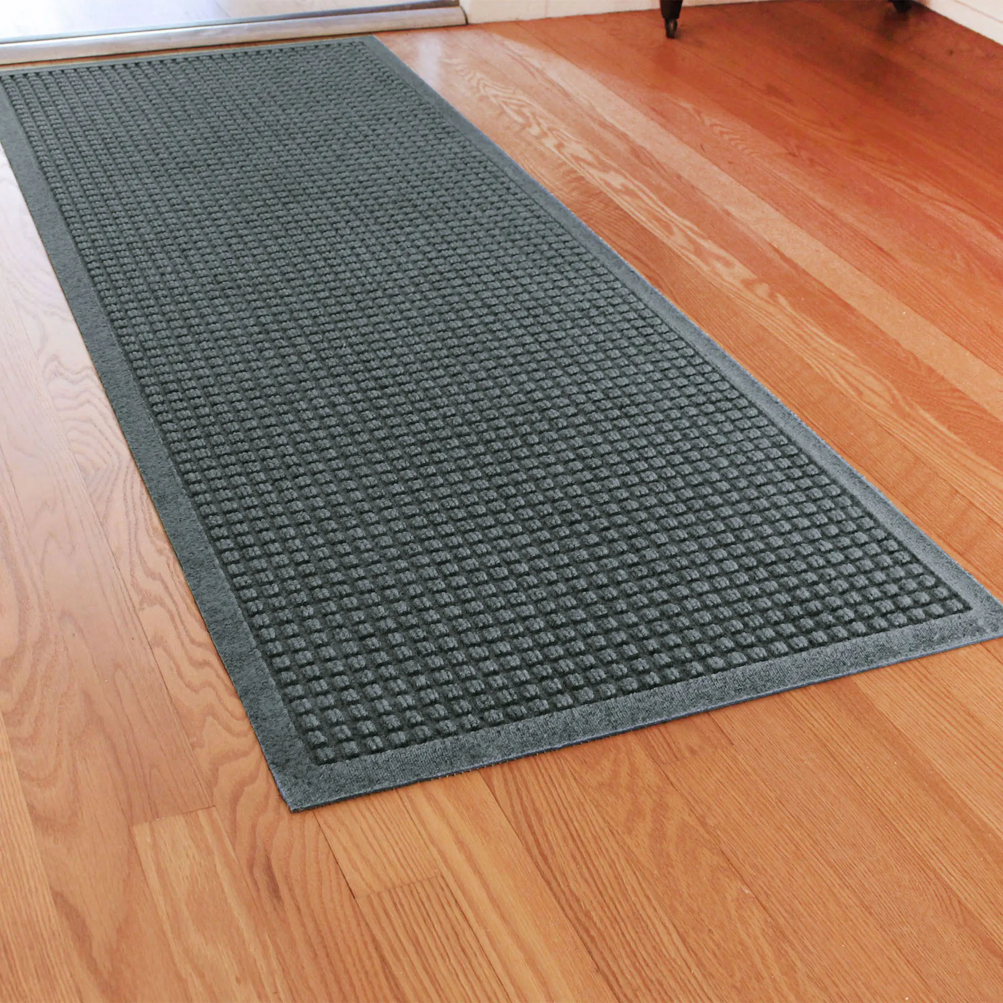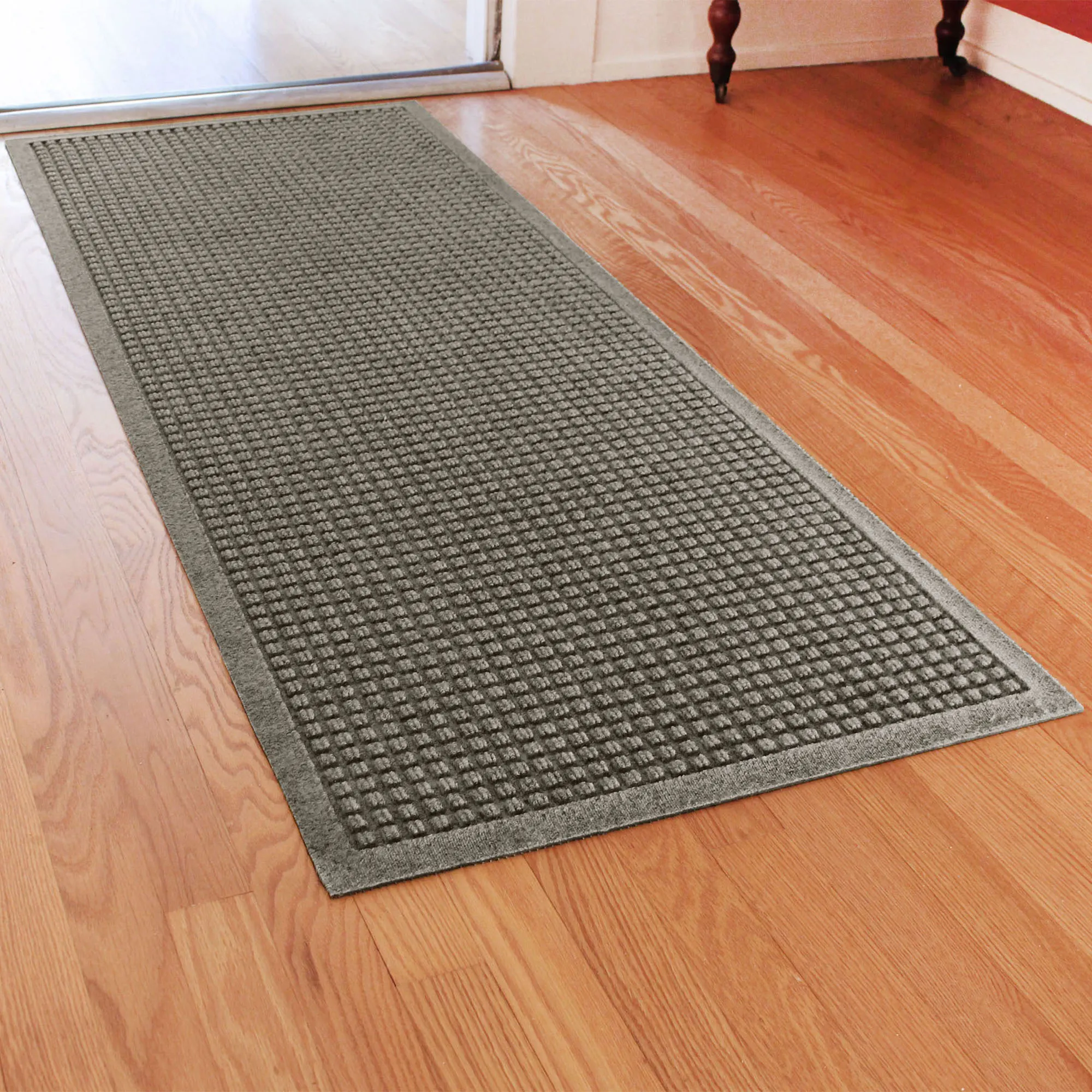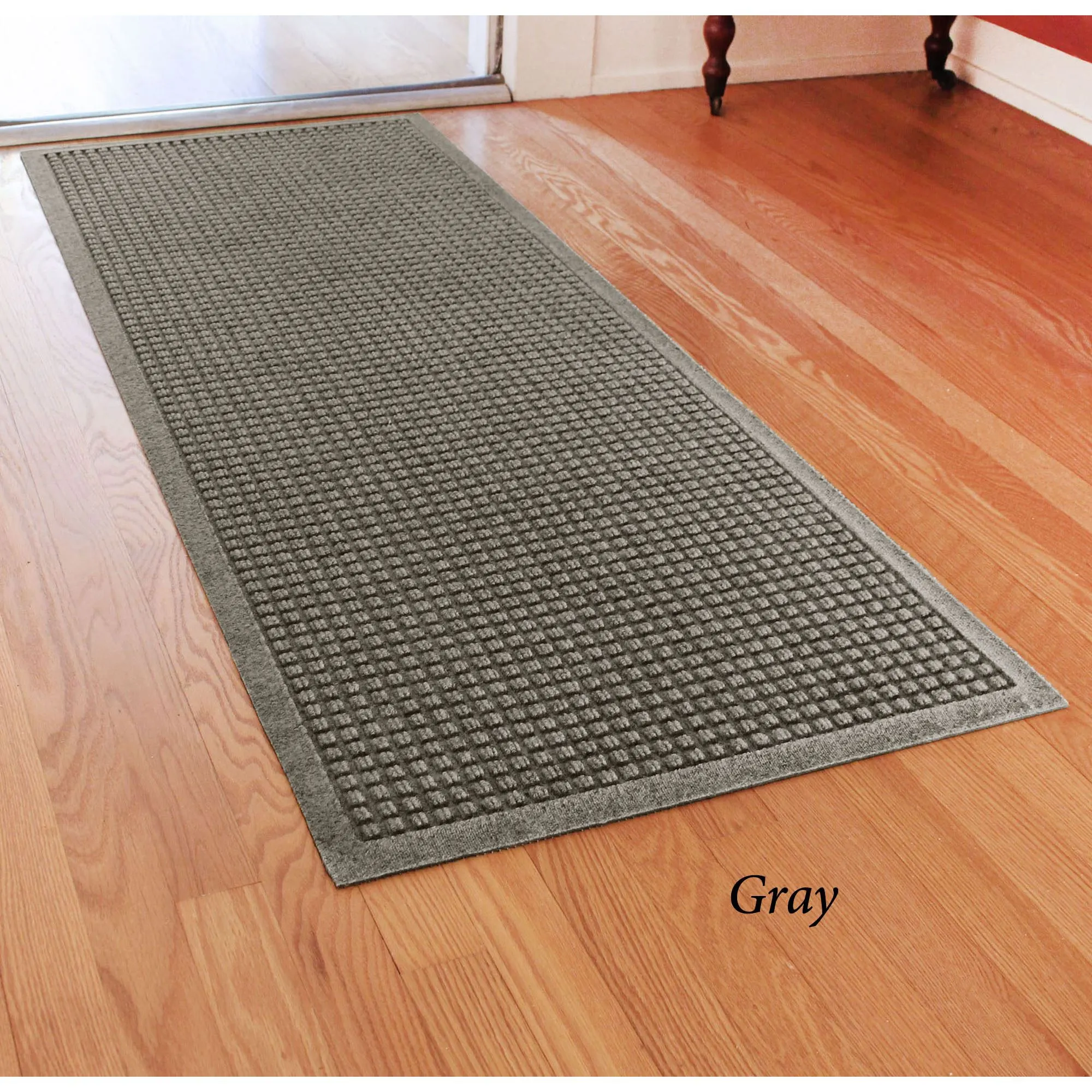 The Squares Indoor/Outdoor Runner Mat adds classic style and convenience to your entryway with simplistic square motifs. The antistatic PET polyester fiber floor accent has a nonskid SBR rubber backing that is slip-resistant and certified by the National Floor Safety Institute. The WaterHog(R) exclusive Water Dam border keeps dirt and water on the mat and not your floor. The premium-grade mat is mildew-, mold-, and rot-resistant. Specify Khaki, Burgundy, Charcoal, Dark Brown, Dark Green, Gray, Navy, or Slate Blue. Runner is 60"x22". Indoor use or outdoor use year round. Hose off to clean.