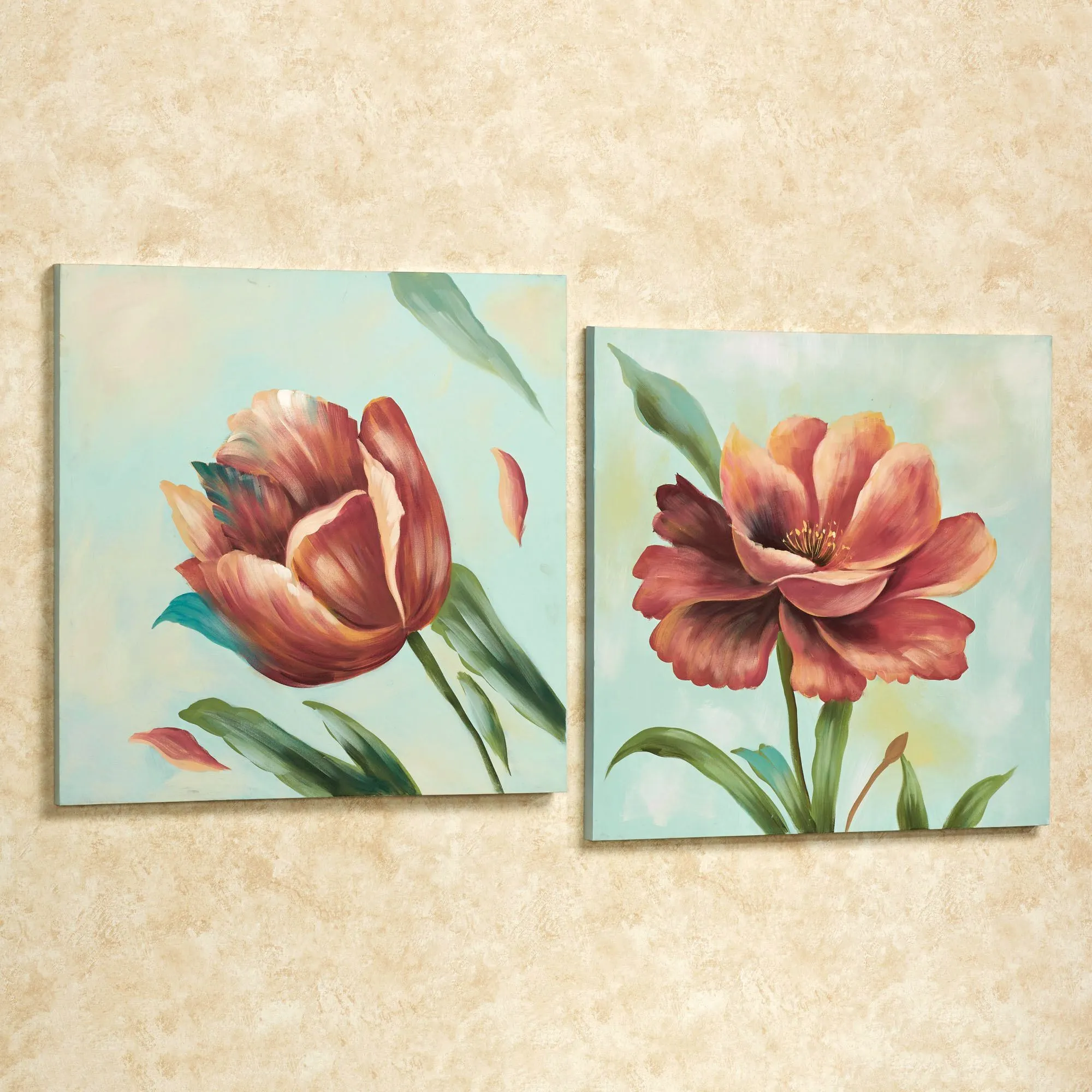 The Spring Blossom Floral Canvas Wall Art Set features two handpainted oils: a tulip and a poppy, both in cranberry shades with a mix of ruby and terra cotta and sage green leaves. The background is spring green with splashes of ivory and multi-pastel colors. Canvases are stretched over wooden frames. Each floral canvas measures 24"sq.x1.5"D.