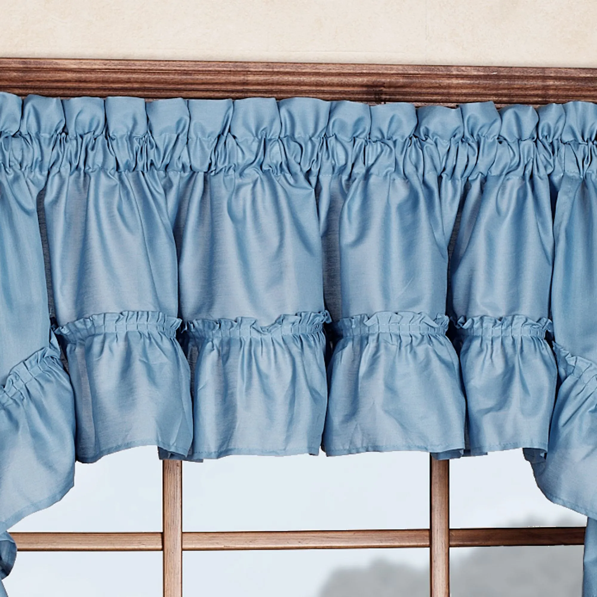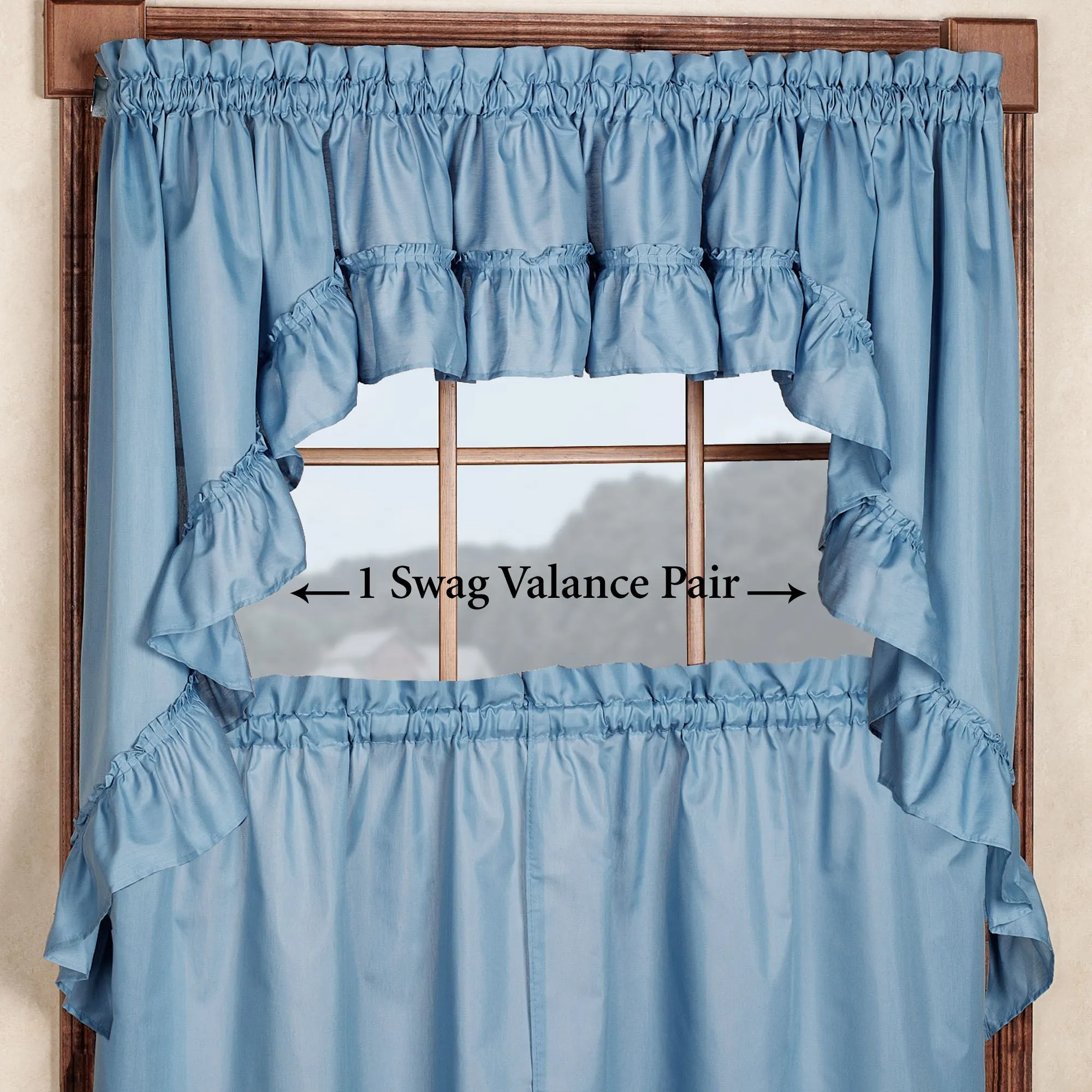 The Stacey Solid Color Tier Window Treatment is a simple way to give your window a frilly makeover. This solid color, polyester/cotton window treatment will bring cheer to any room. Valances have ruffled edges. Specify Tailored Tier Pair, Swag Valance Pair, or Filler Valance. Window treatment has 1.5" rod pockets. Machine wash. Imported.