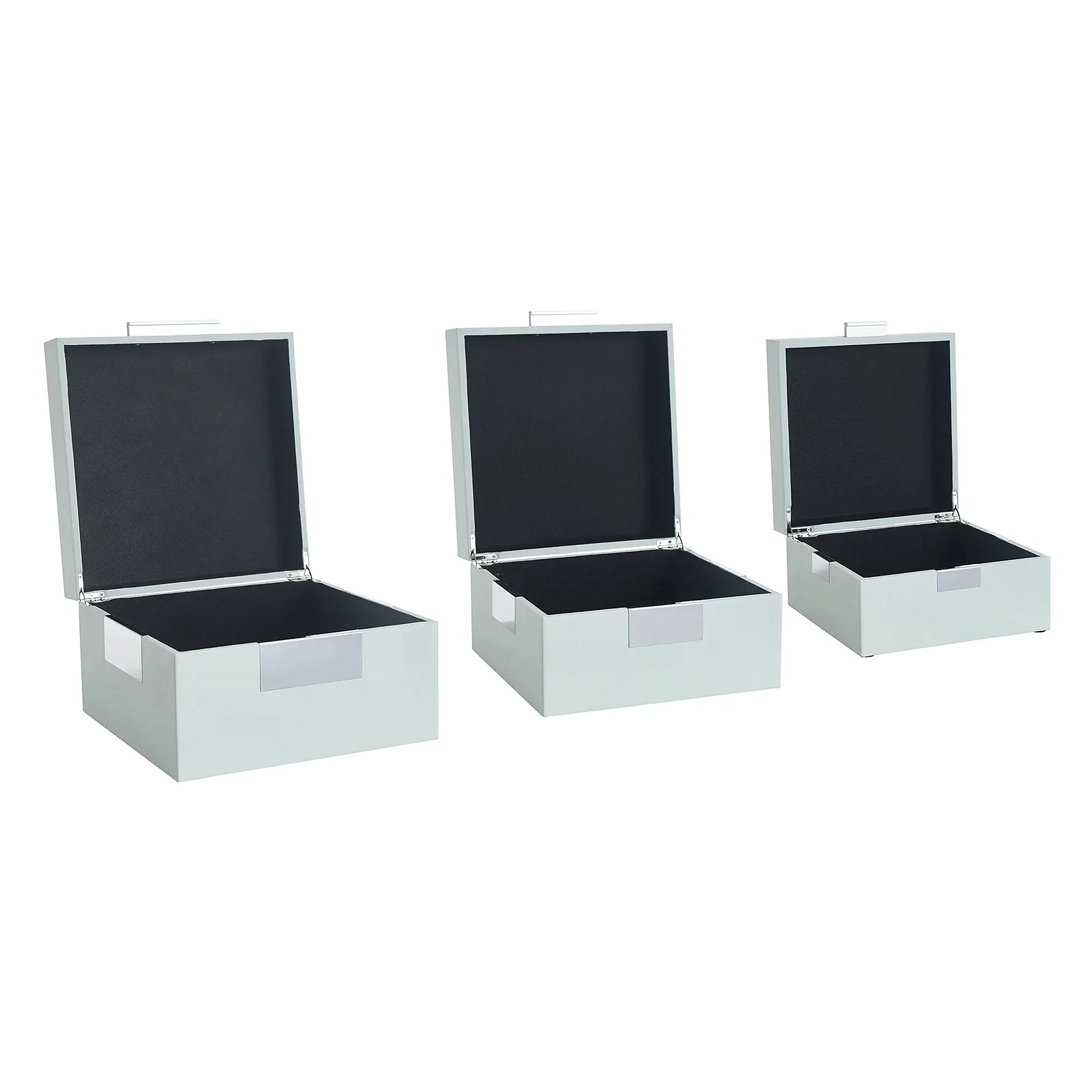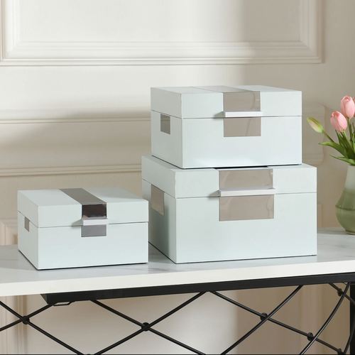 Display the Spa Blue Stacked Decorative Box Set wherever you would like. This charming, wooden box set, designed by Norman Wyatt, is covered with spa blue leather fabric and has brushed silver metal accents. Lined boxes can nest neatly inside of one another when not in use. Large is 12"sq.x7"H; medium is 10.5"sq.x6"H; small is 9"sq.x5"H.
