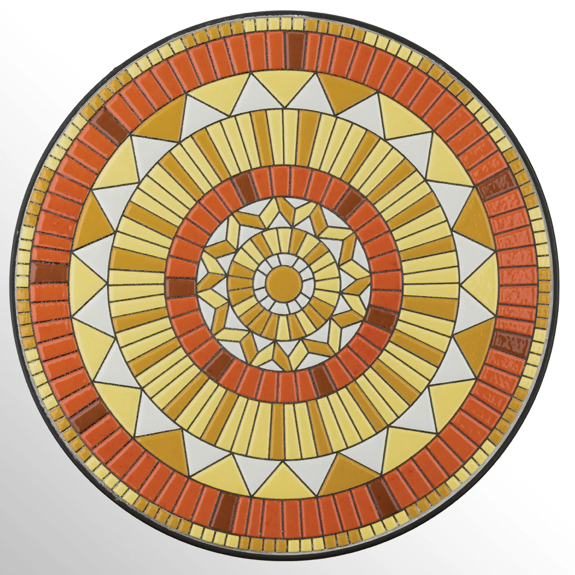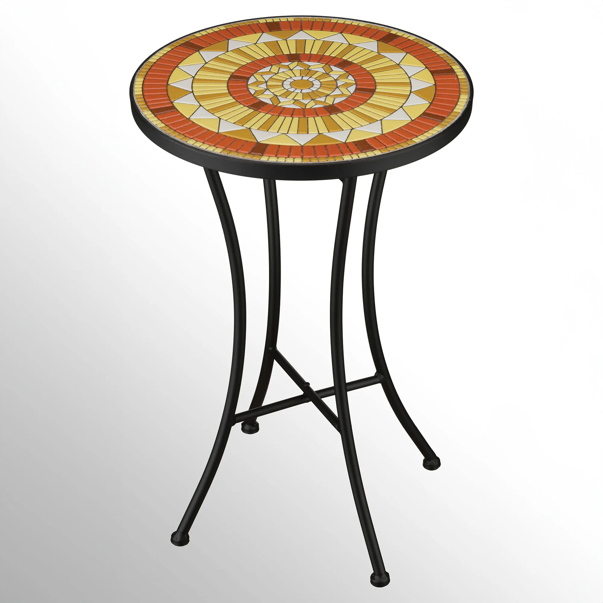 The Starburst Outdoor Accent Table displays a radiant design. Colors of gold, yellow, white, orange, and black create the pretty mosaic motif on the weighted ceramic top. Black tubular metal legs provide a durable base. The multipurpose table can be used as a side table or plant stand. Indoor or outdoor year-round use. Measures 14"dia.x21"H.