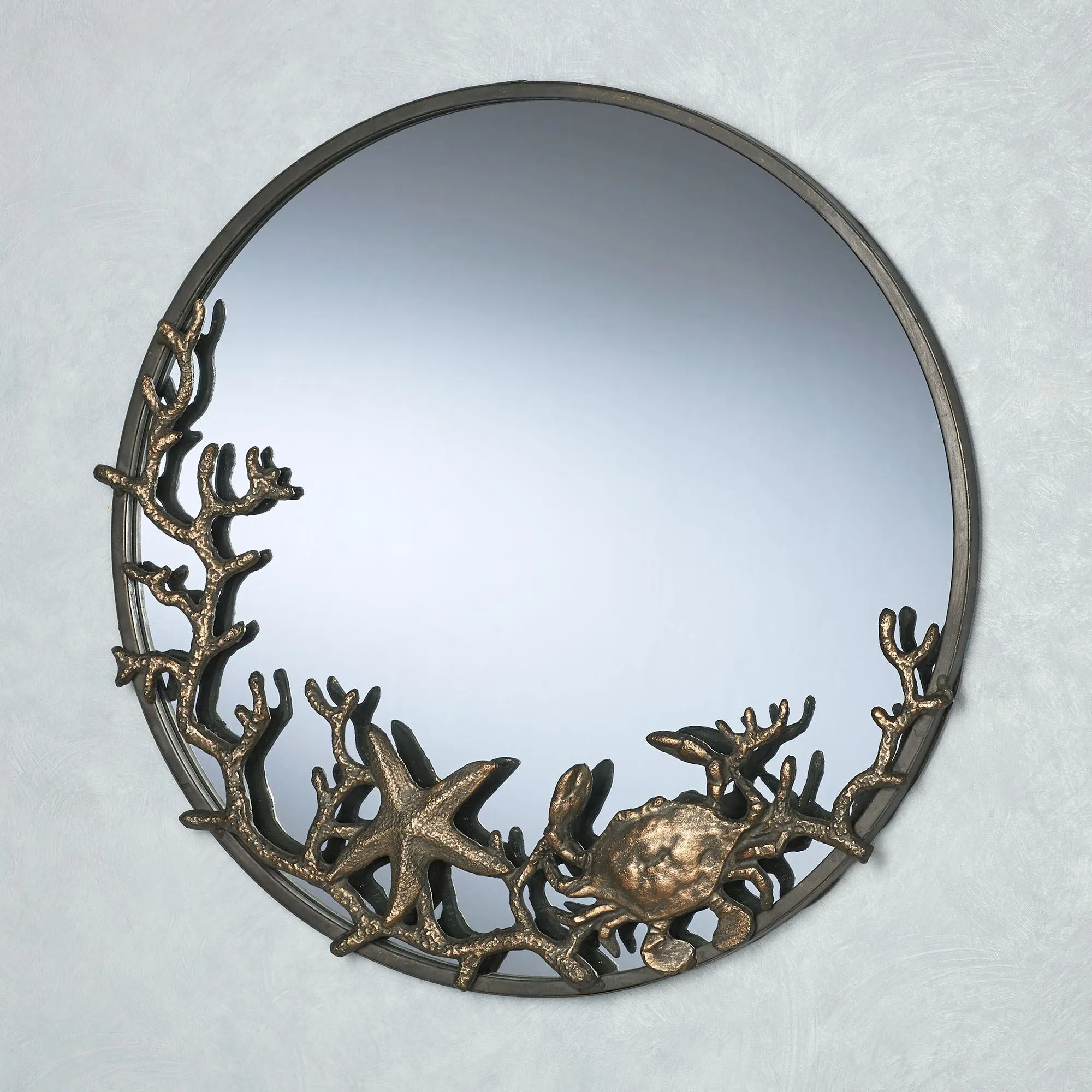 The Starfish and Crab Round Wall Mirror transports you to the ocean floor. Finished in aged bronze with gold highlights, the mirror features a cast iron frame and center glass mirror adorned with reaching coral, a starfish, and a crab. Measures 22"dia.x2"D.