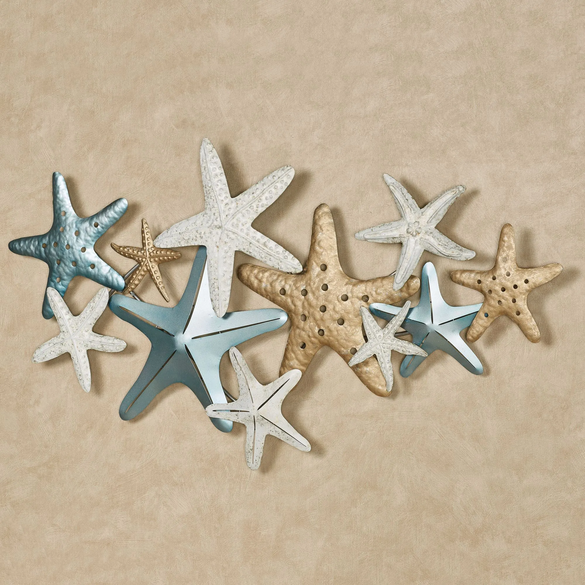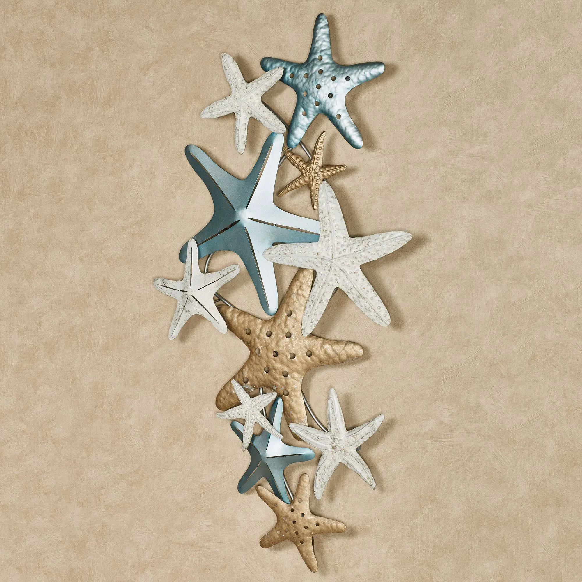 Wish upon the Starfish Collage Metal Wall Art for a beautiful coastal vibe to wash over your home. Handpainted in metallic blue, satin gold, and ivory with gold detailing, the dimensional metal starfish feature various patterns, textures, and sizes to create a dimensional array that hangs horizontally or vertically. Starfish wall art measures 43"Wx2.5"Dx24"H.