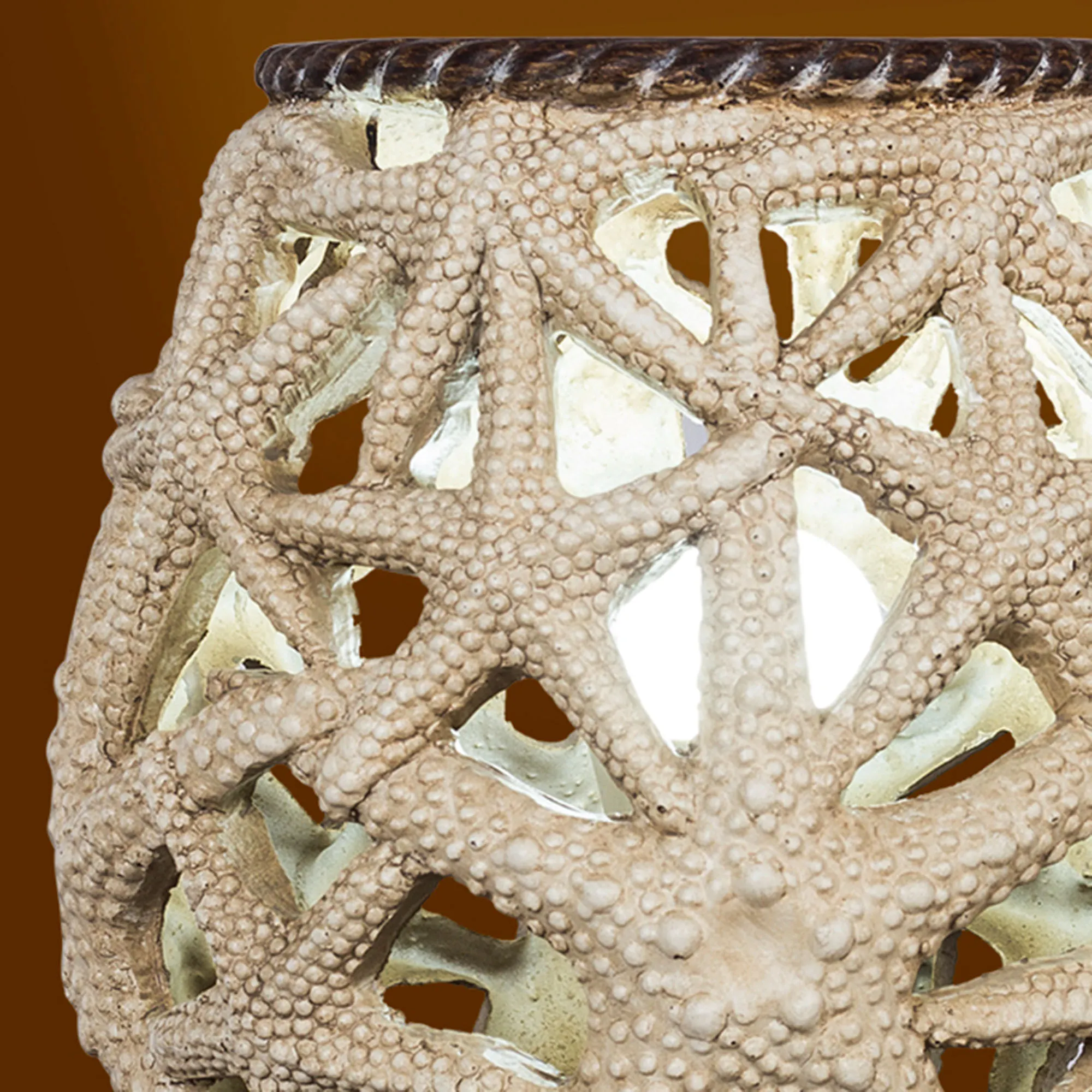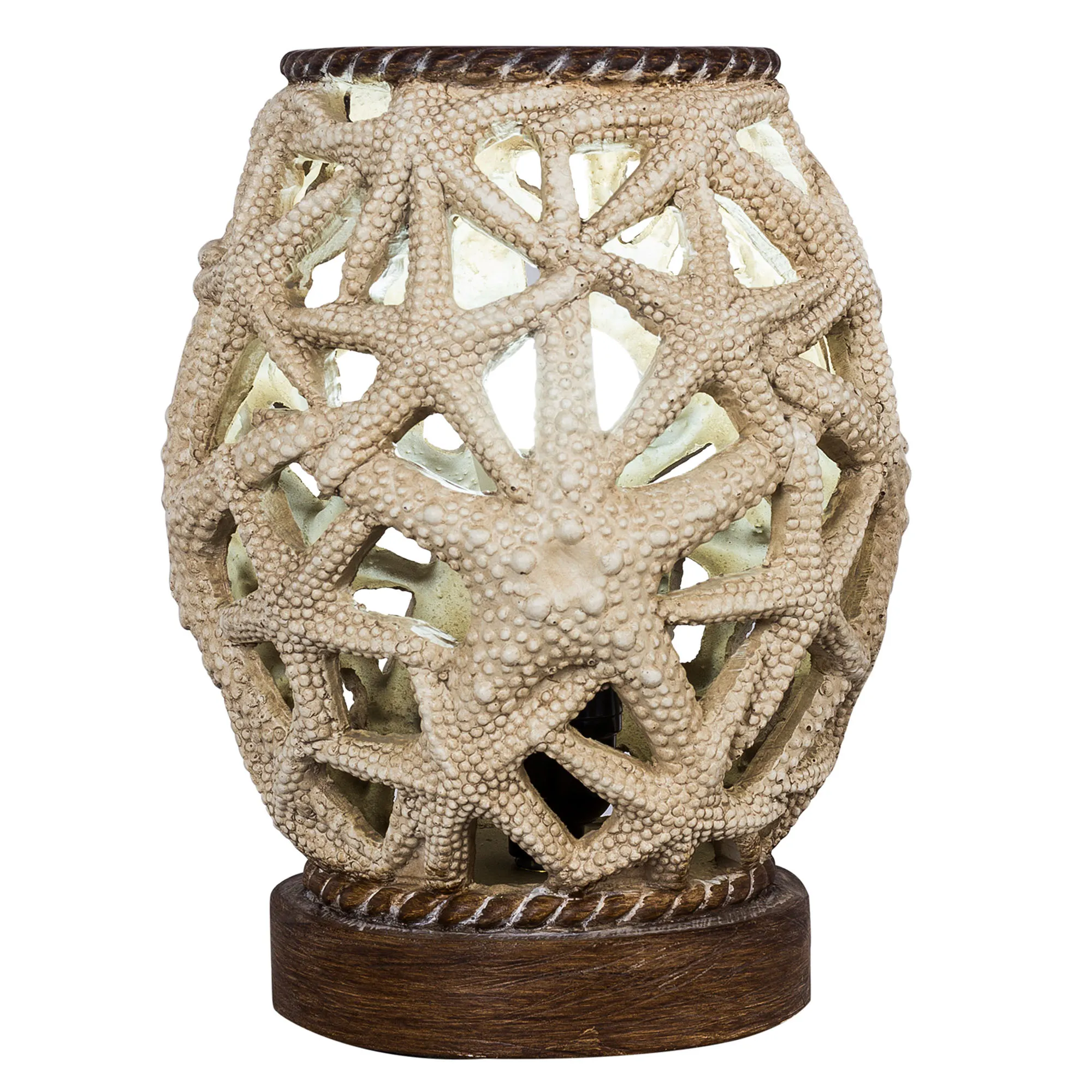 The Starfish Uplight Accent Lamp glows with the wonder of ocean depths. Detailed with a brown base and twisting rope-like accents, the openwork resin lamp features a variety of overlapping starfish in natural beige and ivory tones. UL listed. Requires one 40W max. bulb that operates via the in-line switch. Overall, the charming starfish accent lamp measures 9"dia.x10"H.