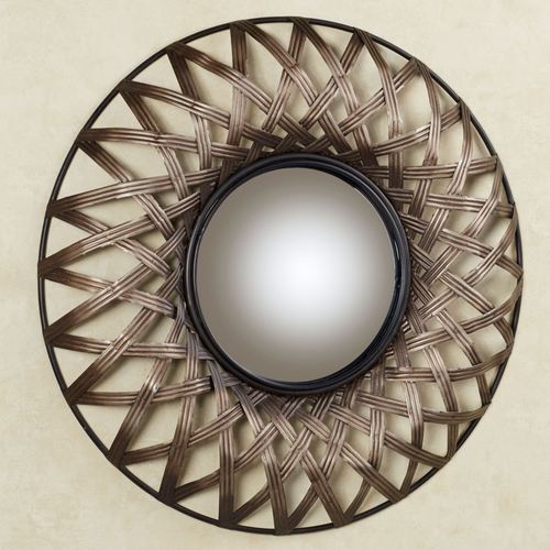 Ribbed designs crisscross around a center convex mirror, adding dimension, depth, and abstract volume to the Stark Mirrored Wall Art. Finished in beige-brown, each metal strip surrounds the mirror's black frame in a loose weave. Measures 27"dia.x3"D.