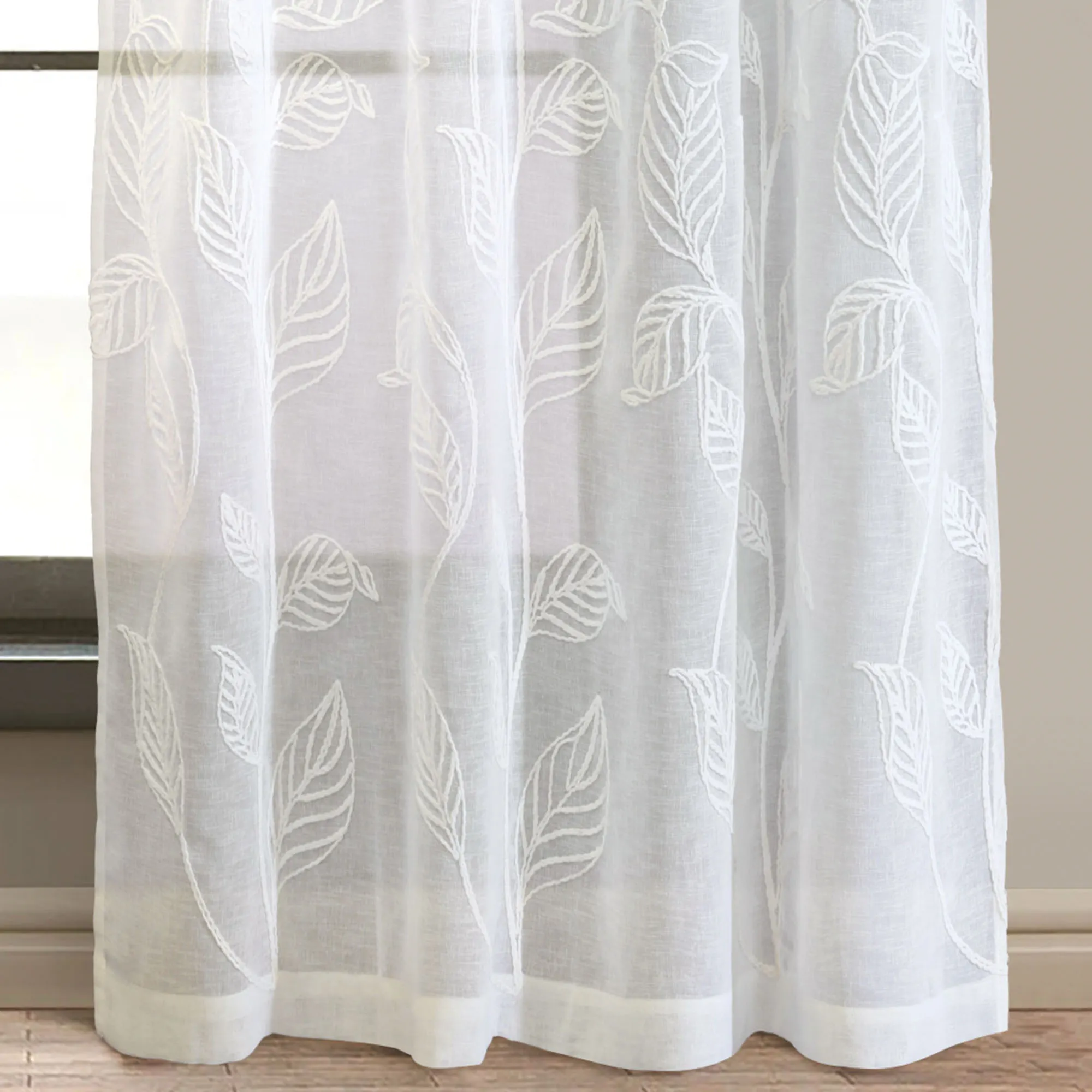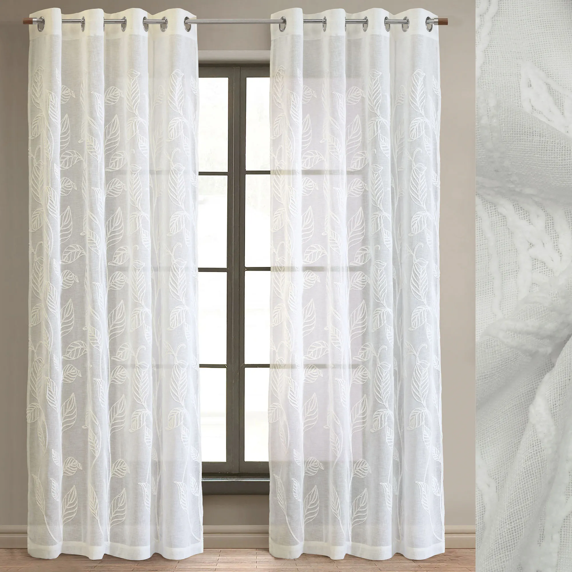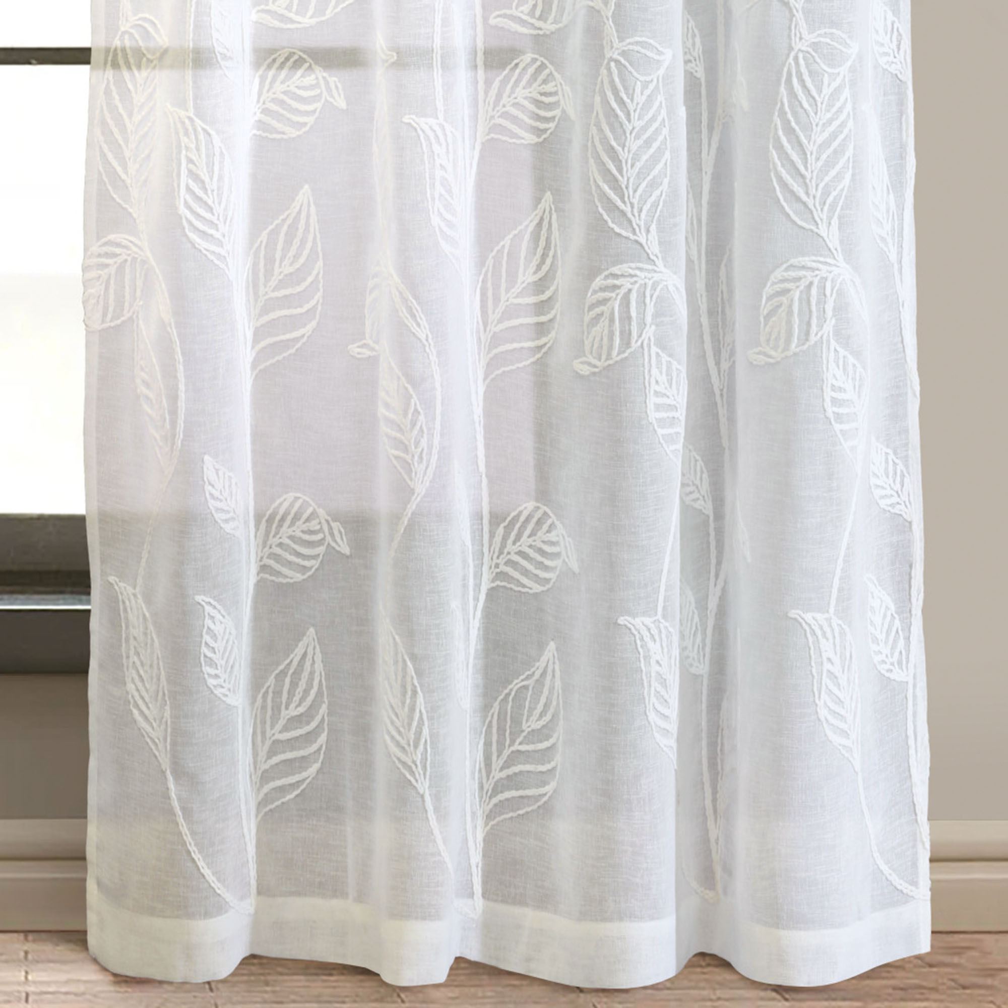 Stellata Embroidered Leaves Off White Sheer Grommet Curtain Panel