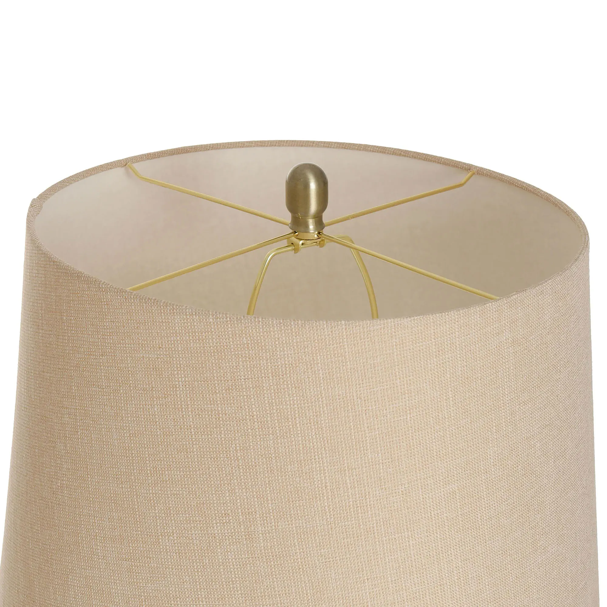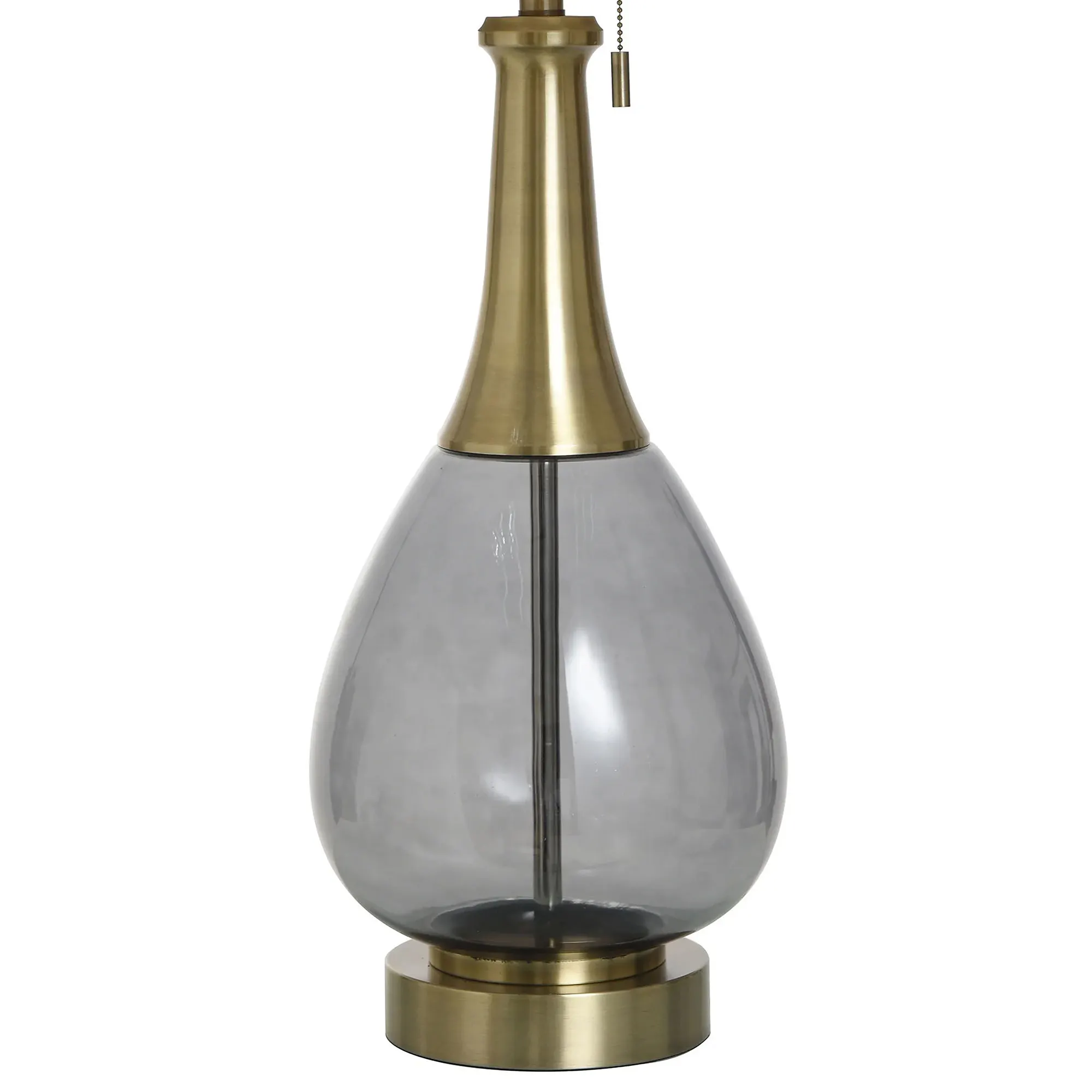 Charm shapes the Stockton Gray Table Lamp with an alluring grace. Mounted on a round, brass-finished steel base, the unique font features translucent gray glass with a shaped bottleneck brass topper. A beige, cotton/polyester shade and 1.5"H brass finial add stylish complements. UL listed. Requires a 100W max. bulb that operates via the pull-chain illumination. Overall, the table lamp measures 18"dia.x37"H.