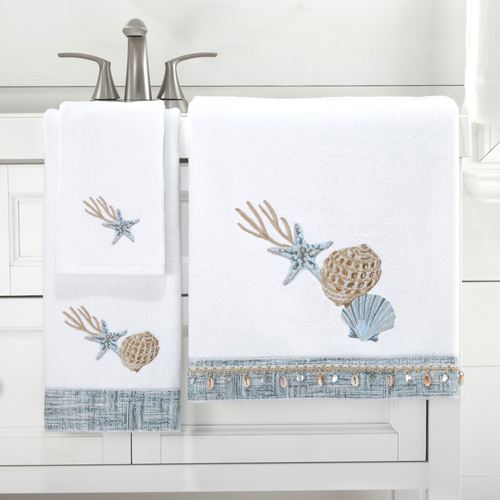 Pristine shells await beneath the waves of Stone Harbor. Embroidered in blue, tan, and silver hues, charming coral, starfish, and shells decorate this white cotton velour towel set. Bath and hand towels are pieced with a woven mingled blue hem band. Gimp trim with dangling shells and sequins also embellishes the bath towel. Set includes a bath towel, 27"x50"; a hand towel, 16"x28"; and a fingertip towel, 11"x18". Machine washable. Imported.