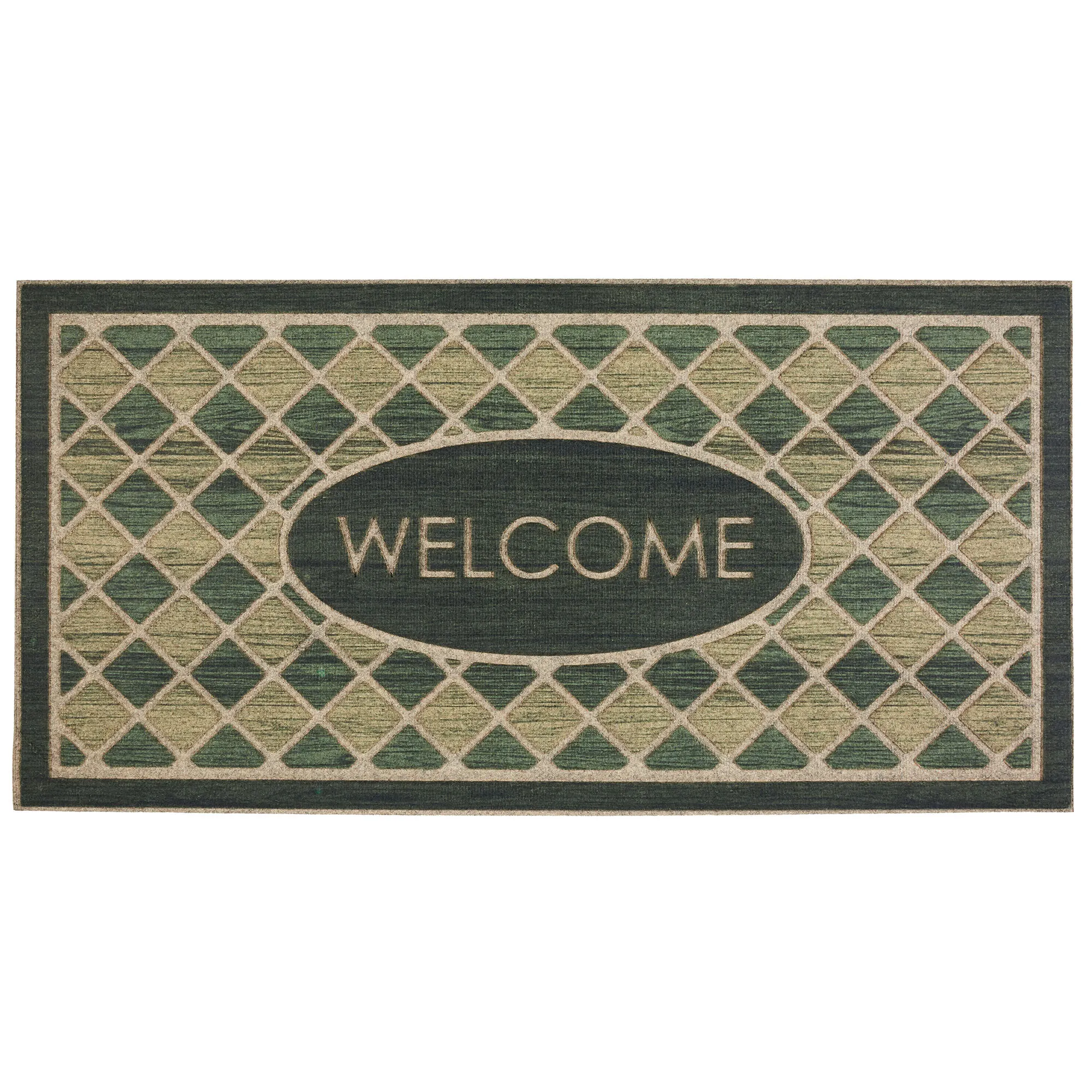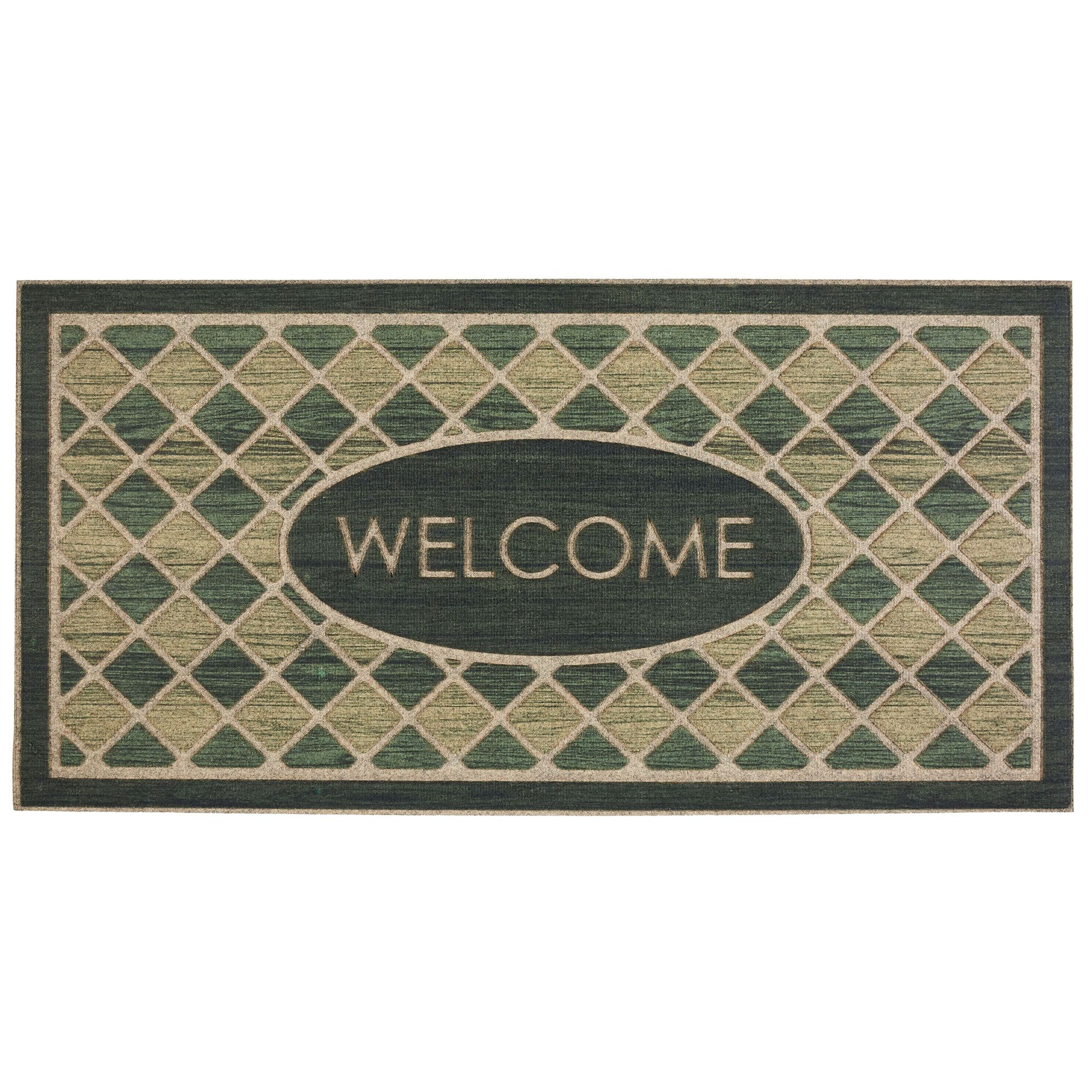 The Stone Welcome Impressions Doormat decorates with a stately style. This recycled rubber doormat, .3" thick, features molded shapes in a diamond pattern with a woodgrain look and the word "Welcome" in the center. Colors include shades of green, natural, and light gold. This durable mat is perfect in high-traffic areas. The textured, heat-transferred polyester surface fiber provides secure traction in all weather conditions, it effectively absorbs excess water, and it helps to remove dirt from shoes before it is tracked indoors. Stain-, fade-, and slip-resistant mat is suitable for indoor or outdoor year-round use. One-year limited manufacturing defects warranty. Measures 48"x24". Hose off with water to clean.