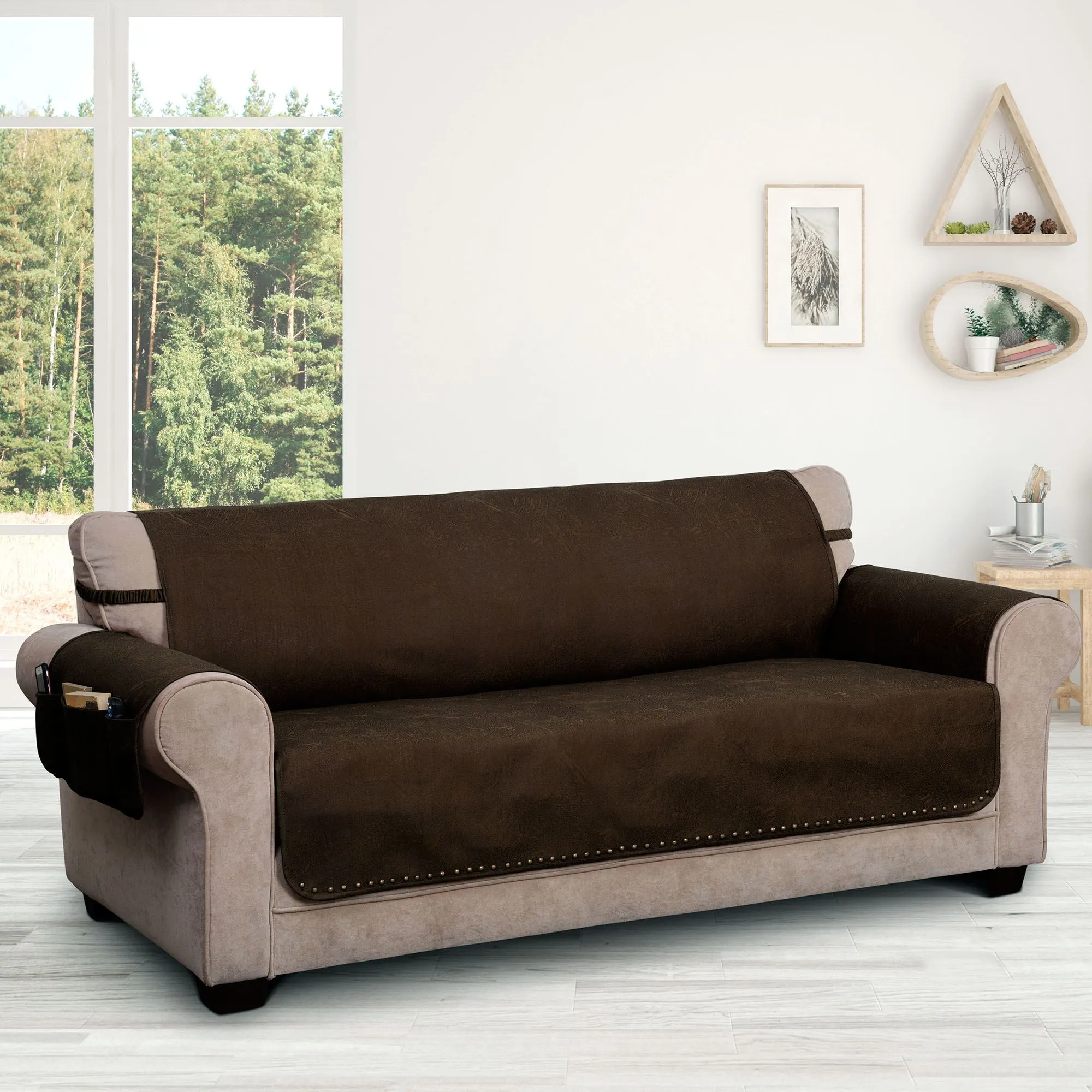 Sit back and relax knowing that spills and stains are no match for the Stonehill Chocolate Furniture Protector. This polyester cover is chocolate faux leather with antique brass metal nailhead trim on the lower edge. Furniture cover has longer arm coverage, tuck flaps, a slip-resistant backing, and three side pockets on the right arm flap. Center pocket is 7"W; the two side pockets are 3"W each. The furniture protector has two covered elastic straps, 17"L each. Choose Loveseat Cover, Sofa Cover, or Extra-Long Sofa Cover. Machine washable. Imported. Click on the Sizes tab for measurements.