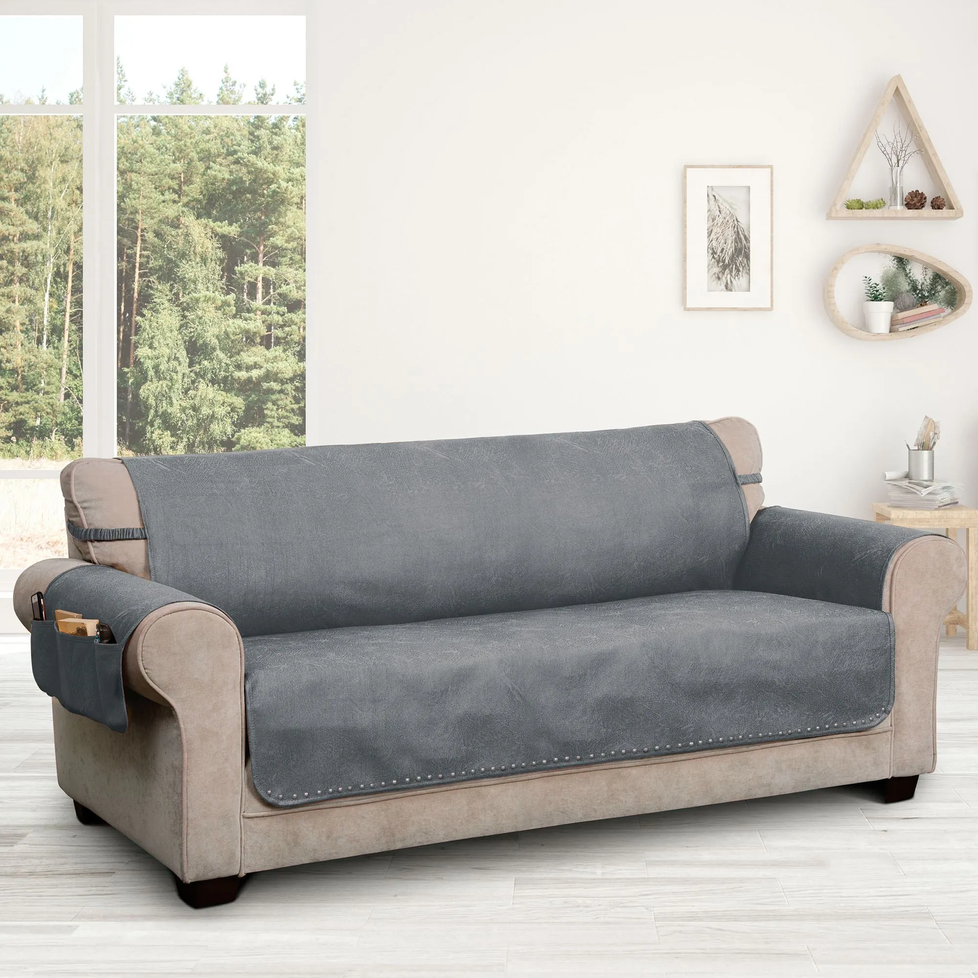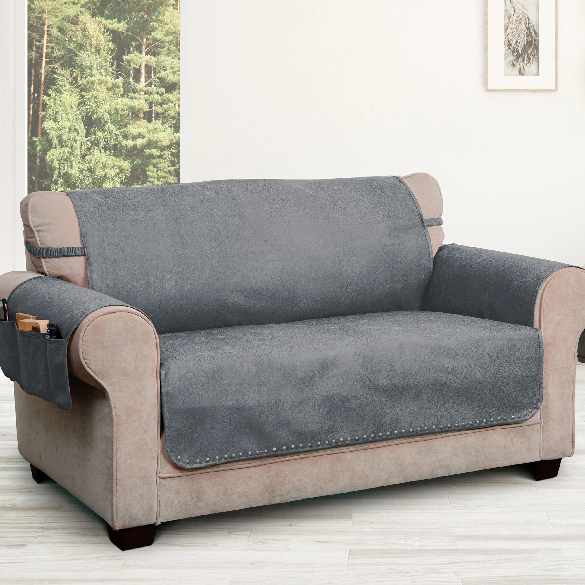 Sit back and relax knowing that spills and stains are no match for the Stonehill Dark Gray Furniture Protector. This polyester cover is dark gray faux leather with silver metal nailhead trim on the lower edge. Furniture cover has longer arm coverage, tuck flaps, a slip-resistant backing, and three side pockets on the right arm flap. Center pocket is 7"W; the two side pockets are 3"W each. The furniture protector has two covered elastic straps, 17"L each. Choose Loveseat Cover, Sofa Cover, or Extra-Long Sofa Cover. Machine washable. Imported. Click on the Sizes tab for measurements.