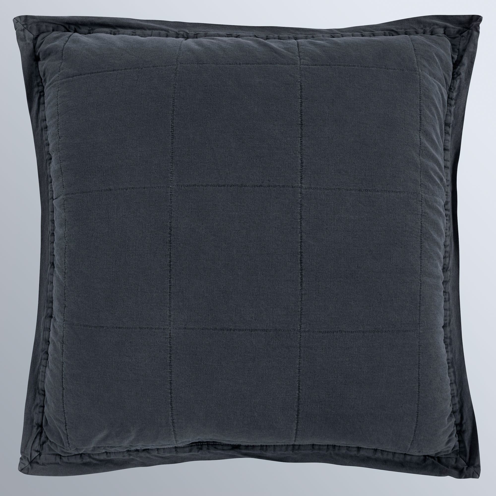 The Charcoal Stonewashed Cotton Bedding offers a relaxed vibe and true comfort to a space. The Mini Coverlet Set includes a coverlet and sham(s). Soft cotton bedding is a stonewashed charcoal solid color. Oversized coverlet has a classic oversized box-stitched design and bound edges. Backing is a coordinating solid color; fill is polyester. Reversible sham(s) has bound edges; zipper closure. Machine washable. Imported.