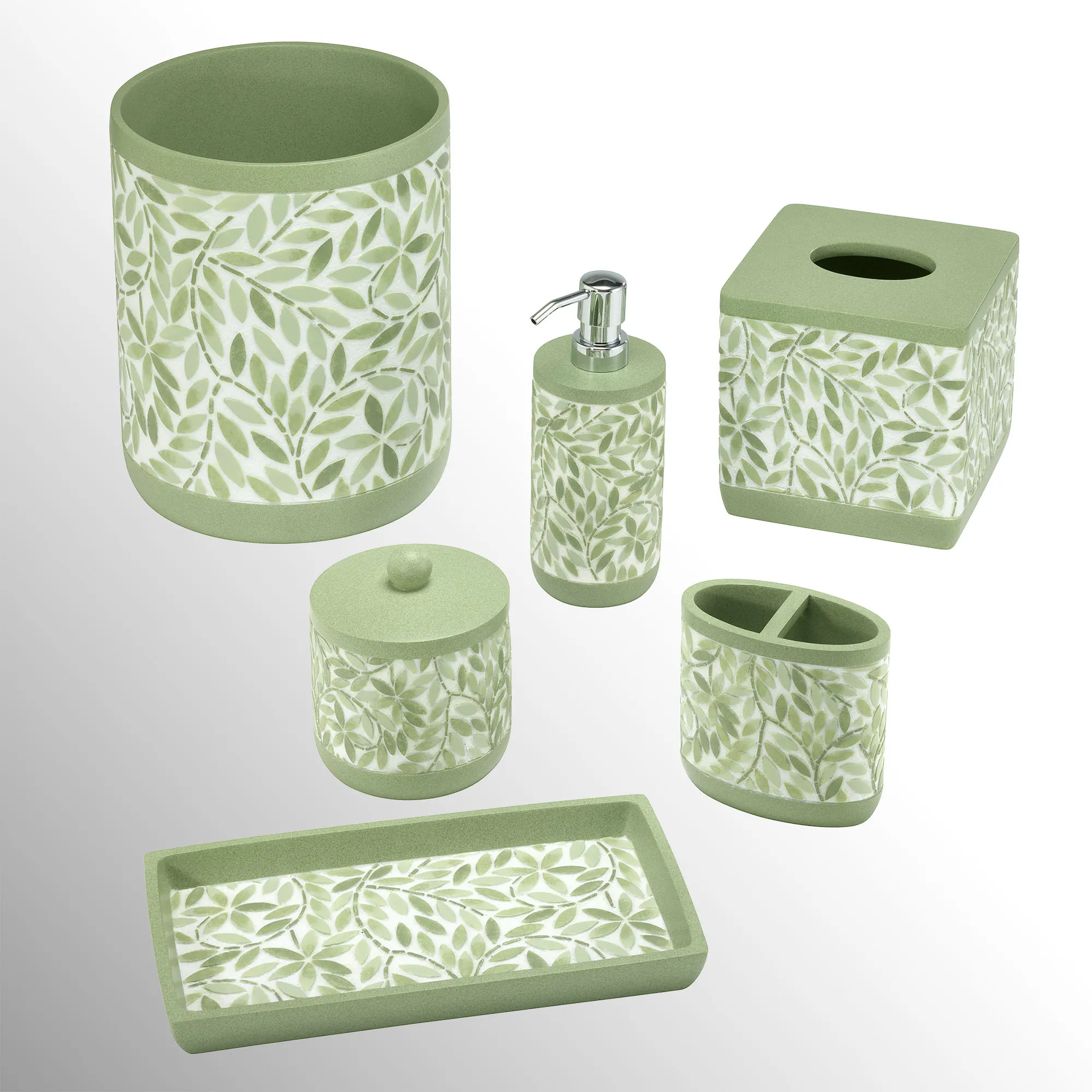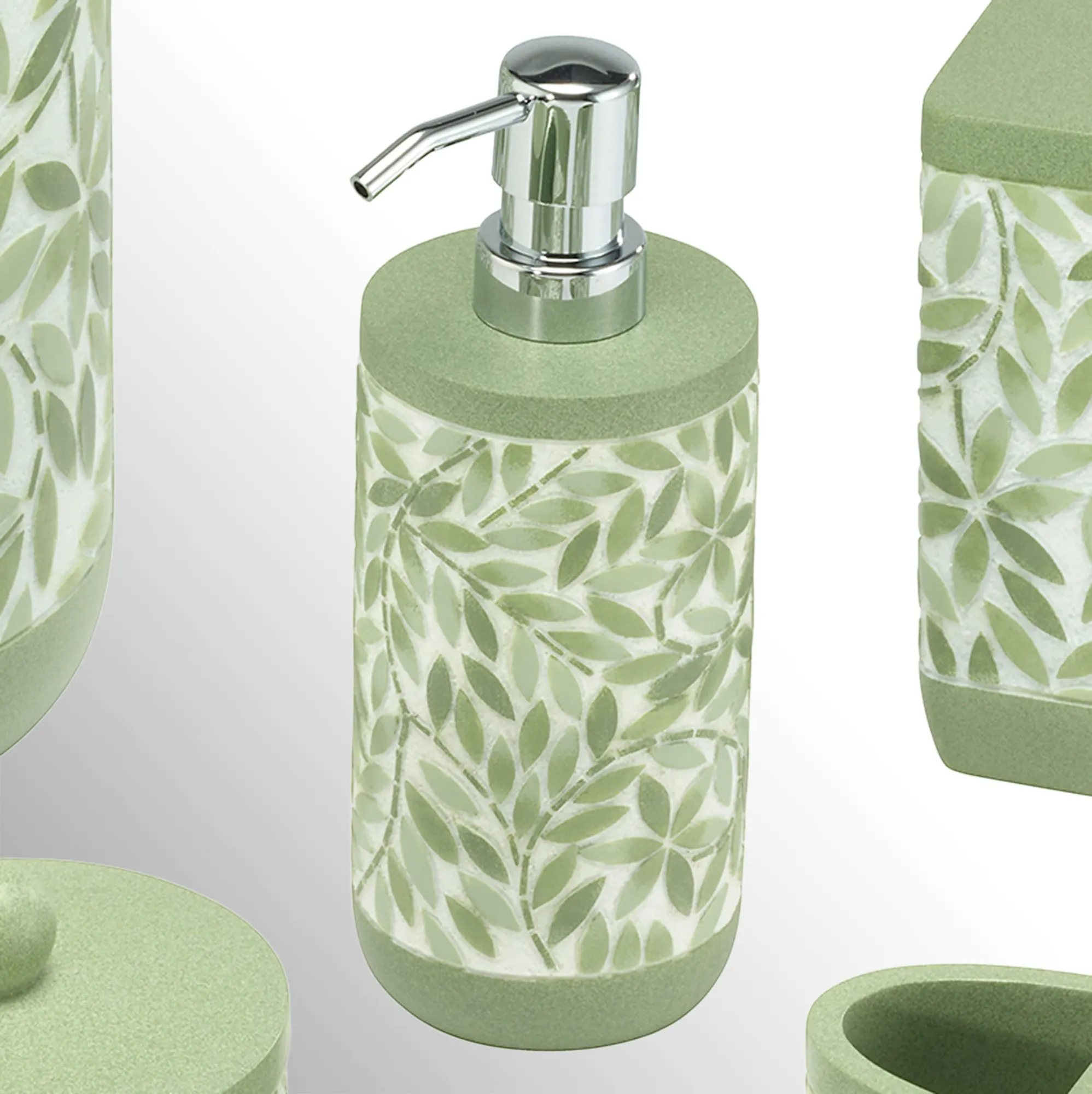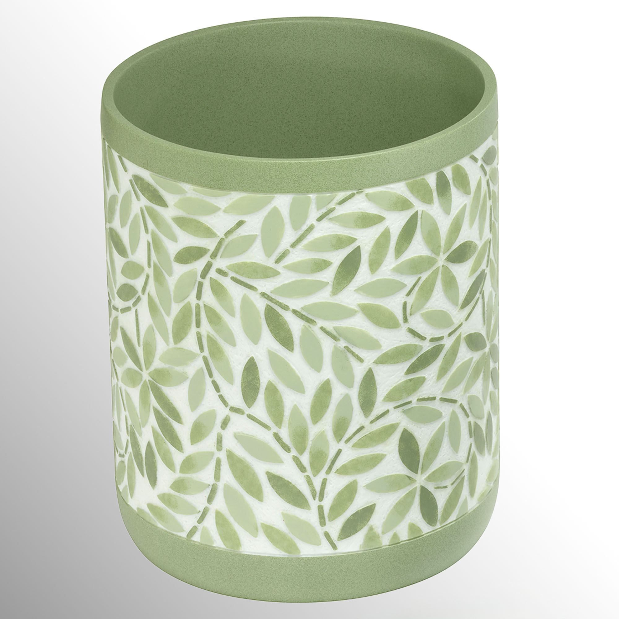 A leaf and vine design beautifully enhances the Stratford Bath Accessories. These handpainted resin accessories look charming and have a raised motif in shades of green on a white background. The Brush Holder will hold your makeup brushes or toothbrushes. Specify Wastebasket, Tray, Tissue Cover, Lotion/Soap Dispenser, Covered Jar, or Brush Holder.