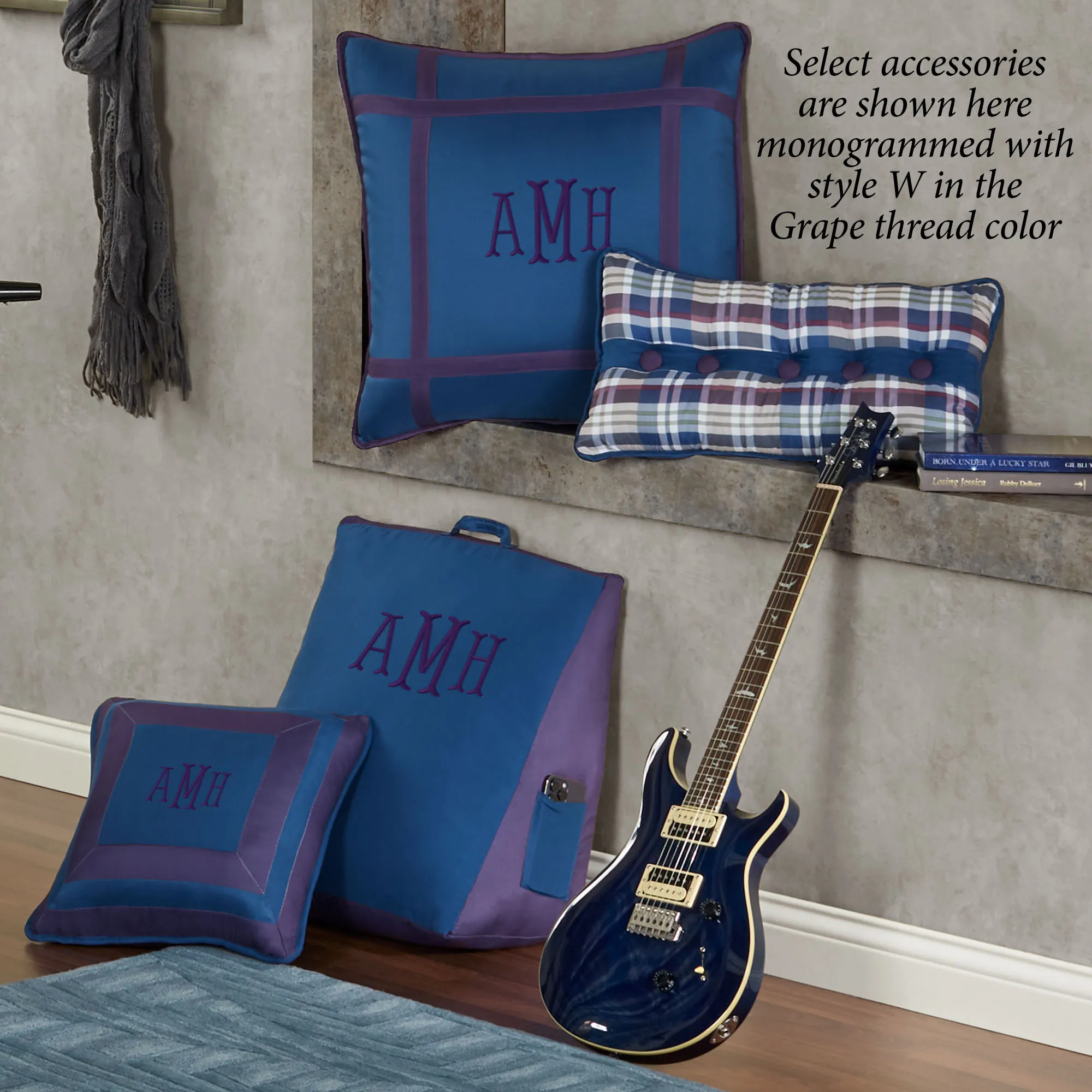 The Stratton Square Pillow, Wedge Pillow, and European Sham may be monogrammed for an extra $7 each. Monogramming is shown in the Grape thread color.