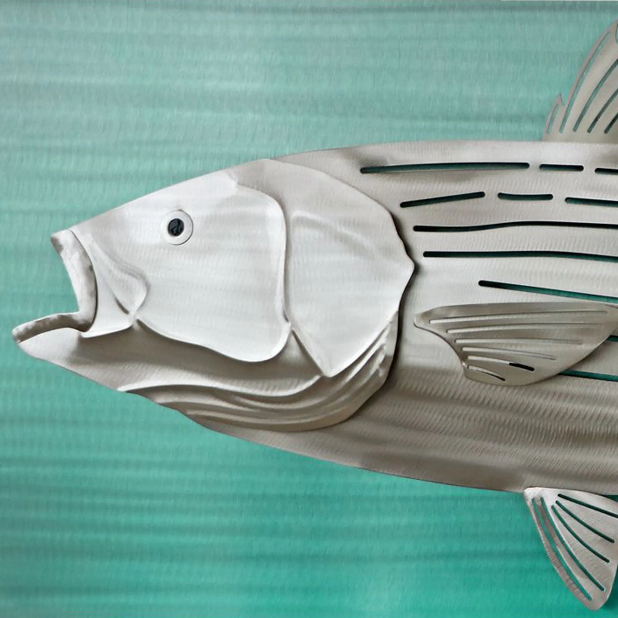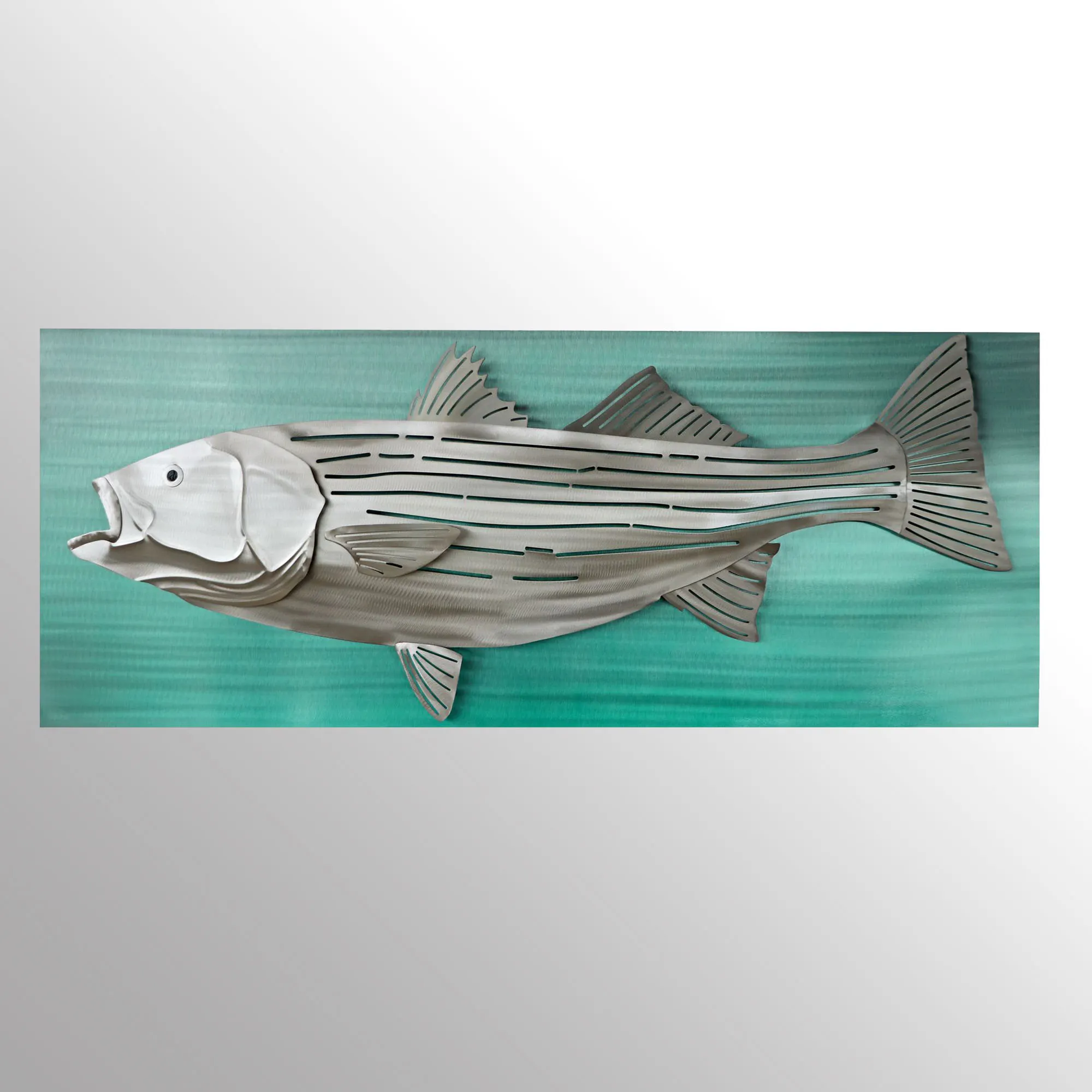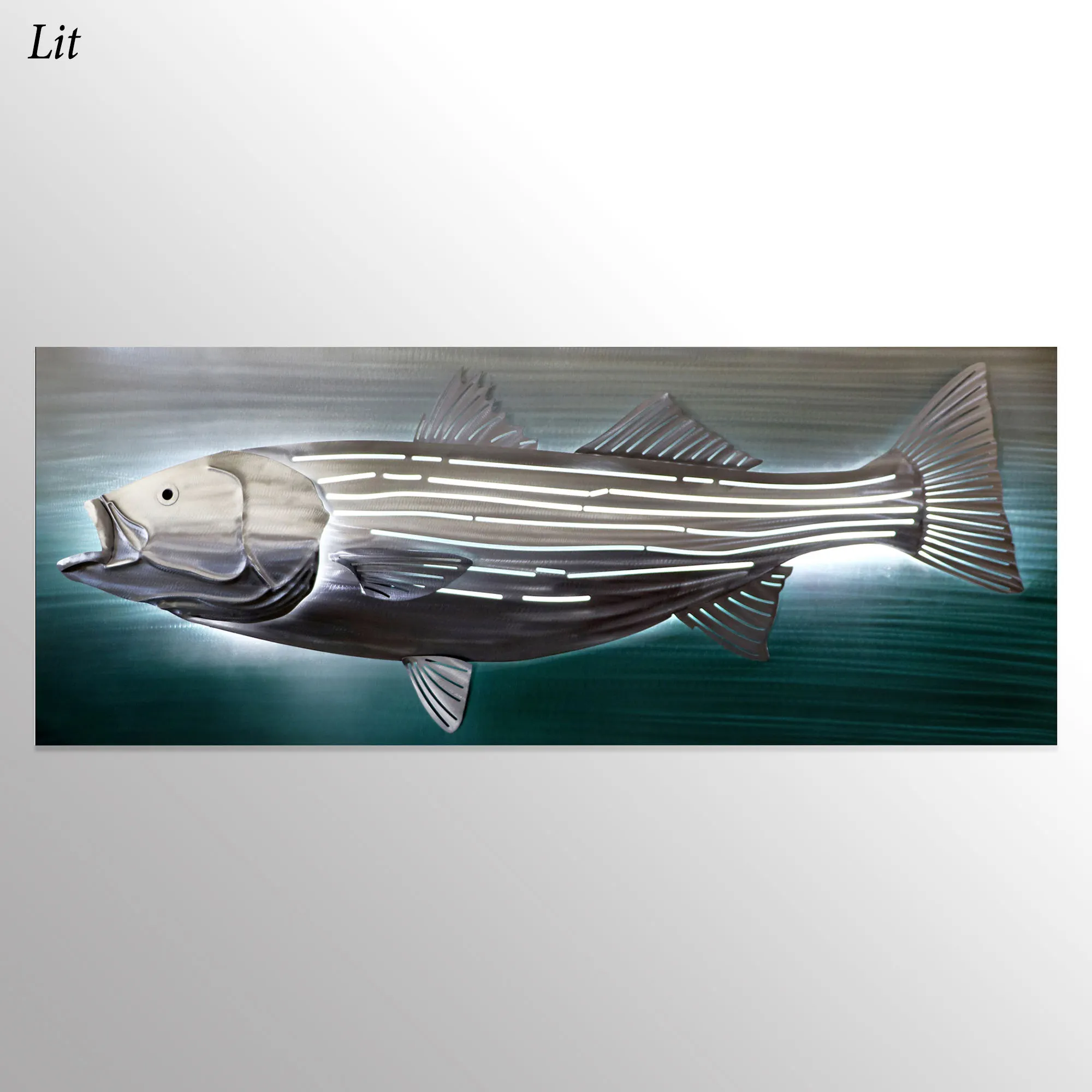 A fisherman's classic, the Striped Bass resembles a perfect catch. Captured by artist M. Malizia, the handcrafted stainless steel wall art features a hand-grinded, hand-finished, realistic striped bass with openwork and fantastic detailing. Hidden LED lights illuminate the silver fish, which pops from the hand-dyed turquoise background. UL listed. Operates from an in-line on/off switch with a dimmer; AC adapter is included. Overall, the striped bass fish wall sculpture measures 56"Wx4"Dx24"H and weighs approx. 18 lbs.
