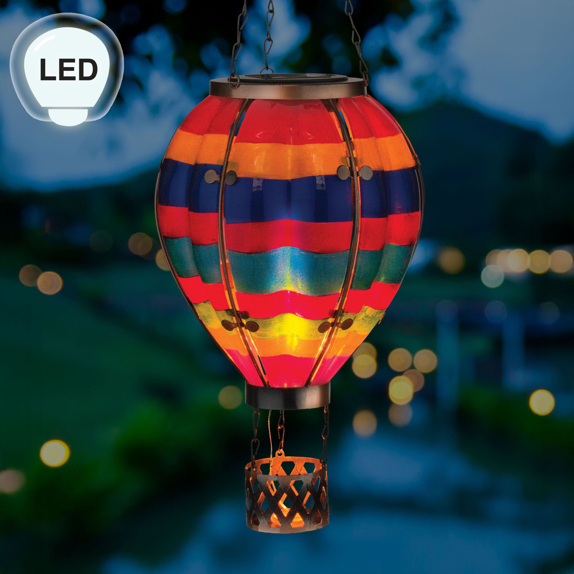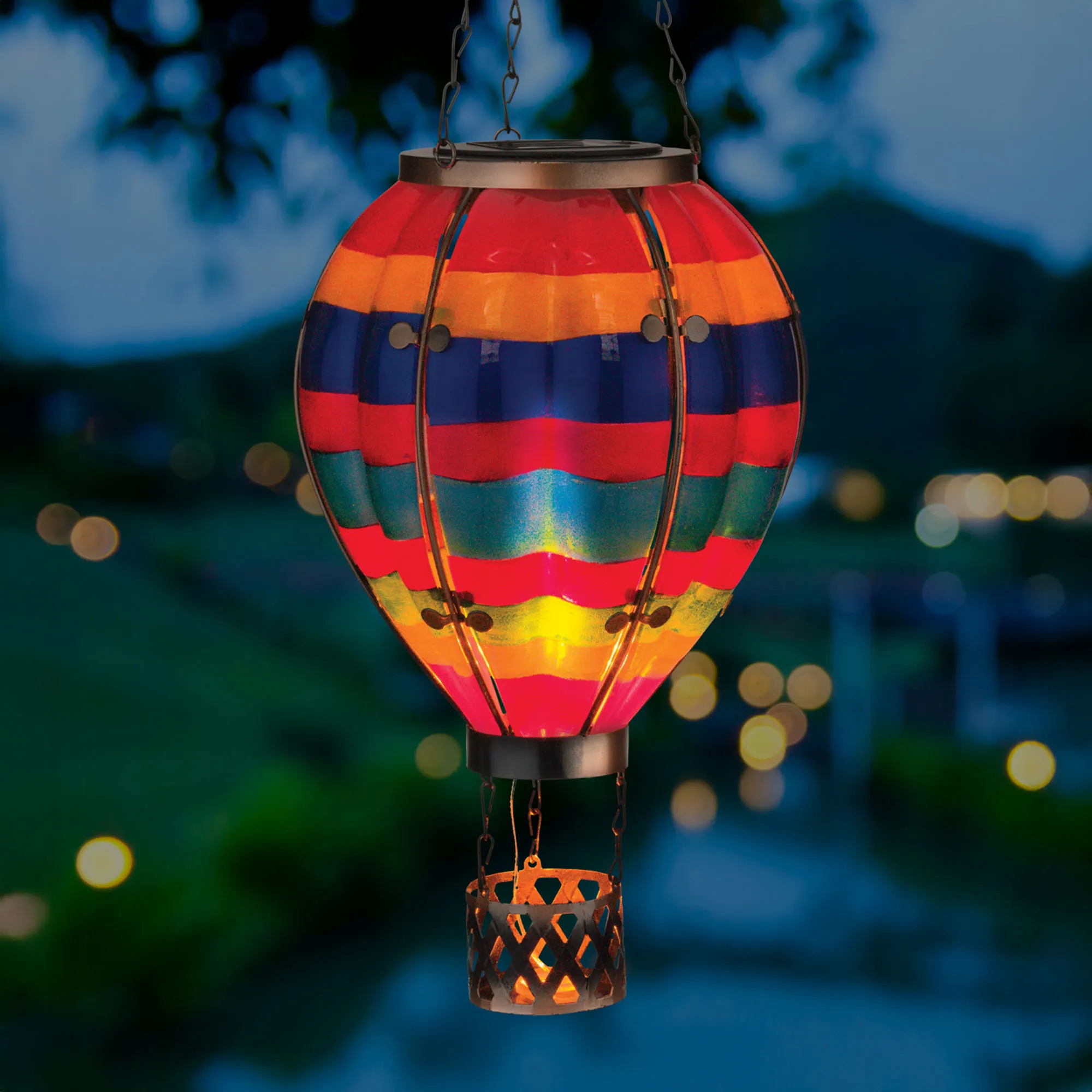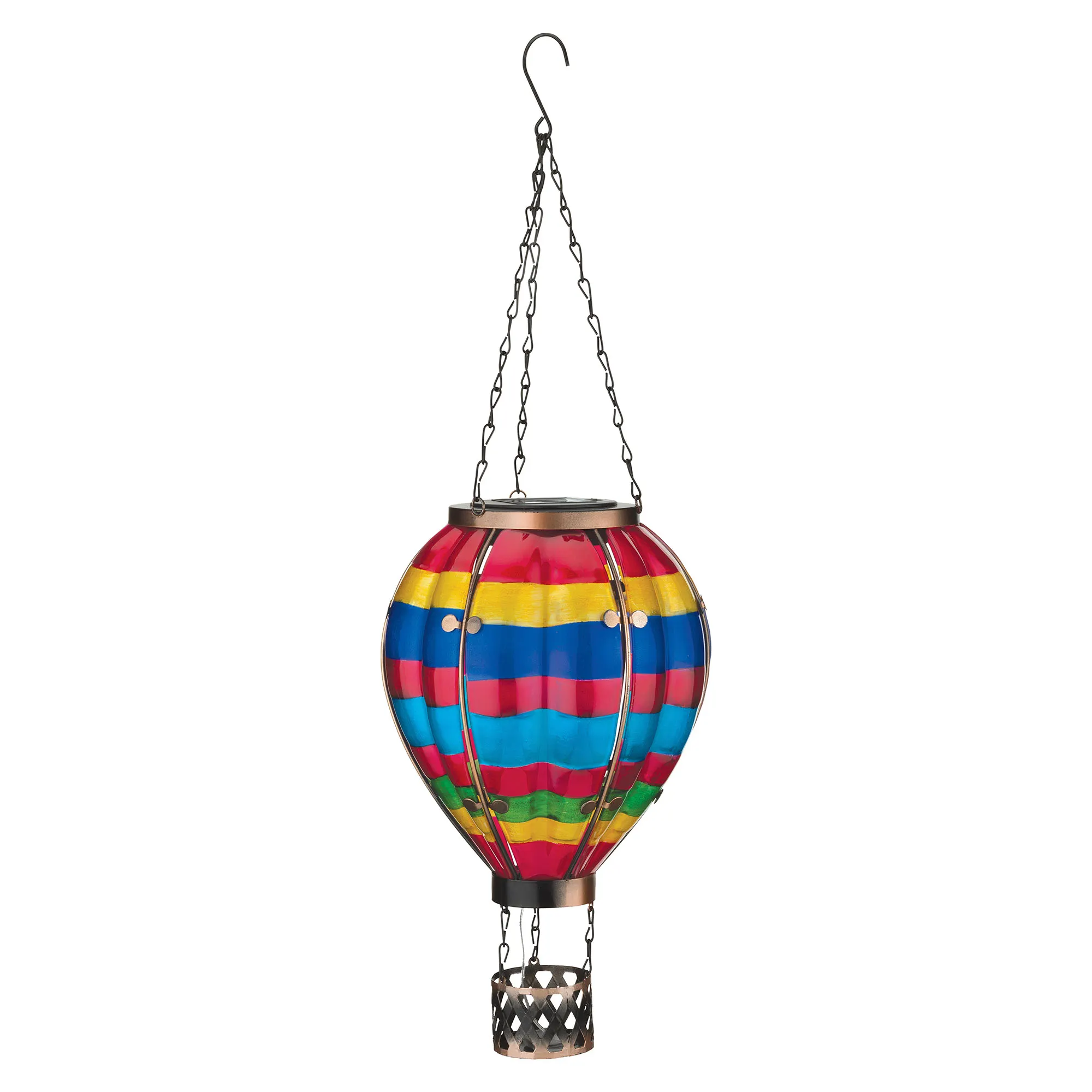 Let your style soar to new heights in your indoor or outdoor space year round with the Striped Hot Air Balloon Solar Lantern. Hanging from metal chains and the included hook, the lantern has beautifully handpainted glass in bright weather- and fade-resistant red, yellow, blue, and green stripes. Flickering LED solar lights mimic real flame and bring the brilliant design to life. Automatically illuminating at night for 6-8 continuous hours, the lantern operates via the waterproof solar panel and included, replaceable, rechargeable AA battery. Overall, the solar lighting design measures 7.5"dia.x23.5"H.