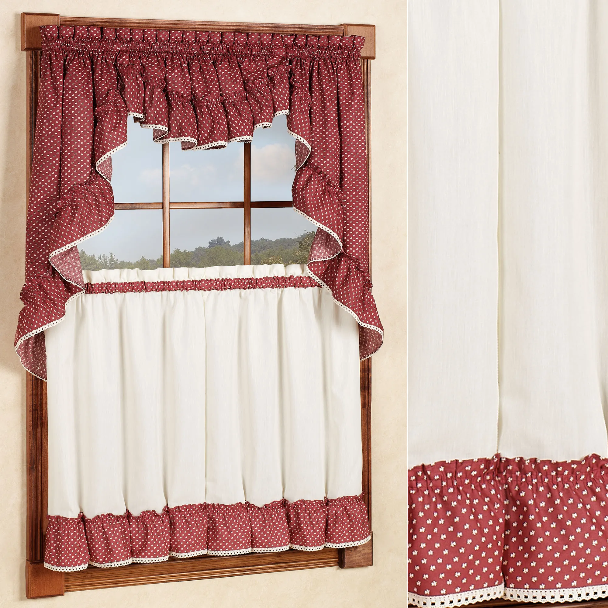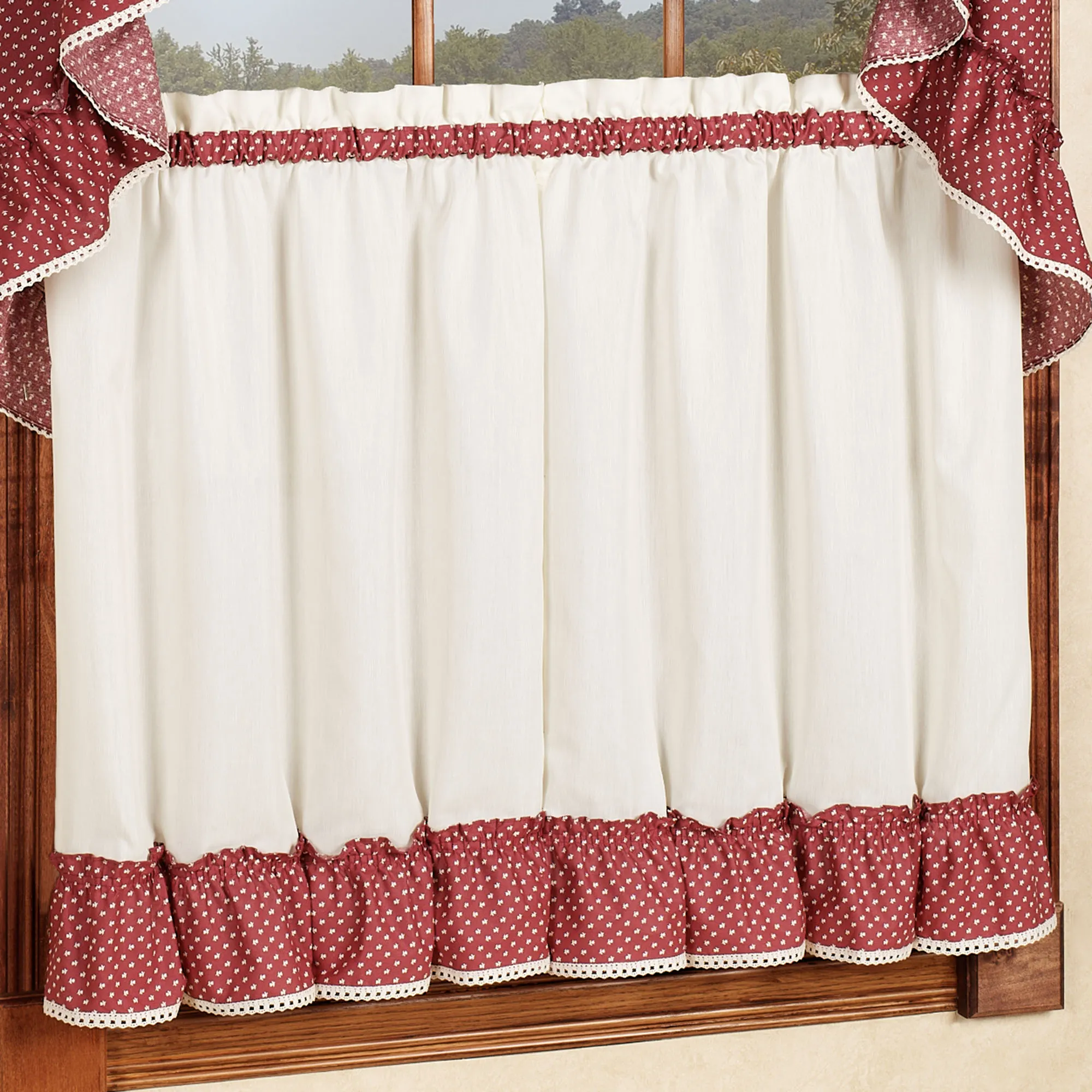 Specify Tier Pair, Ruffled Swag Valance Pair, or Ruffled Valance. Tier Pair is light cream with a ruffled border of mini florals and crochet at the bottom. Ruffled Swag Valance Pair has mini florals on solid. Ruffled Valance matches the swag pair.