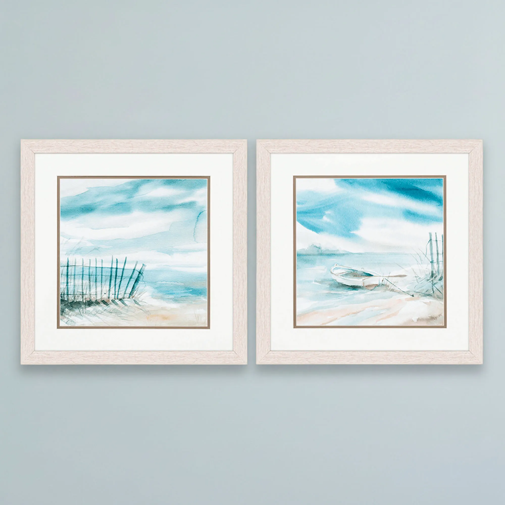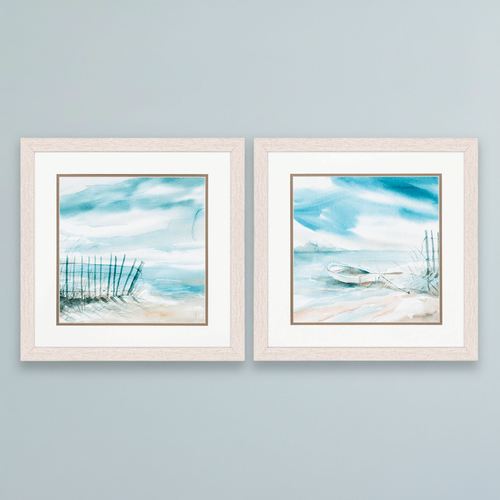 One can almost feel the Subtle Mist as the ocean's wave splashes onto the shore. Each print in this coastal wall art set, from a watercolor original by artist Carol Robinson, features a different beach scene. One has a fence on a sandy beach, and the other has a boat on the beach. Colors include shades of blue, beige, white, and sand. Prints are surrounded by a brown inner mat and a white outer mat. Polystyrene frames have glass inserts and a whitewash finish. Each measures 17"sq.x1"D. Set weighs 10 lbs. Imported/USA.