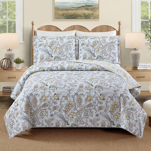 The Sugar Mill Peacock Bedding exudes a charming take on elegant nature. Designed by Spartina 449(R), the Mini Quilt Set includes a quilt and shams. The pure cotton bedding draws inspiration from natural beauty, depicting peacocks and various birds perched in wild flowering branches. Soft green, pear, blue, white, and black printed hues color the designs on the light blue ground. Scroll quilting adds a decorative touch to the lightweight ensemble, which is perfect for year-round use. Quilt and shams reverse to classic leafy designs in hues of green, pear, and light blue on ivory. Fill is cotton. Machine washable. Imported.